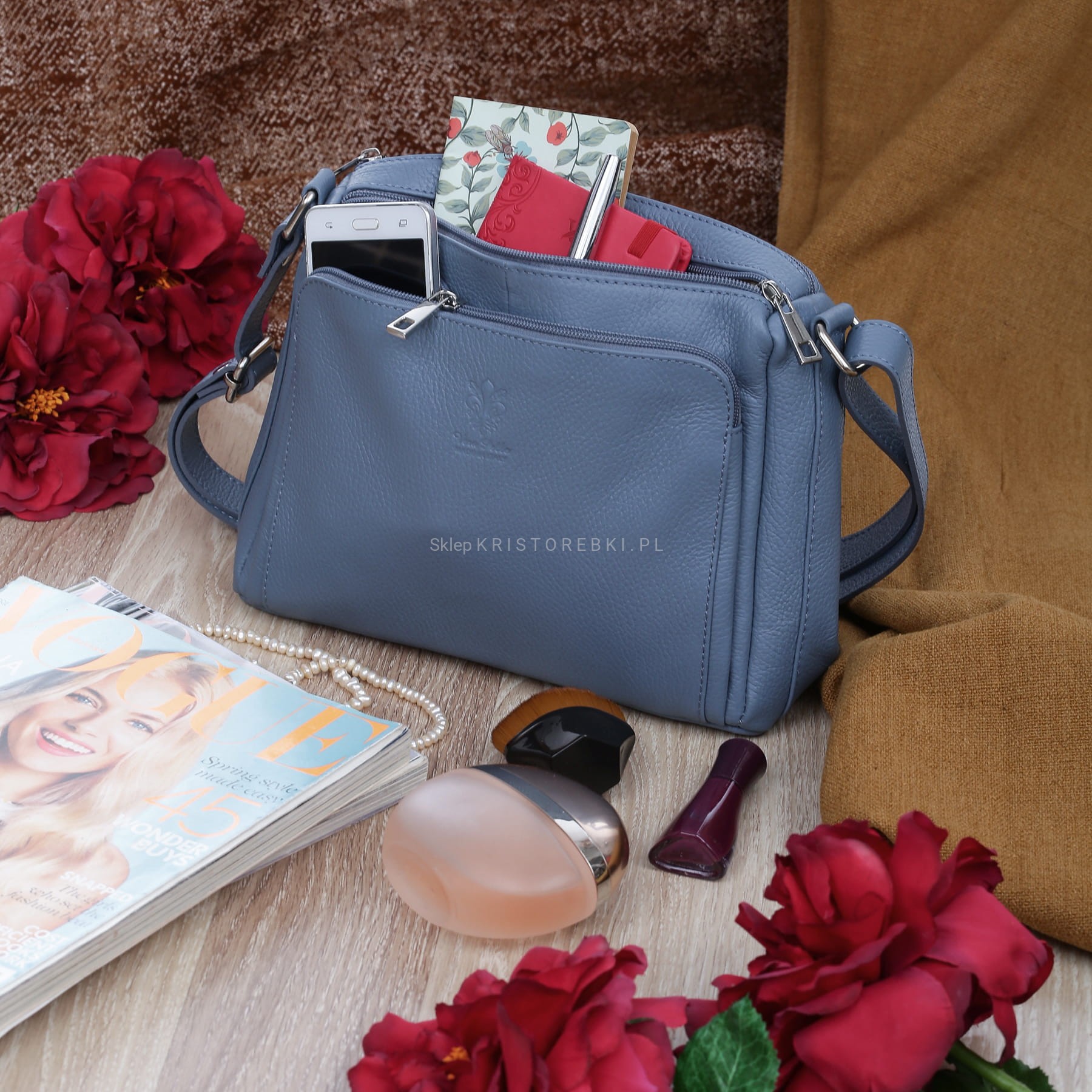Torebka damska listonoszka znanej i cenionej na rynku europejskim marki VERA PELLE ITALY w kolorze CIEMNEGO JEANSU. Wykonana została bardzo starannie z najwyższej jakości włoskiej skóry naturalnej z widoczną fakturą. Torebka posiada długi i regulowany pasek, dzięki czemu możesz ją wygodnie nosić na ramieniu i dopasować do własnych preferencji. Torebka posiada okucia w kolorze srebrnym i zamykana jest na dwa solidne suwaki. Dwukomorowy środek wykończony jest podszewką. Dodatkowo w środku jednej z komór znajduje się praktyczna kieszonka zamykana na suwak. Z przodu i z tyłu torebki znajdują się kolejne funkcjonalne duże kieszenie zamykane na suwak. Dzięki usztywnianemu dnu listonoszka nie straci swoich kształtów nawet przy niewielkim wypełnieniu. Klasyczna, stylowa a zarazem elegancka, sprawdzi się zarówno podczas oficjalnych, jak i codziennych wyjść.