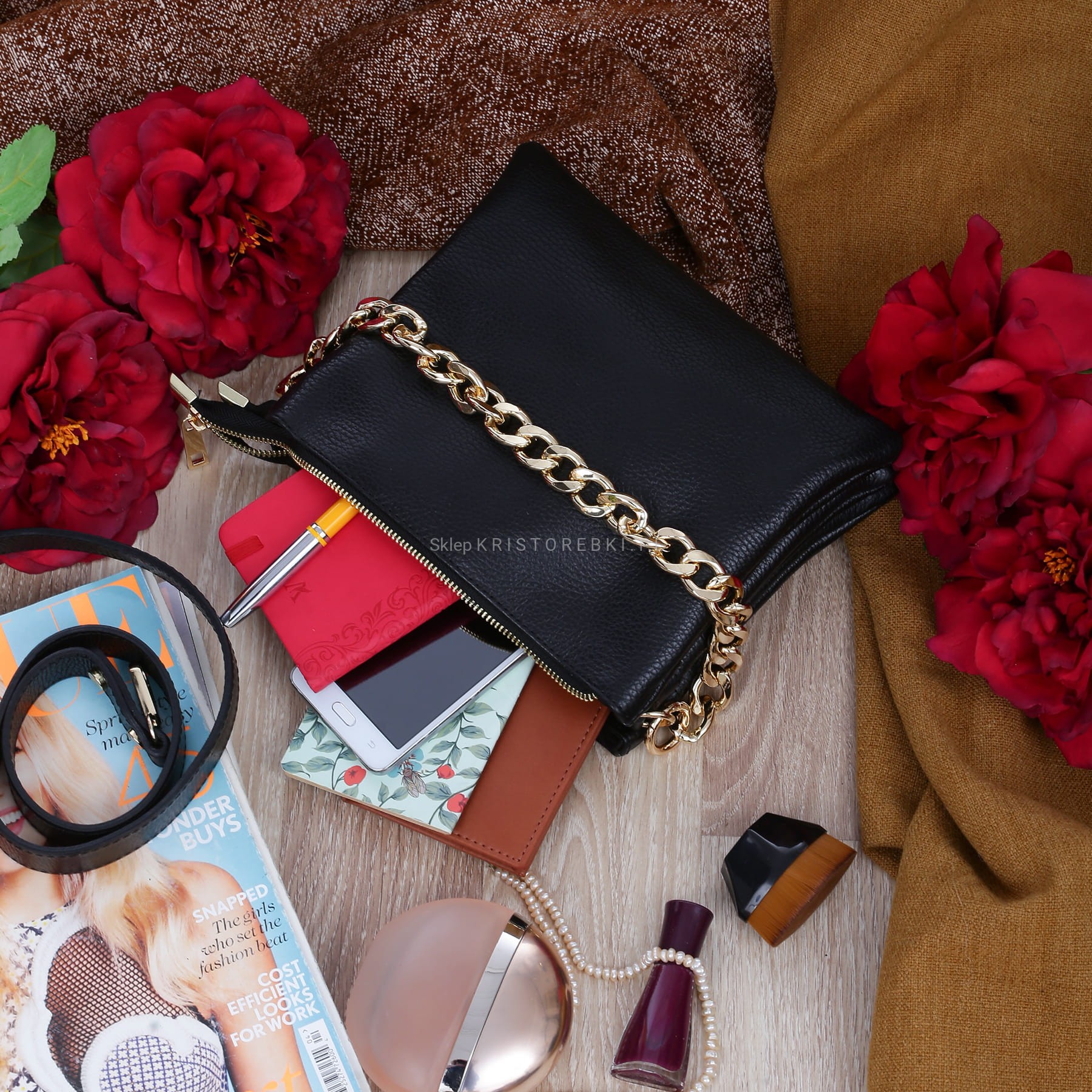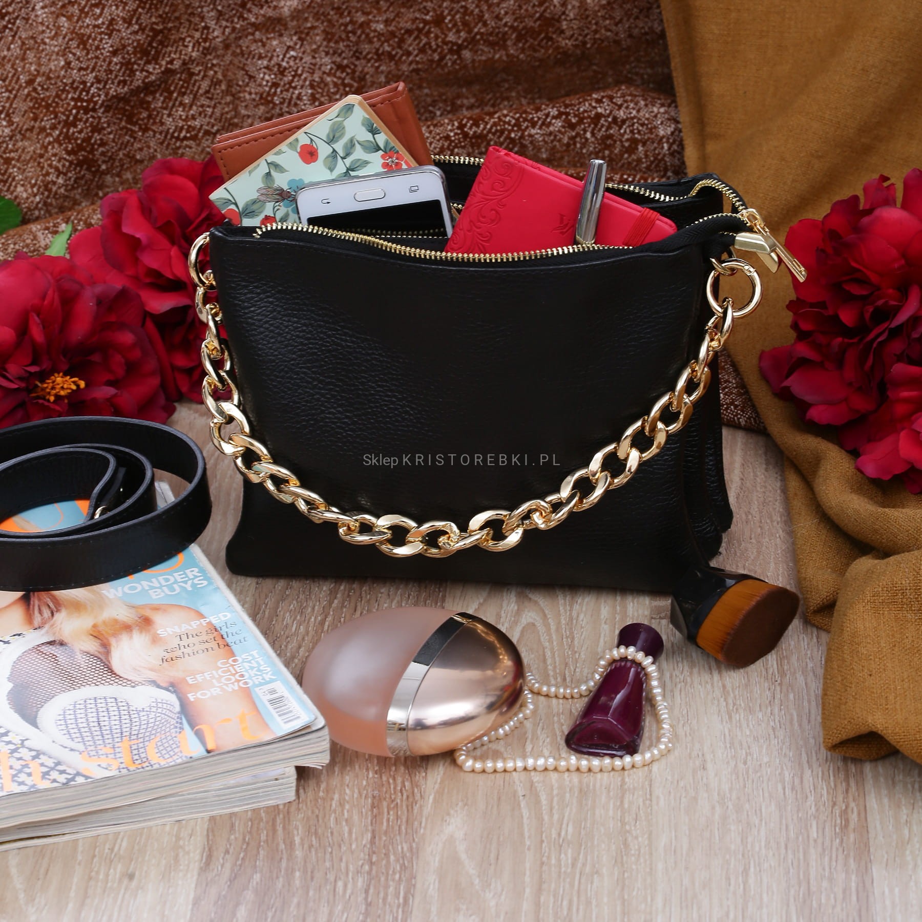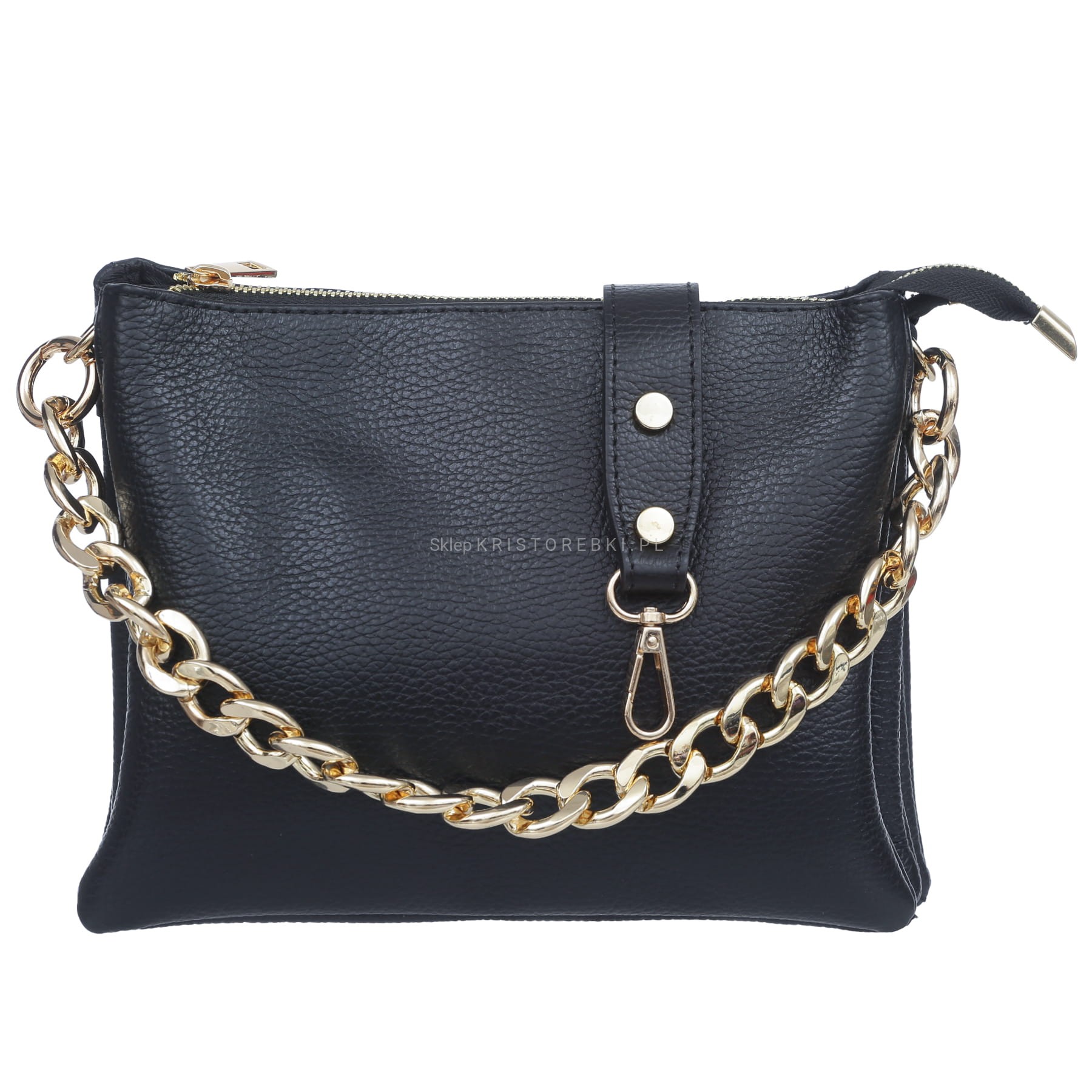VERA PELLE torebka damska skórzana listonoszka z łańcuchem i paskiem na ramię V536 czarna