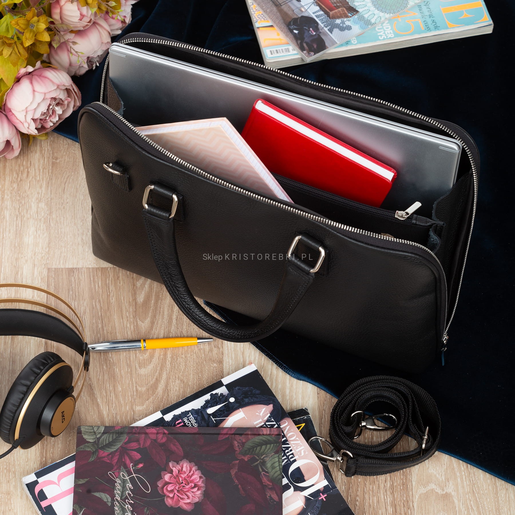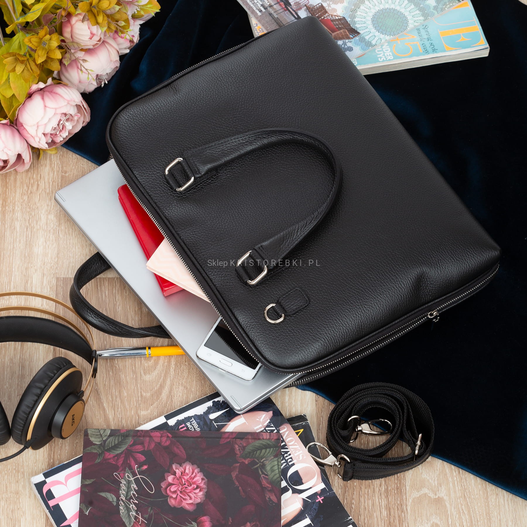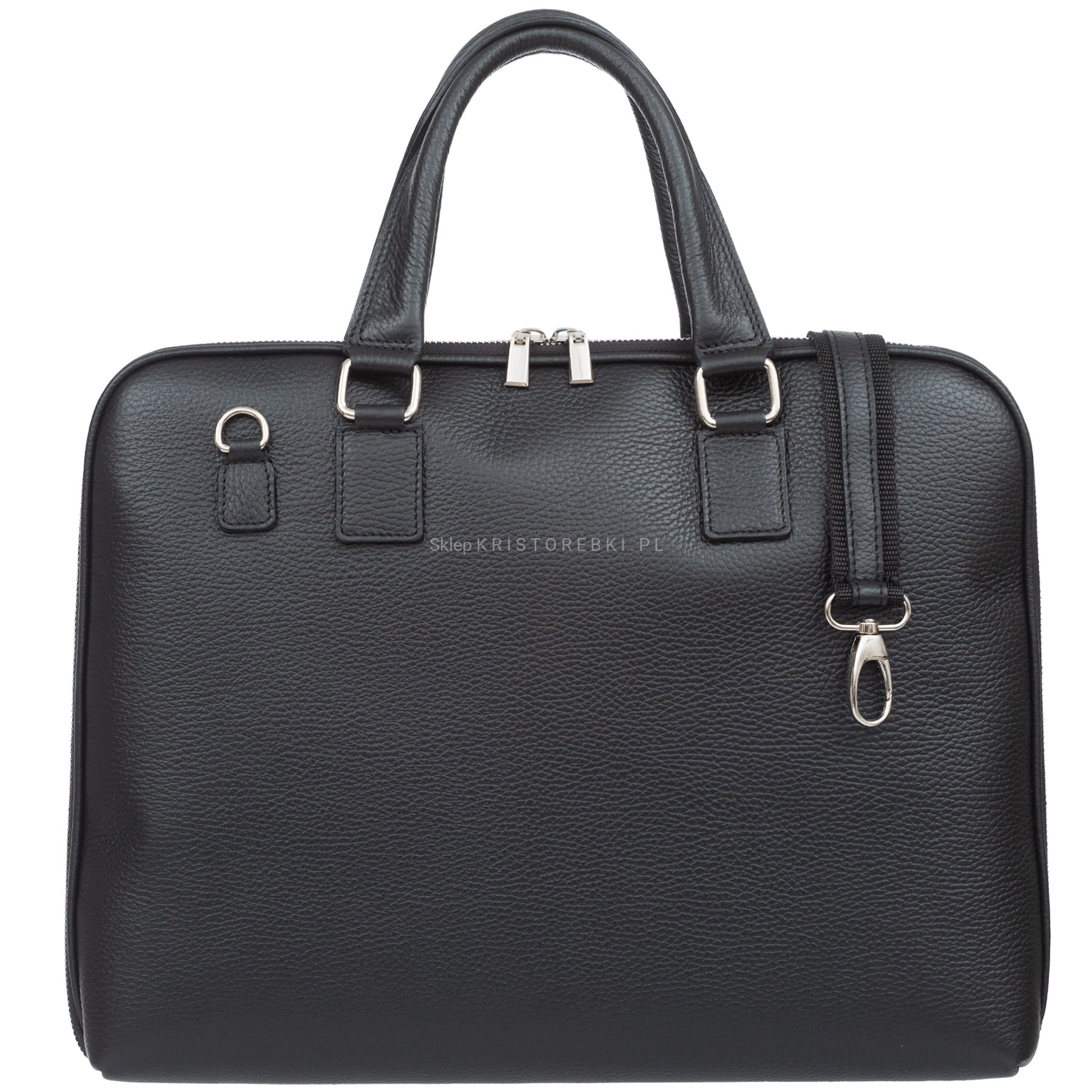 Torba skórzana w kształcie teczki, cenionej za jakość wykonania, włoskiej marki VERA PELLE ITALY w kolorze CZARNYM. Wykonana została ze skóry naturalnej z widoczną fakturą z dbałością o najdrobniejsze szczegóły. Dzięki dużym wymiarom bez trudu pomieści format A4, laptopa czy tablet. Torba posiada długie i praktyczne rączki do noszenia w ręku. Dołączony do torby długi i regulowany pasek pozwala ją nosić również wygodnie na ramieniu. Torba zamykana jest na suwak i posiada okucia w kolorze srebrnym. Środek torby wykończony jest solidną podszewką. W środku znajdują się dwie komory przedzielone przegrodą zamykaną na suwak. Dodatkowo w środku na jednej ze ścianek znajduje się praktyczna kieszonka zamykana na suwak a z drugiej strony znajdziesz dwie mniejsze otwarte kieszonki na dokumenty, drobiazgi lub telefon. Torba idealnie sprawdzi się w pracy i na spotkania biznesowe.