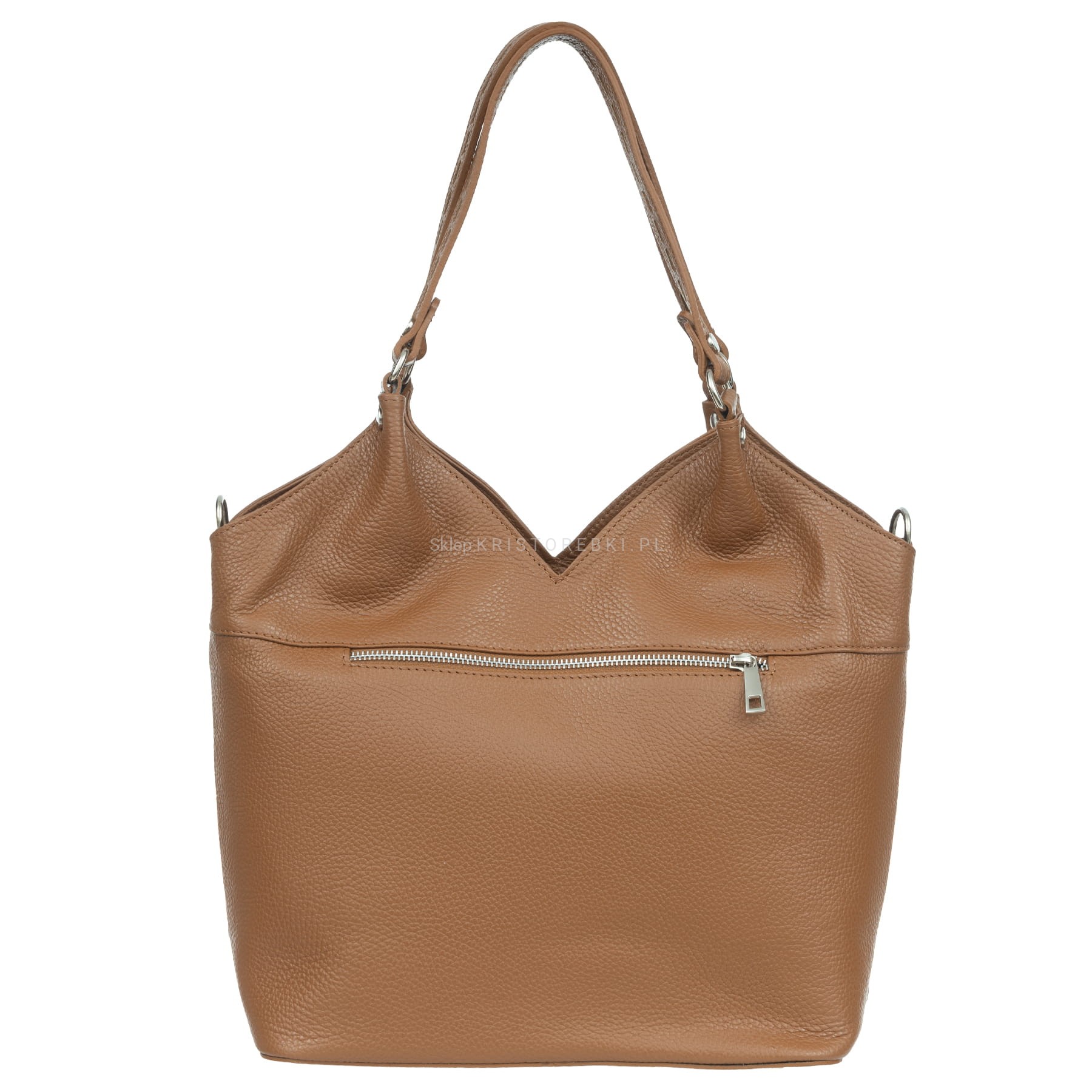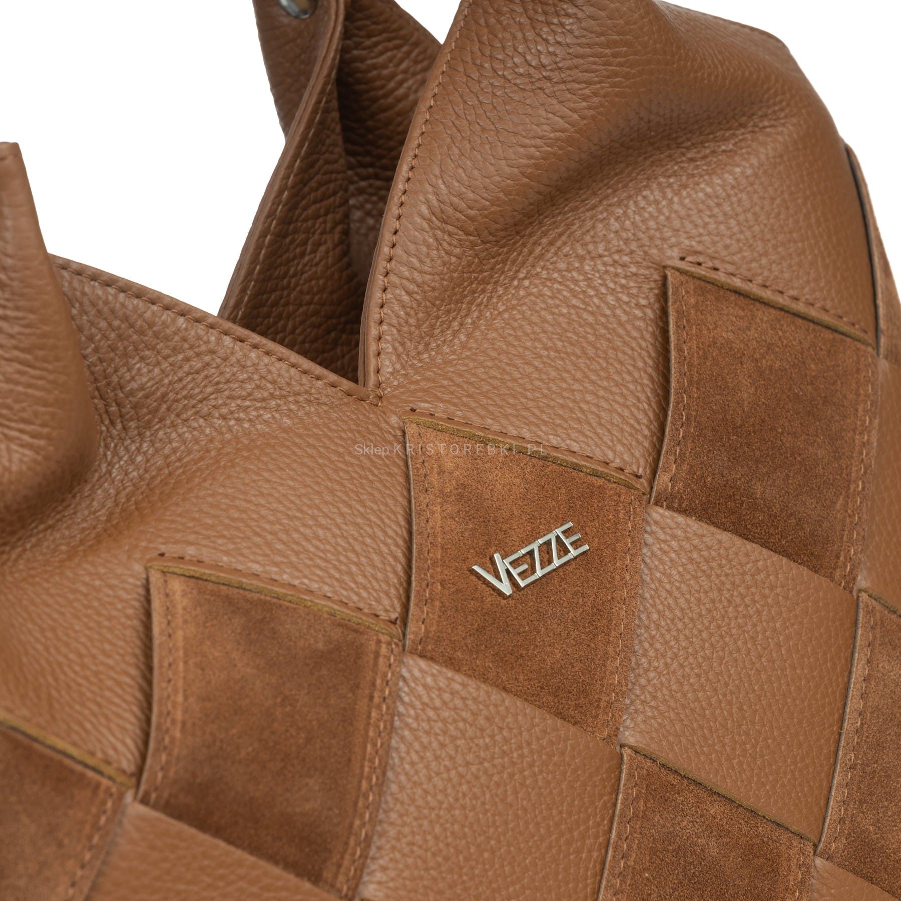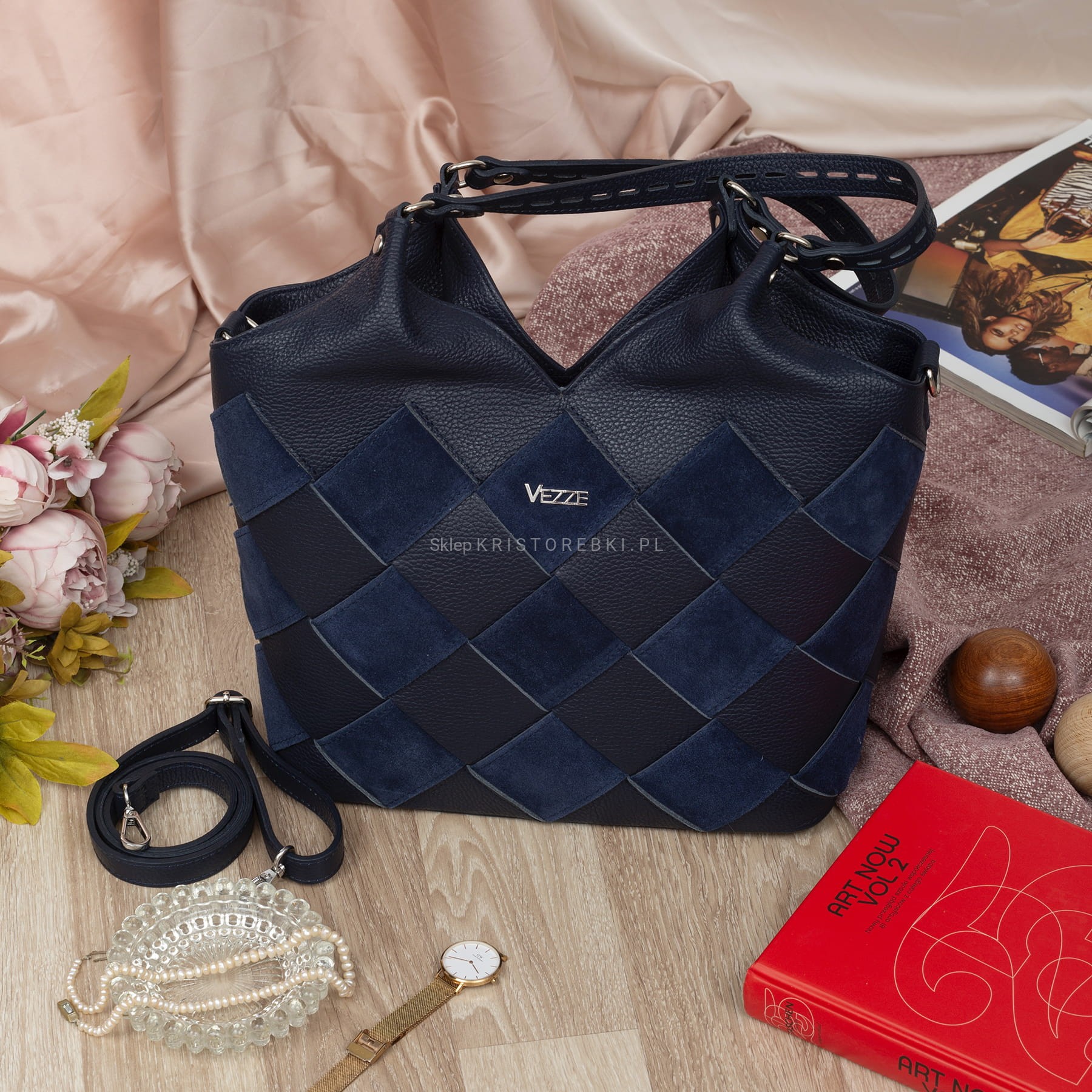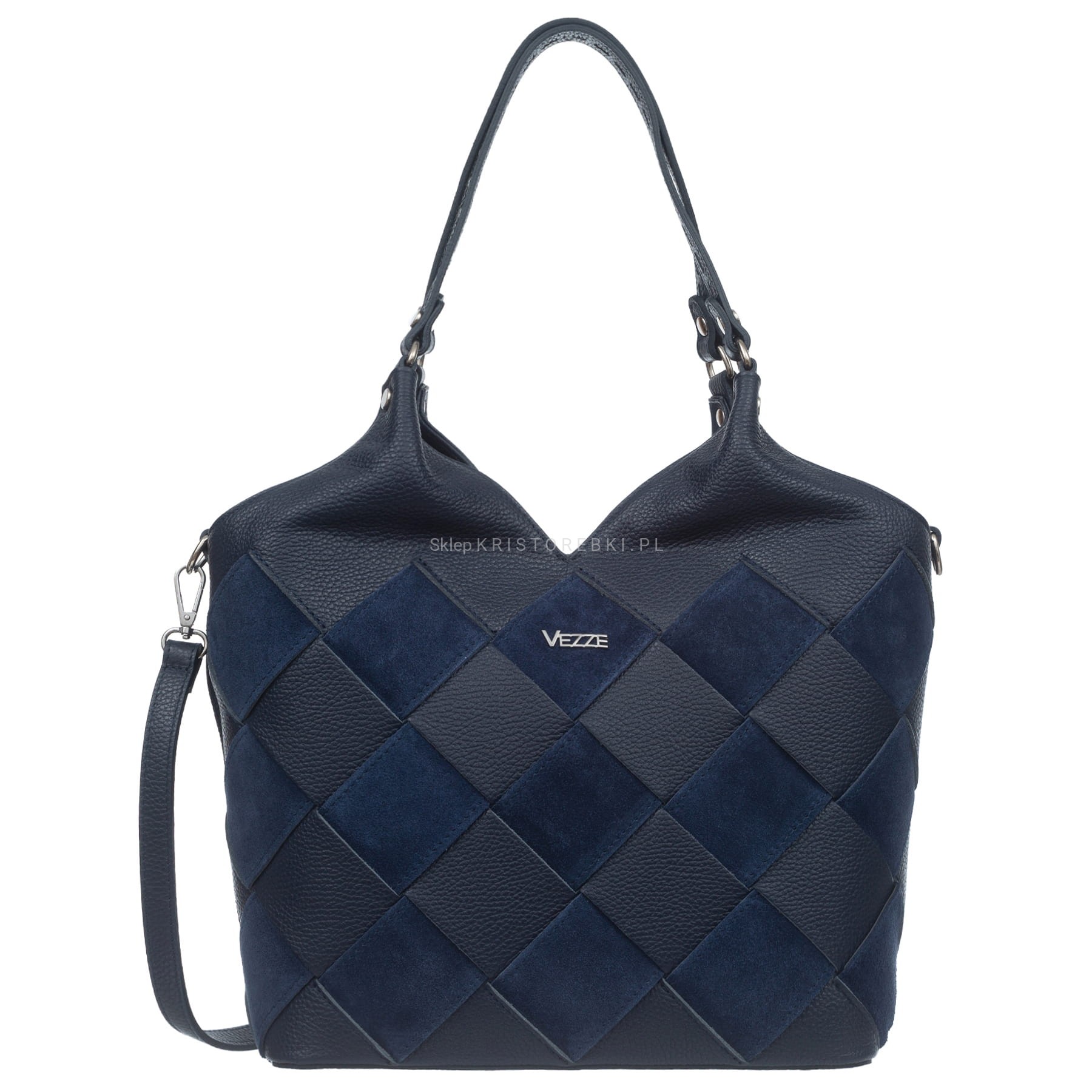 Duża torebka damska typu shopper znanej i cenionej na rynku europejskim marki VEZZE w kolorze GRANATOWYM. Uszyta została bardzo starannie z najwyższej jakości włoskiej skóry naturalnej z widoczną fakturą. Z przodu posiada przeplatany wzór skóry naturalnej z zamszem naturalnym. Torebka posiada długie rączki, dzięki czemu można ją wygodnie nosić w ręku i na ramieniu. Dodatkowo dołączony został odpinany pasek do wygodnego noszenia na ramieniu. Pasek jest regulowany, dzięki czemu bez trudu można go dopasować do własnych preferencji. Torebka posiada okucia w kolorze srebrnym i zamykana jest na solidny suwak. Dwukomorowy środek wykończony jest podszewką i przedzielony przez środek praktyczną przegrodą zamykaną na suwak. Dodatkowo w środku znajdziesz kieszonkę zamykaną na suwak oraz otwartą małą kieszonkę na telefon lub dokumenty. Przód torebki zdobi srebrne logo producenta a z tyłu znajduje się kolejna duża kieszeń zamykana na suwak. Spód torebki jest dodatkowo usztywniony i chronią go przed zarysowaniami nóżki ochronne. Torebka jest bardzo pojemna i praktyczna a przeplatany wzór nadaje jej niespotykanego wyglądu. Będzie pasować do większości codziennych i eleganckich stylizacji. Będzie również świetnym prezentem dla najbliższej Ci osoby.