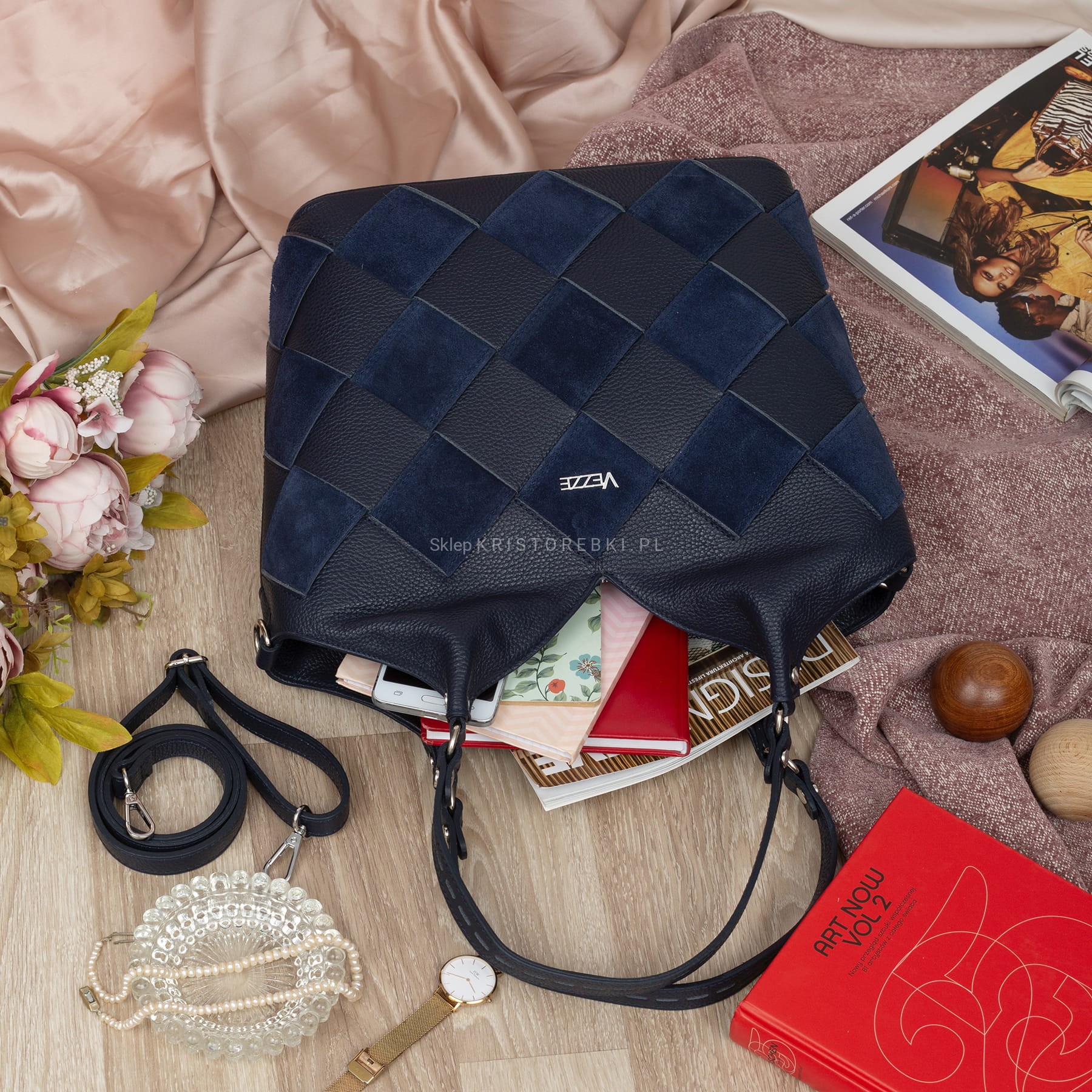 VEZZE torebka damska skórzana shopper pleciona z długimi rączkami na ramię V538 granatowa