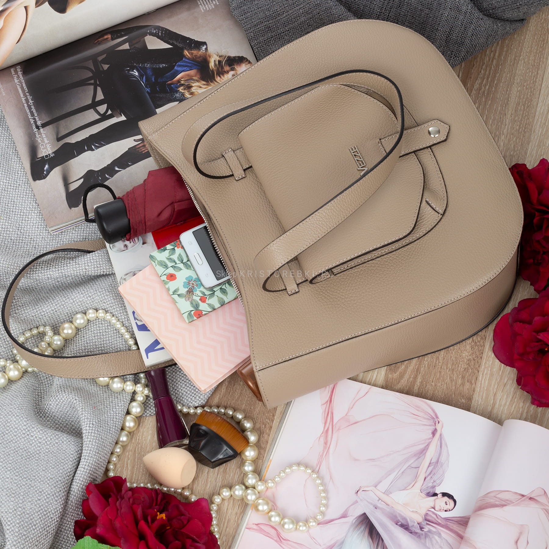 VEZZE torebka damska skórzana klasyczna z długimi rączkami na ramię V548 beżowa