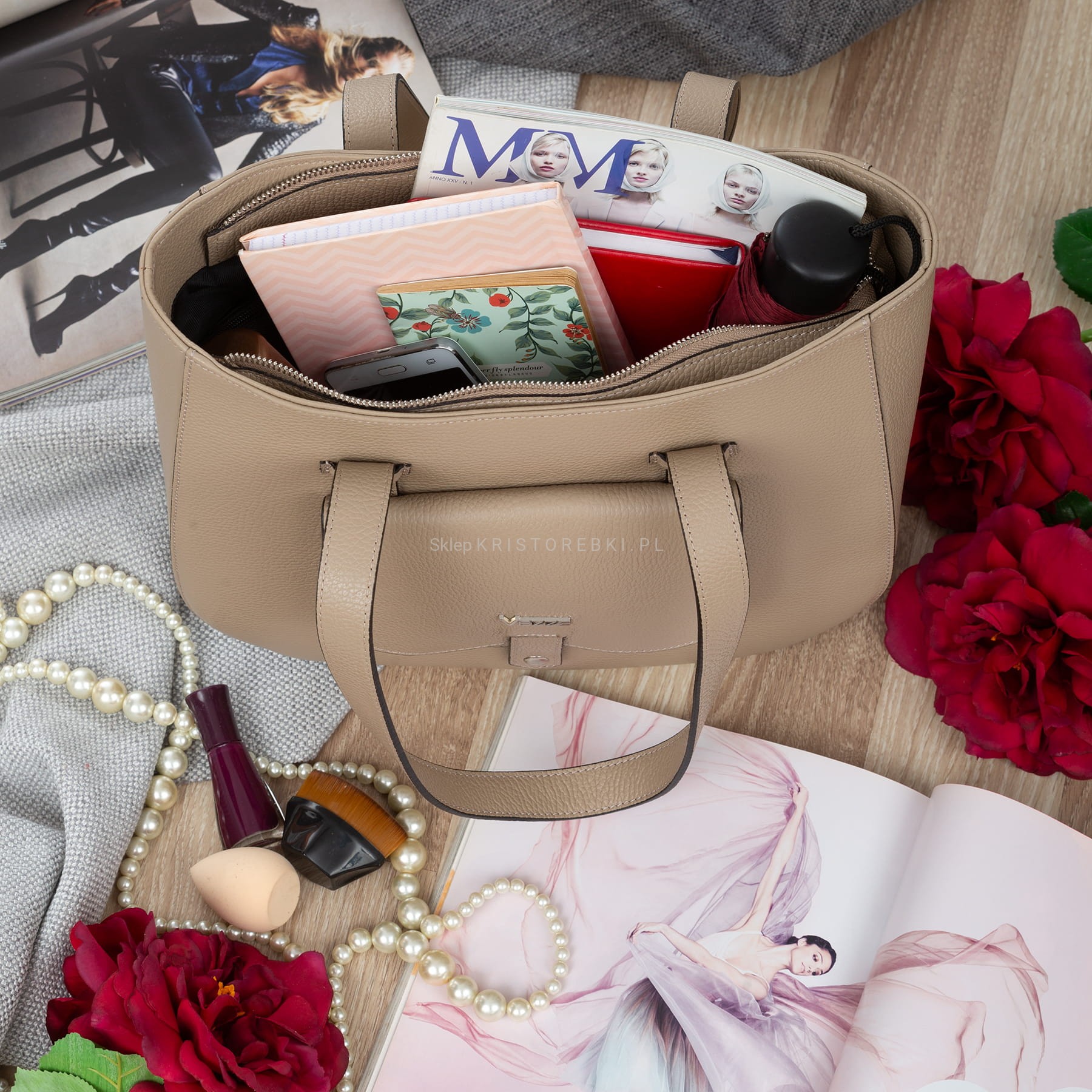 Klasyczna duża i sztywna torebka damska znanej i cenionej na rynku europejskim marki VEZZE w kolorze BEŻOWYM. Uszyta została bardzo starannie z najwyższej jakości grubej włoskiej skóry naturalnej z widoczną fakturą. Torebka posiada długie rączki, dzięki czemu można ją wygodnie nosić w ręku i na ramieniu. Torebka posiada okucia w kolorze srebrnym i zamykana jest na solidny suwak. Dwukomorowy środek wykończony jest podszewką oraz przedzielony przez środek przegrodą zamykaną na suwak. Dodatkowo w środku znajdziesz praktyczną kieszonkę zamykaną na suwak oraz otwartą kieszonkę na telefon lub dokumenty. Z przodu torebki znajduje się kolejna praktyczna kieszeń zamykana na magnesik a spód jest dodatkowo usztywniony. Torebka jest bardzo elegancka, praktyczna i wygodna w codziennym użytkowaniu. Będzie pięknie pasować do większości codziennych i wyjściowych stylizacji.