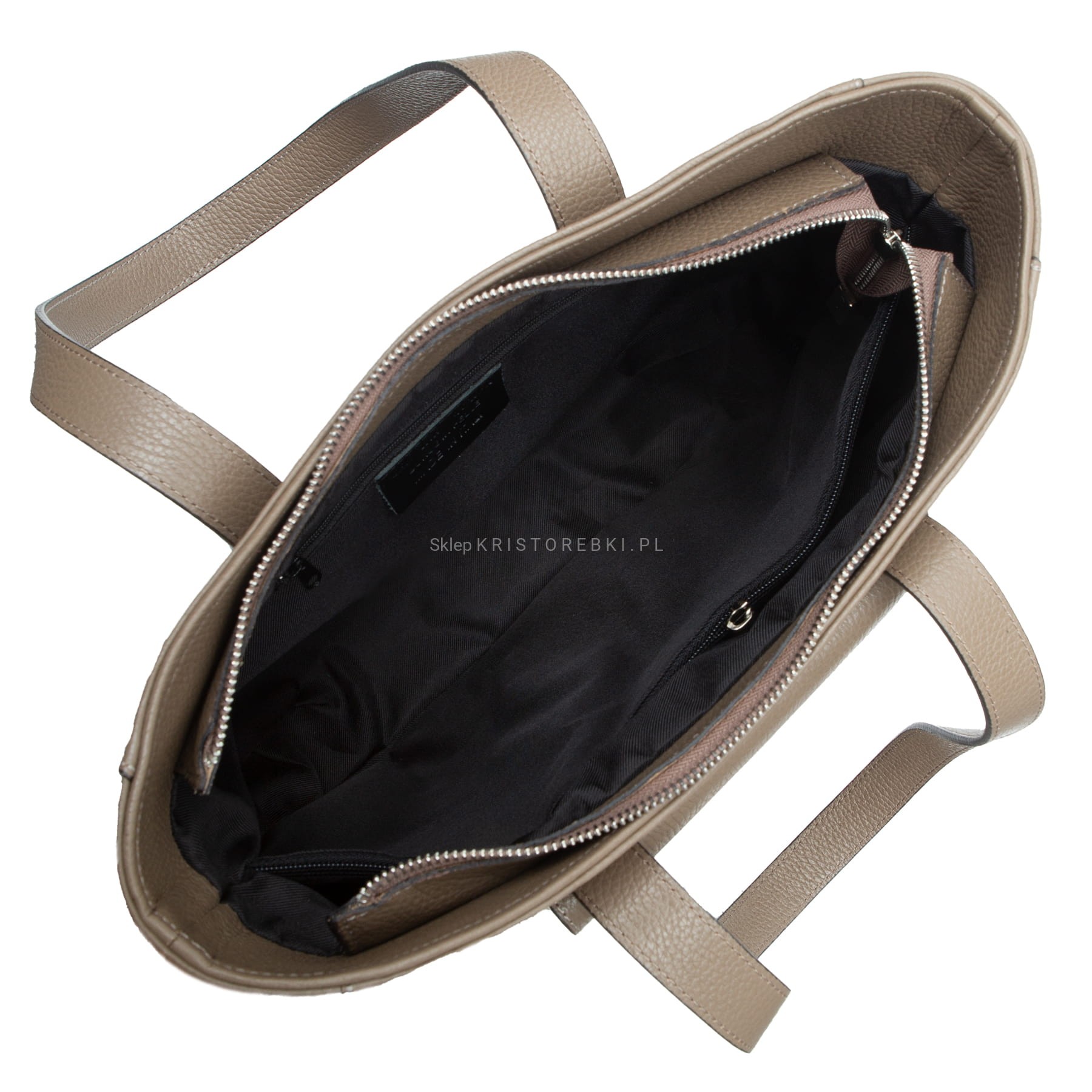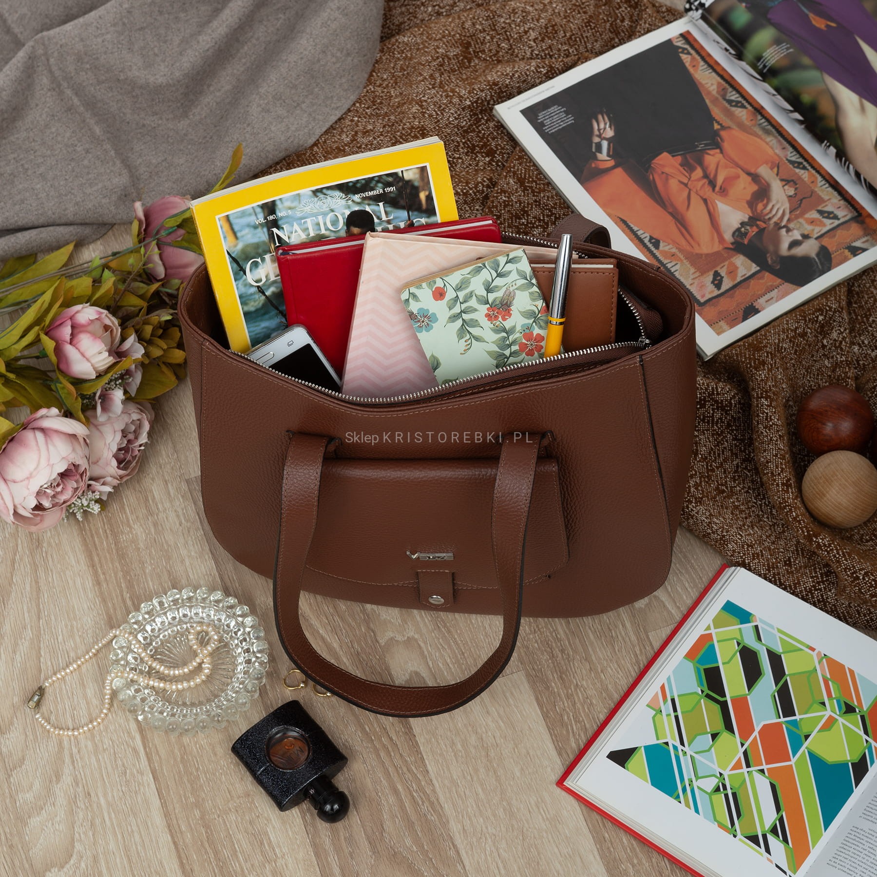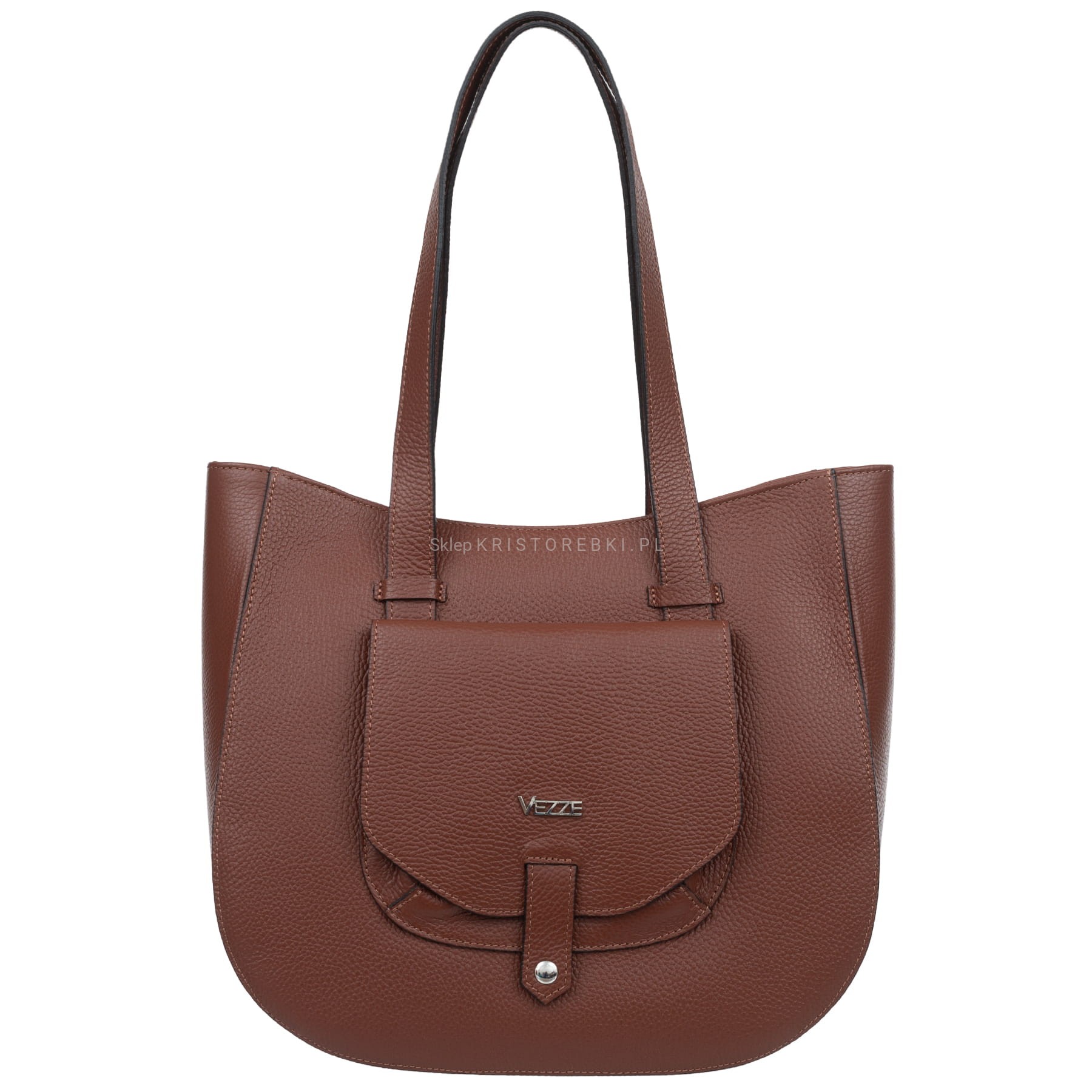 Klasyczna duża i sztywna torebka damska znanej i cenionej na rynku europejskim marki VEZZE w kolorze KONIAKOWEGO BRĄZU. Uszyta została bardzo starannie z najwyższej jakości grubej włoskiej skóry naturalnej z widoczną fakturą. Torebka posiada długie rączki, dzięki czemu można ją wygodnie nosić w ręku i na ramieniu. Torebka posiada okucia w kolorze srebrnym i zamykana jest na solidny suwak. Dwukomorowy środek wykończony jest podszewką oraz przedzielony przez środek przegrodą zamykaną na suwak. Dodatkowo w środku znajdziesz praktyczną kieszonkę zamykaną na suwak oraz otwartą kieszonkę na telefon lub dokumenty. Z przodu torebki znajduje się kolejna praktyczna kieszeń zamykana na magnesik a spód jest dodatkowo usztywniony. Torebka jest bardzo elegancka, praktyczna i wygodna w codziennym użytkowaniu. Będzie pięknie pasować do większości codziennych i wyjściowych stylizacji.