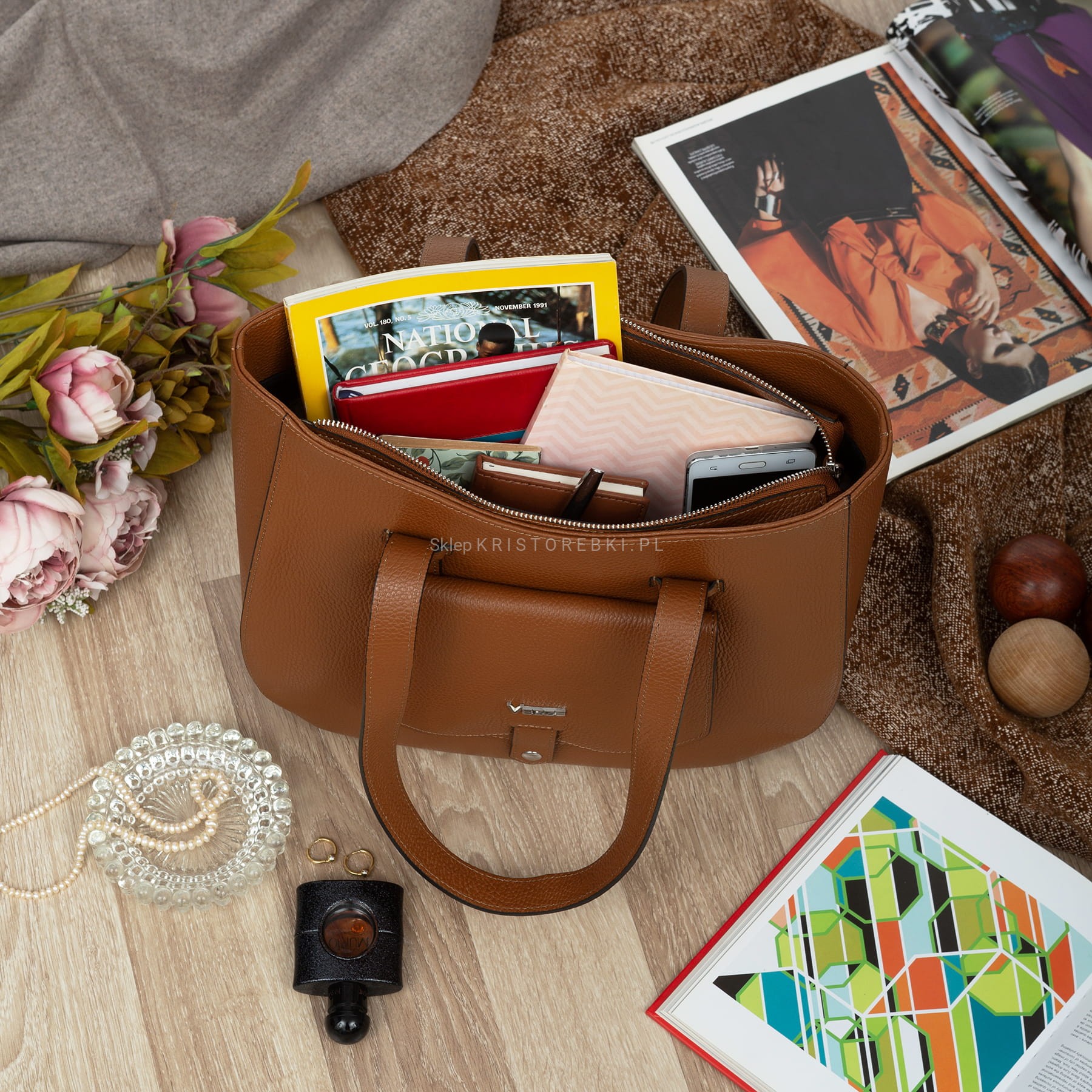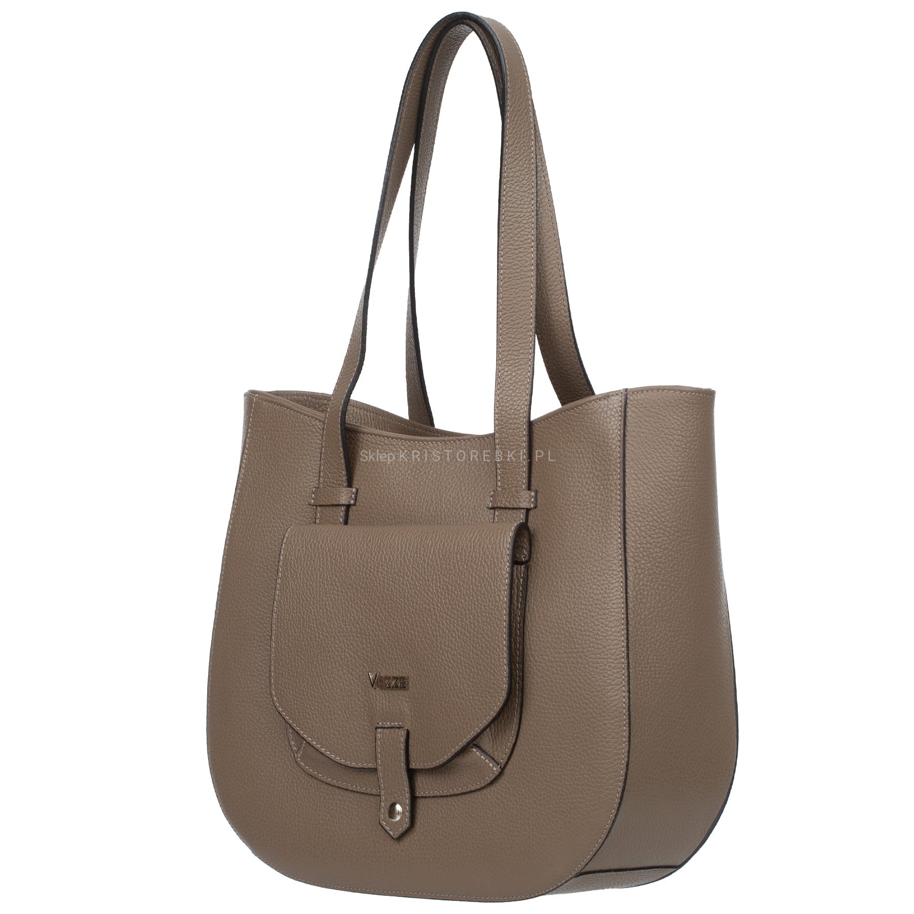 Klasyczna duża i sztywna torebka damska znanej i cenionej na rynku europejskim marki VEZZE w kolorze CAMEL. Uszyta została bardzo starannie z najwyższej jakości grubej włoskiej skóry naturalnej z widoczną fakturą. Torebka posiada długie rączki, dzięki czemu można ją wygodnie nosić w ręku i na ramieniu. Torebka posiada okucia w kolorze srebrnym i zamykana jest na solidny suwak. Dwukomorowy środek wykończony jest podszewką oraz przedzielony przez środek przegrodą zamykaną na suwak. Dodatkowo w środku znajdziesz praktyczną kieszonkę zamykaną na suwak oraz otwartą kieszonkę na telefon lub dokumenty. Z przodu torebki znajduje się kolejna praktyczna kieszeń zamykana na magnesik a spód jest dodatkowo usztywniony. Torebka jest bardzo elegancka, praktyczna i wygodna w codziennym użytkowaniu. Będzie pięknie pasować do większości codziennych i wyjściowych stylizacji.