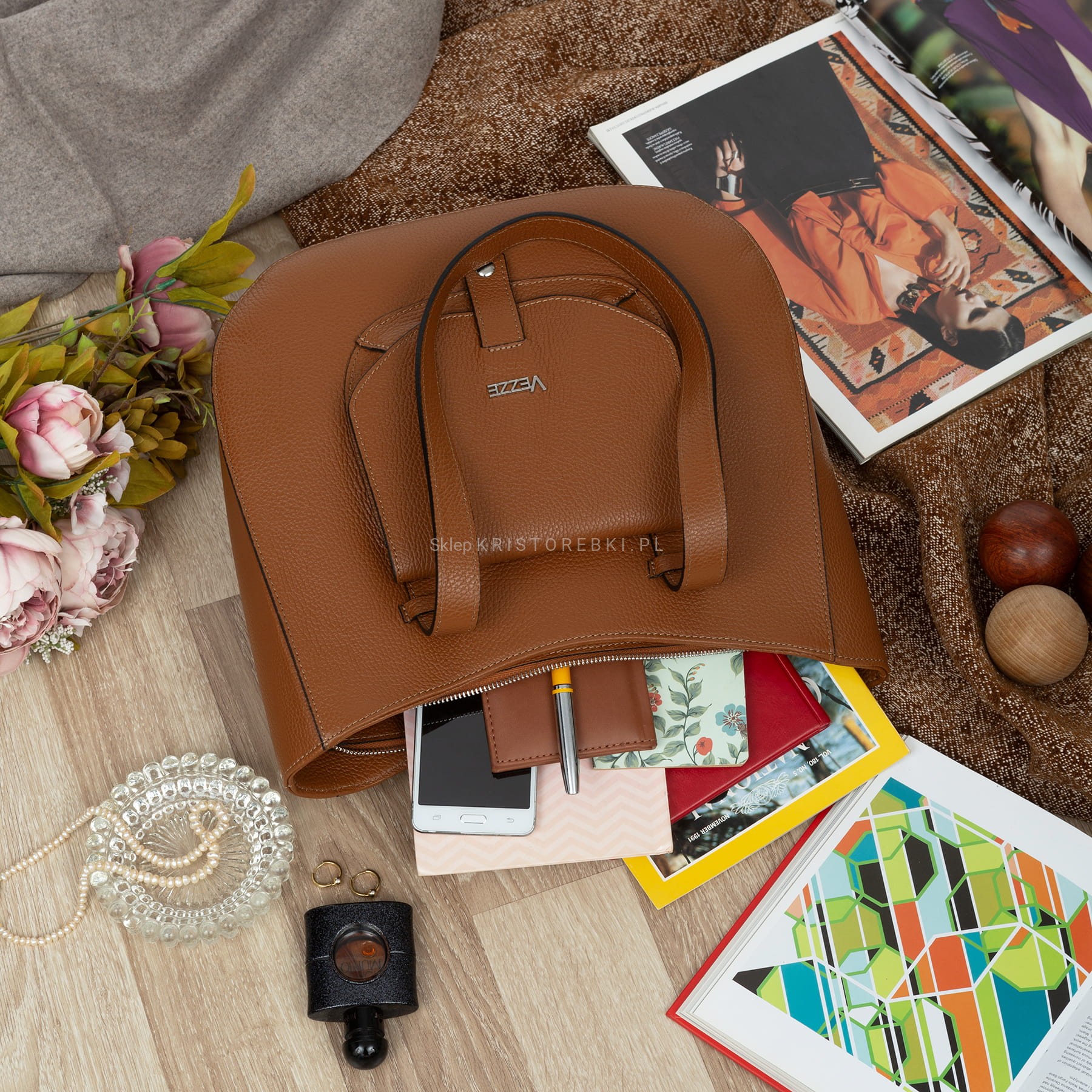 VEZZE torebka damska skórzana klasyczna z długimi rączkami na ramię V548 camel