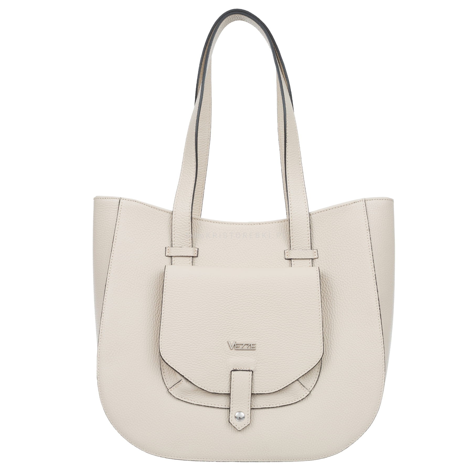 Klasyczna duża i sztywna torebka damska znanej i cenionej na rynku europejskim marki VEZZE w kolorze KREMOWYM. Uszyta została bardzo starannie z najwyższej jakości grubej włoskiej skóry naturalnej z widoczną fakturą. Torebka posiada długie rączki, dzięki czemu można ją wygodnie nosić w ręku i na ramieniu. Torebka posiada okucia w kolorze srebrnym i zamykana jest na solidny suwak. Dwukomorowy środek wykończony jest podszewką oraz przedzielony przez środek przegrodą zamykaną na suwak. Dodatkowo w środku znajdziesz praktyczną kieszonkę zamykaną na suwak oraz otwartą kieszonkę na telefon lub dokumenty. Z przodu torebki znajduje się kolejna praktyczna kieszeń zamykana na magnesik a spód jest dodatkowo usztywniony. Torebka jest bardzo elegancka, praktyczna i wygodna w codziennym użytkowaniu. Będzie pięknie pasować do większości codziennych i wyjściowych stylizacji.