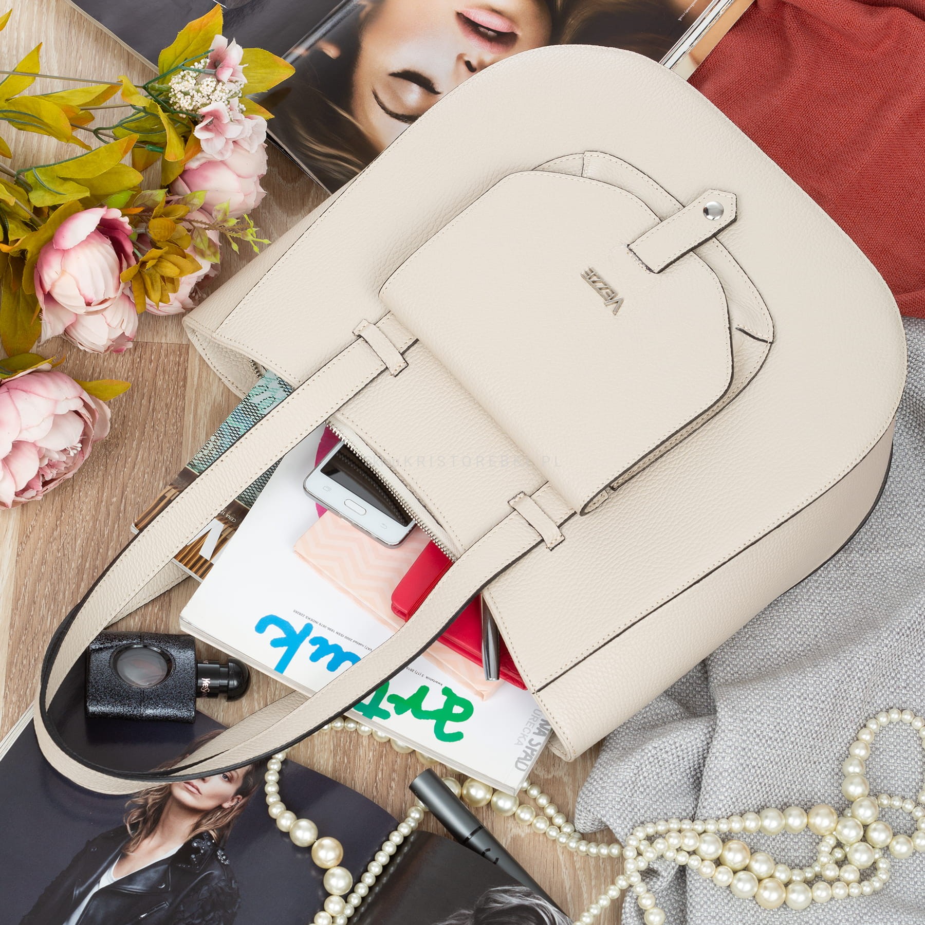 VEZZE torebka damska skórzana klasyczna z długimi rączkami na ramię V548 kremowa