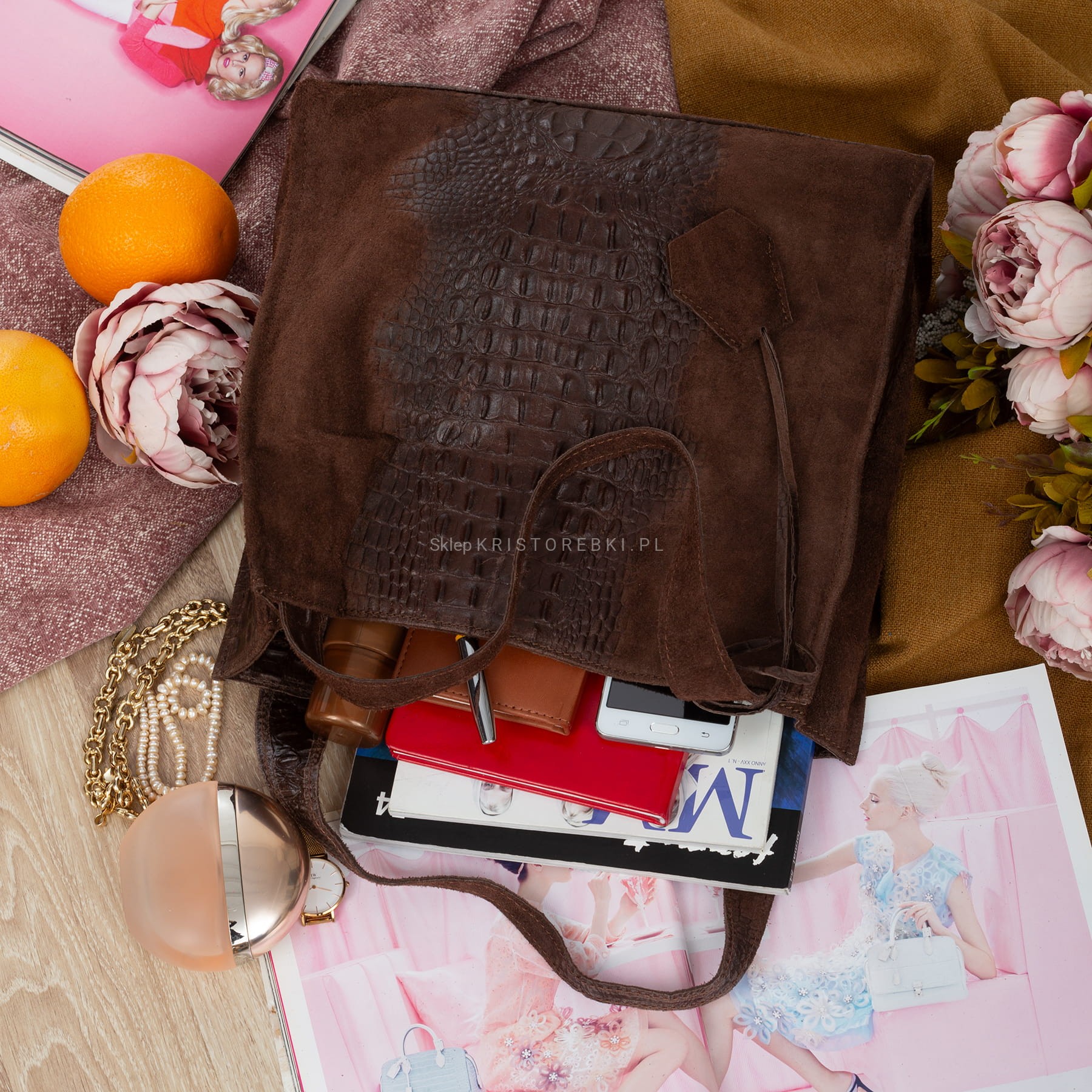 Włoska zamszowa torebka typu shopper znanej i cenionej na rynku europejskim marki VERA PELLE ITALY w kolorze CIEMNEGO CZEKOLADOWEGO BRĄZU. Wykonana została z wysoko gatunkowej, przyjemnie pachnącej i miłej w dotyku skóry naturalnej zamszowej z wytłoczonym wzorem. Torebka posiada długie rączki, dzięki czemu można ją wygodnie nosić w ręku i na ramieniu. Jest bardzo praktyczna i pojemna, dzięki czemu bez trudu pomieści format A4. Zamykana jest na suwak i posiada srebrne okucia. W środku wykończona jest podszewką oraz posiada na bocznej ściance dużą przegrodę zamykaną na suwak. Dodatkowo w środku znajduje się zamykana kieszonka na drobiazgi oraz dodatkowa otwarta kieszonka na telefon lub dokumenty. Z tyłu torebki znajduje się dodatkowa funkcjonalna kieszeń zamykana na suwak a przodu posiada zdejmowany, ozdobny brelok zawieszkę. Torebka będzie świetnym dodatkiem do codziennych i wyjściowych stylizacji.