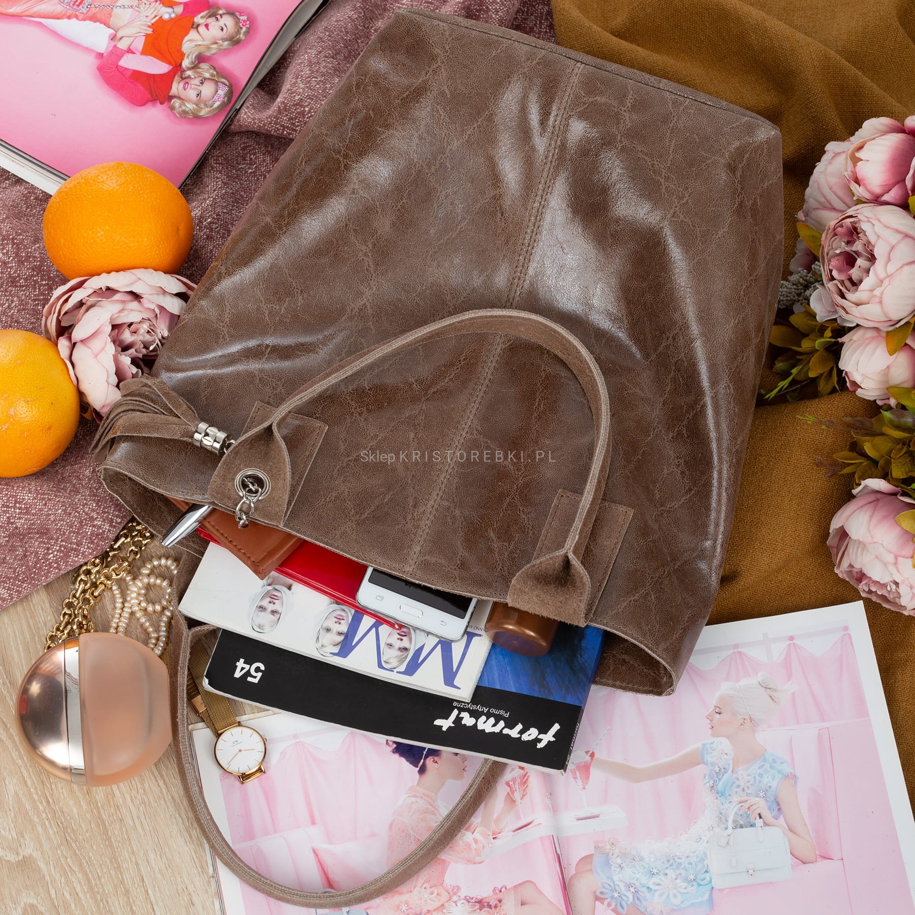 Torebka damska typu shopper znanej i cenionej na rynku europejskim marki VERA PELLE ITALY w kolorze TAUPE. Uszyta została bardzo starannie z najwyższej jakości lakierowanej i pachnącej skóry naturalnej. Torebka posiada bardzo modny i ponadczasowy marmurkowy wzór oraz długie uszy, dzięki czemu możesz ją wygodnie nosić w ręku jak również na ramieniu. Posiada srebrne okucia i zamykana jest na solidny suwak. Jednokomorowy środek wykończony jest podszewką a na ściance bocznej znajduje się praktyczna kieszonka zamykana na suwak na telefon, klucze lub dokumenty. Dodatkowo do torebki dołączona została przyczepiona na łańcuszku saszetka zamykana na suwak i ozdobny breloczek z frędzelkiem. Torebka jest bardzo pojemna i praktyczna. Będzie świetnym dodatkiem do każdej codziennej stylizacji.