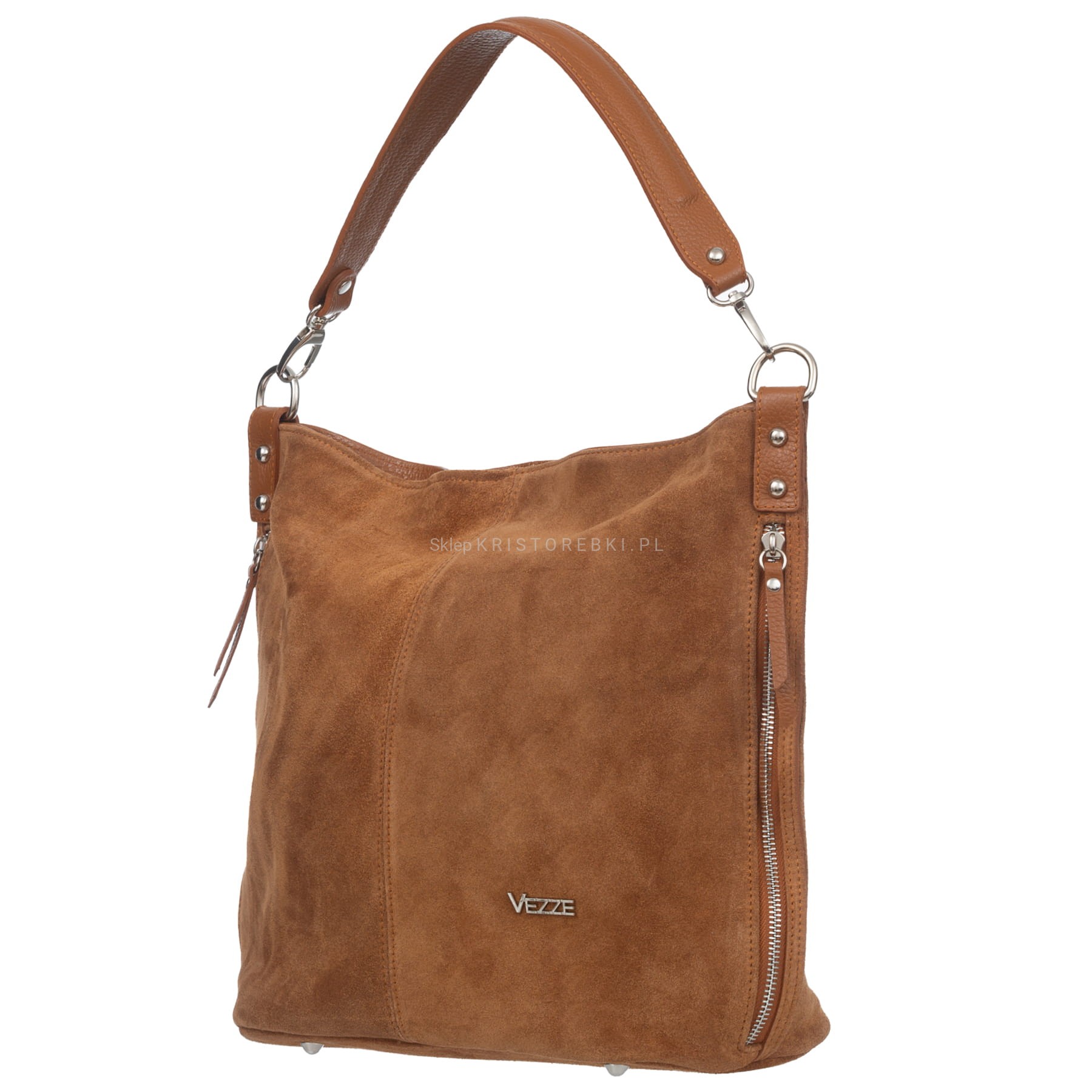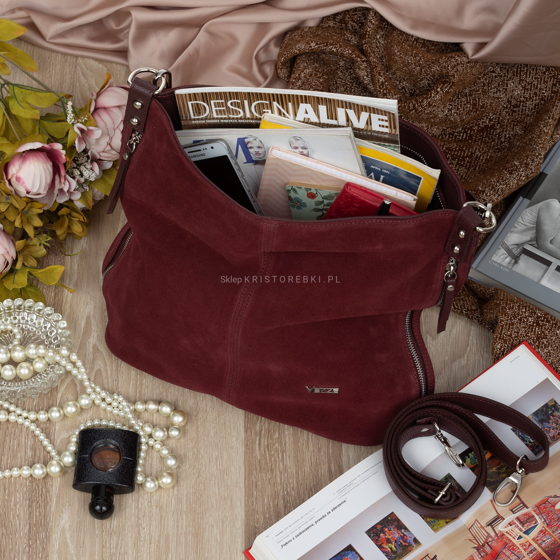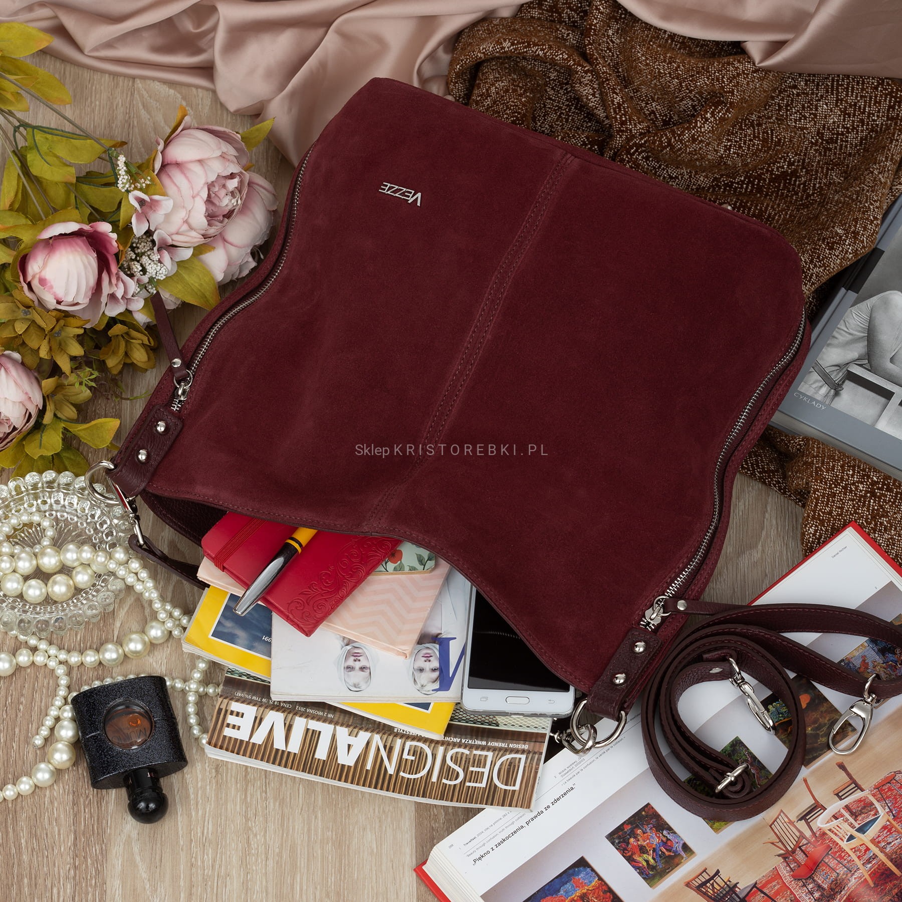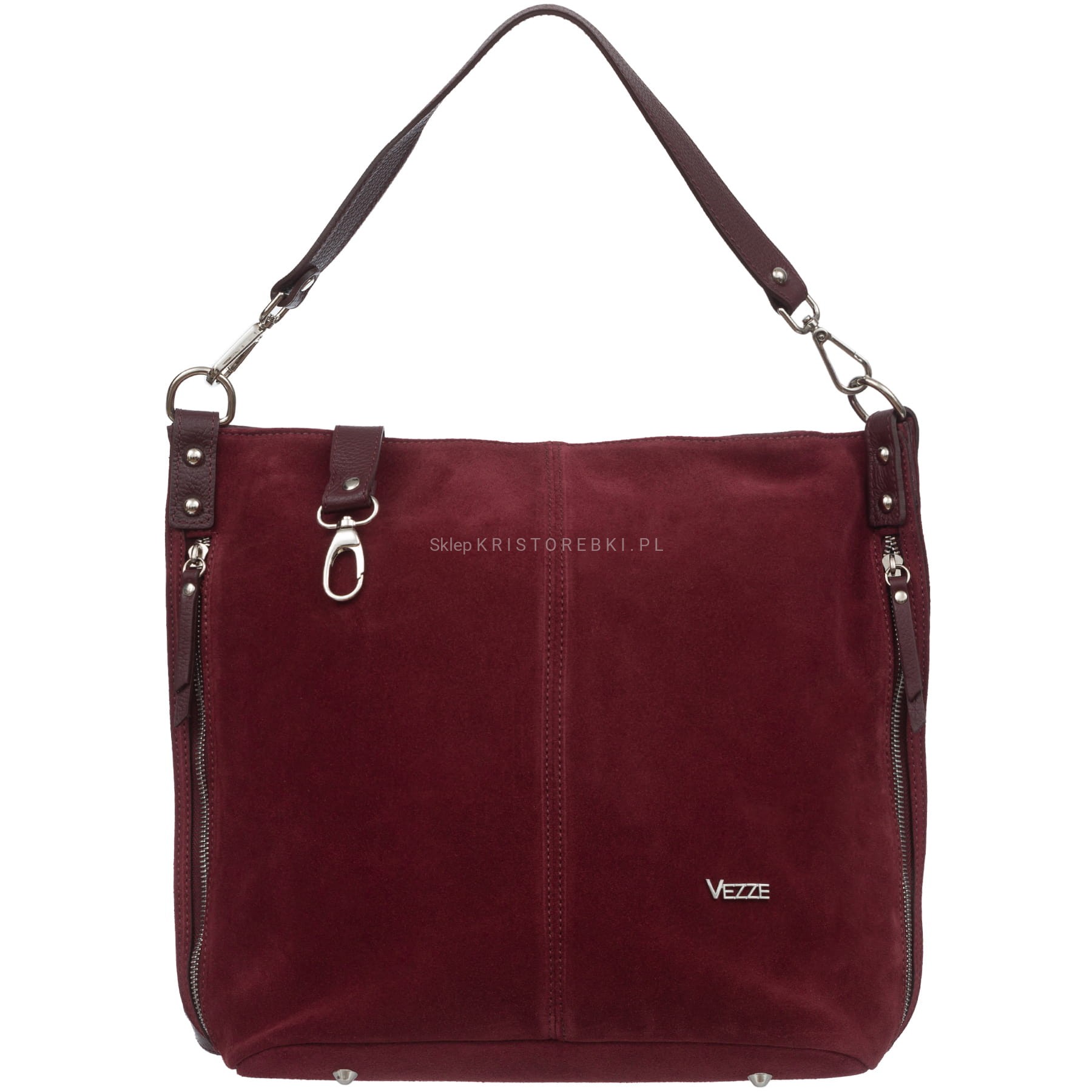 Włoska skórzana torebka damska typu worek znanej i cenionej na rynku europejskim marki VEZZE w kolorze CIEMNEGO BORDO. Wykonana została bardzo starannie z najwyższej jakości i przyjemnej w dotyku zamszowej skóry naturalnej. Torebka posiada wygodną i odpinaną rączkę do noszenia w ręku a dodatkowy długi, odpinany i regulowany pasek pozwala ją nosić również wygodnie na ramieniu. Jest duża i pojemna, dzięki czemu bez trudu pomieści sztywny format A4. Torebka posiada okucia w kolorze srebrnym i zapinana jest na solidny suwak. Po bokach torebki znajdują się dwie duże i funkcjonalne pionowe kieszenie zamykane na suwak. Dwukomorowy środek wykończony wysokiej jakości podszewką. W środku znajduje się duża przegroda zamykana na suwak a na ściankach bocznych znajdują się dwie otwarte kieszonki na telefon lub dokumenty oraz duża kieszeń zamykana na suwak. Z tyłu torebki znajdziesz kolejną praktyczną, zamykaną na suwak, dużą kieszeń a spód torebki jest dodatkowo chroniony metalowymi nóżkami. Torebka jest bardzo praktyczna i wygodna w codziennym użytkowaniu. Jej klasyczny wygląd sprawia, że będzie pasowała do większości codziennych i wyjściowych stylizacji.