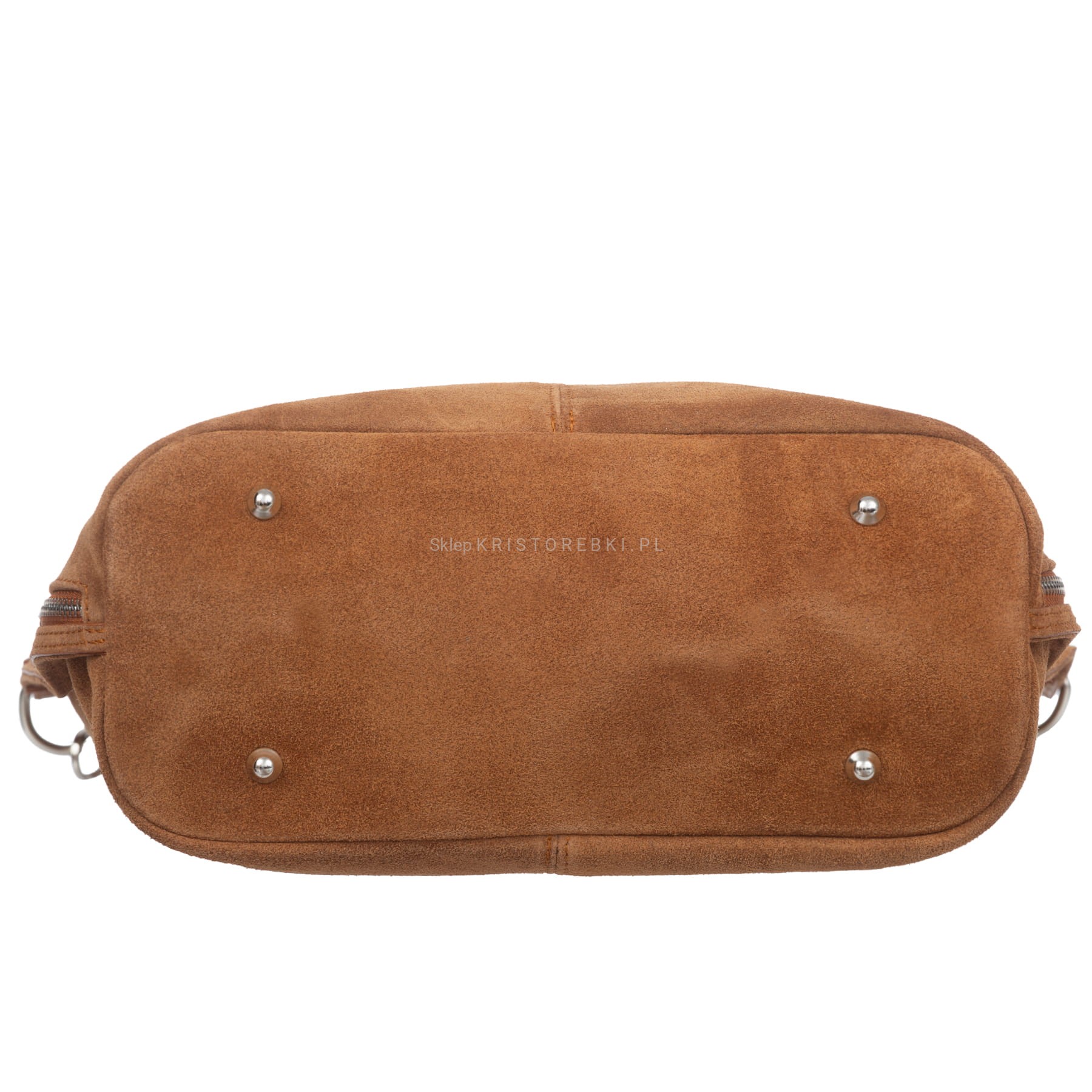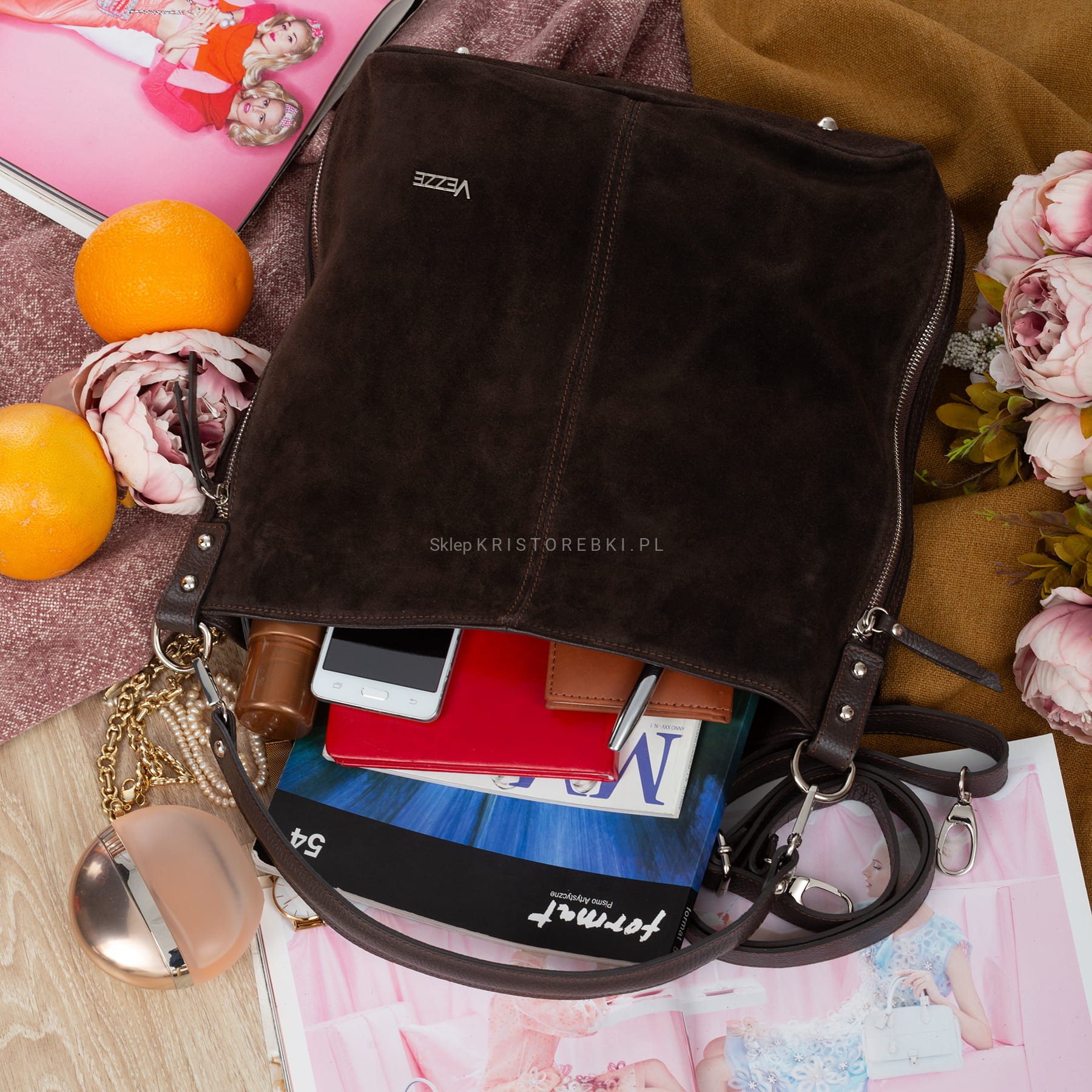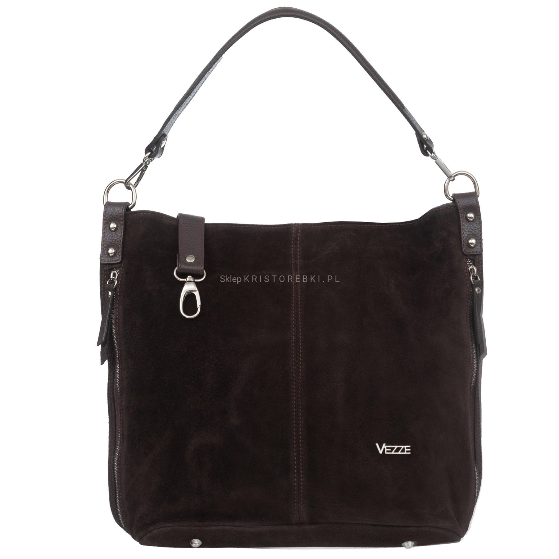 Włoska skórzana torebka damska typu worek znanej i cenionej na rynku europejskim marki VEZZE w kolorze CIEMNEGO CZEKOLADOWEGO BRĄZU. Wykonana została bardzo starannie z najwyższej jakości i przyjemnej w dotyku zamszowej skóry naturalnej. Torebka posiada wygodną i odpinaną rączkę do noszenia w ręku a dodatkowy długi, odpinany i regulowany pasek pozwala ją nosić również wygodnie na ramieniu. Jest duża i pojemna, dzięki czemu bez trudu pomieści sztywny format A4. Torebka posiada okucia w kolorze srebrnym i zapinana jest na solidny suwak. Po bokach torebki znajdują się dwie duże i funkcjonalne pionowe kieszenie zamykane na suwak. Dwukomorowy środek wykończony wysokiej jakości podszewką. W środku znajduje się duża przegroda zamykana na suwak a na ściankach bocznych znajdują się dwie otwarte kieszonki na telefon lub dokumenty oraz duża kieszeń zamykana na suwak. Z tyłu torebki znajdziesz kolejną praktyczną, zamykaną na suwak, dużą kieszeń a spód torebki jest dodatkowo chroniony metalowymi nóżkami. Torebka jest bardzo praktyczna i wygodna w codziennym użytkowaniu. Jej klasyczny wygląd sprawia, że będzie pasowała do większości codziennych i wyjściowych stylizacji.