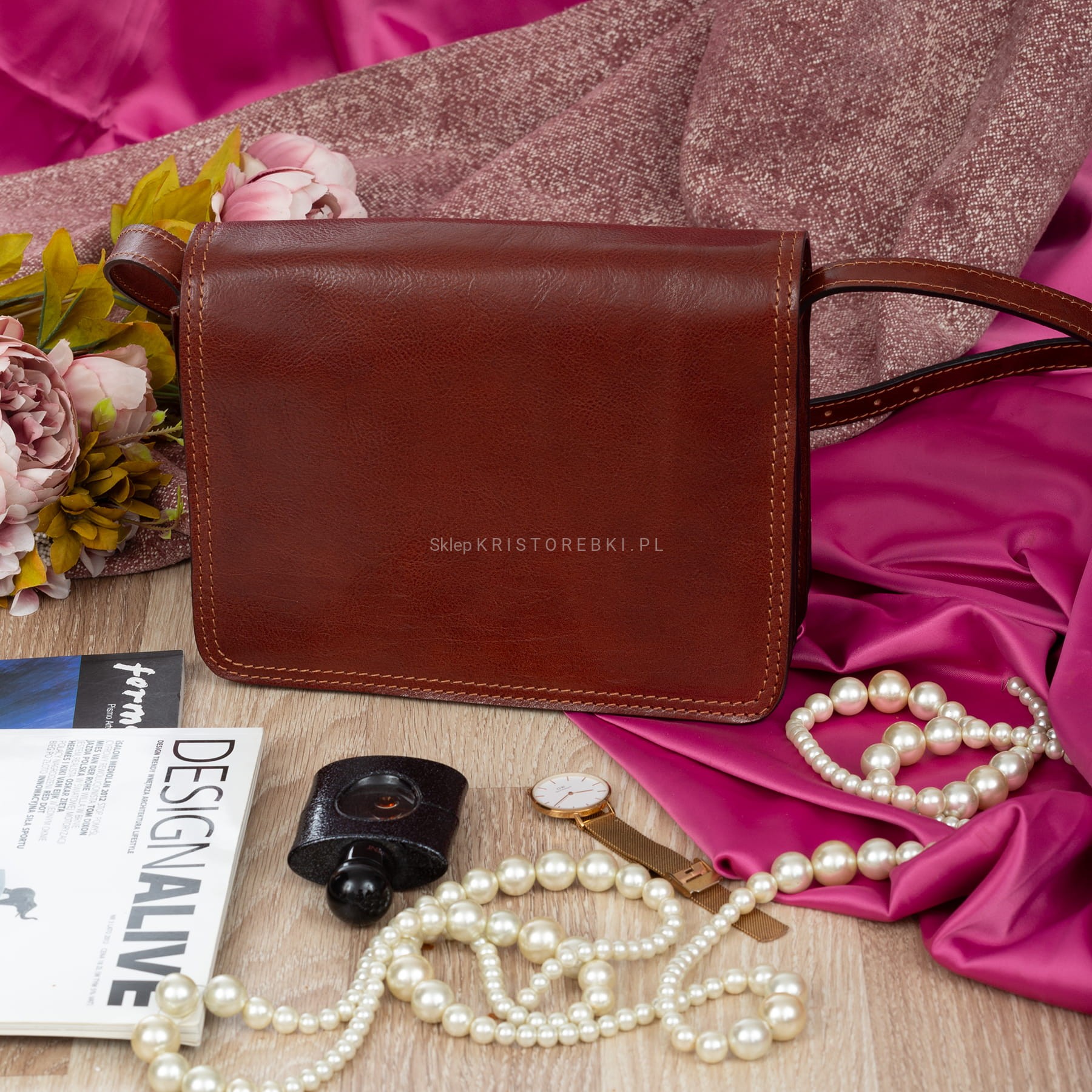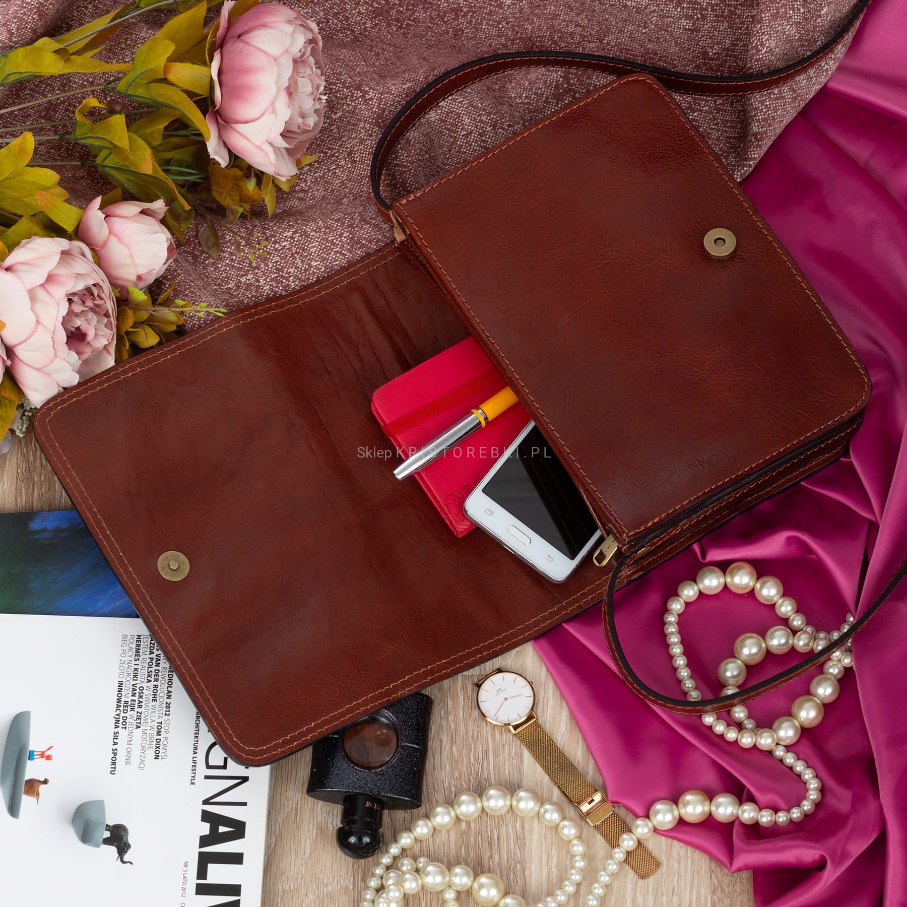 Duża torebka damska listonoszka w stylu vintage znanej i cenionej na rynku europejskim marki VERA PELLE ITALY w kolorze KONIAKOWEGO BRĄZU. Uszyta została z najwyższej jakości, lekko połyskującej i przepięknie pachnącej włoskiej skóry naturalnej. Torebka posiada długi i regulowany pasek, dzięki czemu można ją wygodnie nosić na ramieniu i z łatwością dopasować do własnych preferencji. Torebka posiada mosiężne okucia i zamykana jest na praktyczną klapę na magnes. W środku znajdują się 3 niezależne komory z czego środkowa zamykana jest na suwak. Dodatkowo w jednej z komór na ściance bocznej znajduje się dodatkowa kieszeń zamykana na suwak. Z tyłu znajduje się kolejna praktyczna kieszeń zamykana na suwak. Torebka jest bardzo wygodna i praktyczna. Będzie świetnym dodatkiem do codziennych i wyjściowych stylizacji.