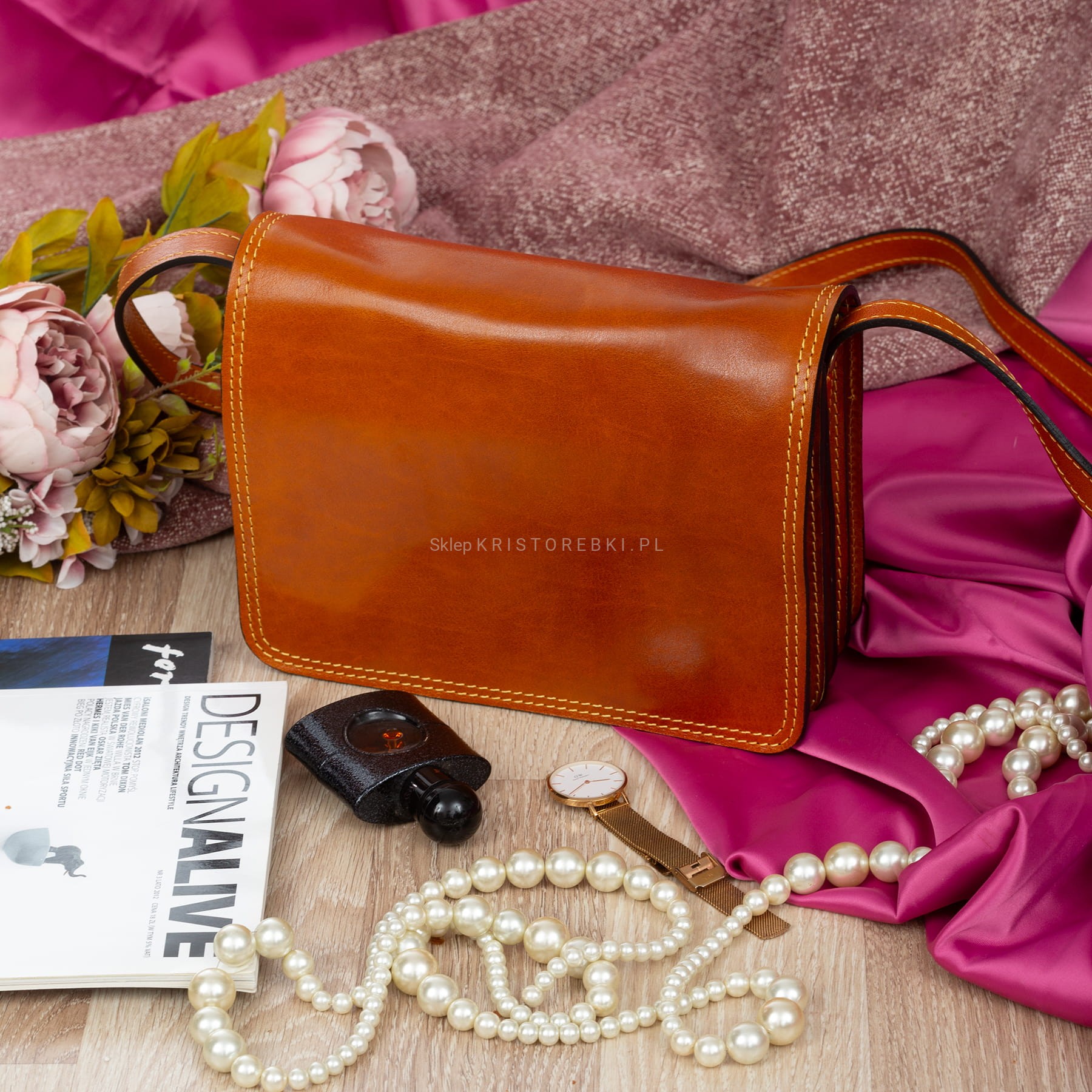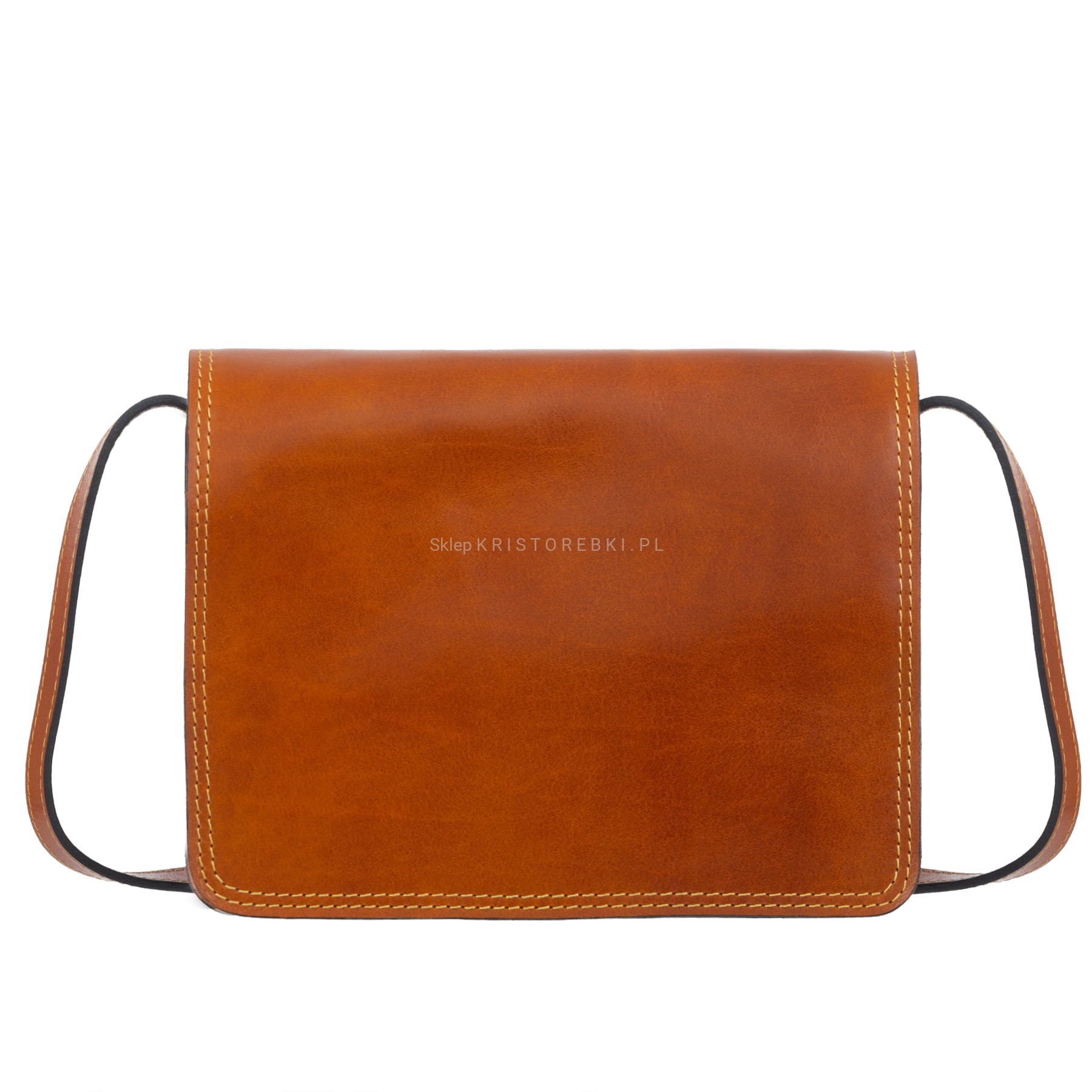 VERA PELLE torebka damska skórzana listonoszka vintage duża z klapą i paskiem na ramię V554 camel