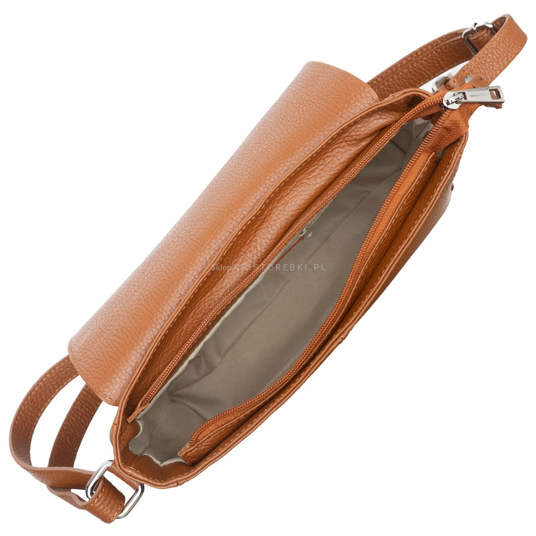 Torebka damska listonoszka znanej i cenionej na rynku europejskim marki VERA PELLE ITALY w kolorze KONIAKOWEGO BRĄZU. Uszyta została z najwyższej jakości pachnącej włoskiej skóry naturalnej z widoczną fakturą. Torebka posiada długi i regulowany pasek, dzięki czemu można ją wygodnie nosić na ramieniu i dopasować do własnych preferencji. Torebka posiada srebrne okucia i zamykana jest na praktyczną klapę na magnes. Jednokomorowy środek zamykany jest na suwak i wykończony podszewką. W środku znajdziesz praktyczną kieszonkę zamykaną na suwak oraz dwie otwarte kieszonki na telefon lub dokumenty. Z tyłu znajduje się kolejna praktyczna kieszeń zamykana na suwak a spód jest dodatkowo usztywniony. Torebka jest bardzo wygodna i praktyczna. Będzie świetnym dodatkiem do codziennych i wyjściowych stylizacji.