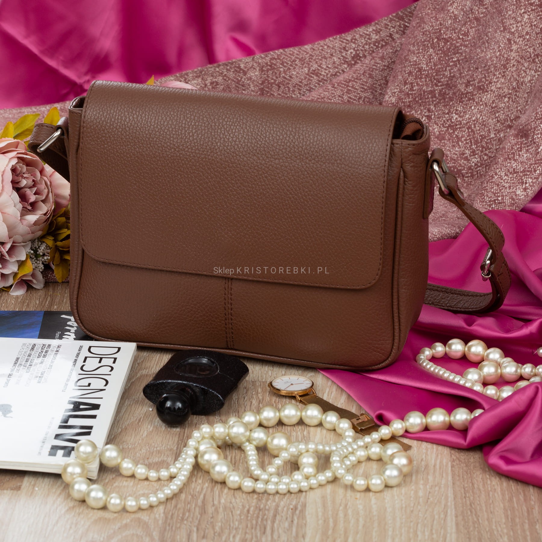 VERA PELLE torebka damska skórzana listonoszka z klapą i paskiem na ramię V556 brązowa