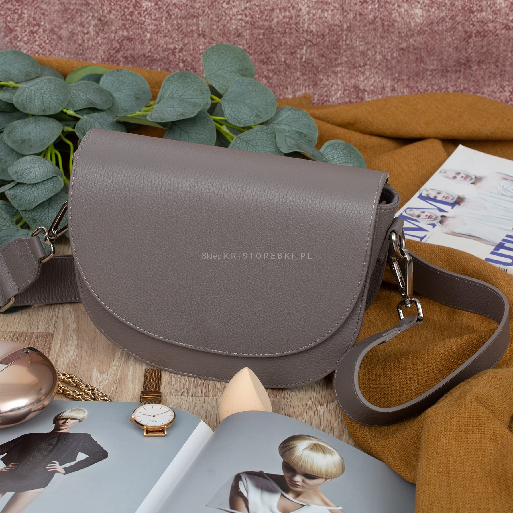 VERA PELLE torebka damska skórzana listonoszka z szerokim paskiem na ramię V558 ciepła szara