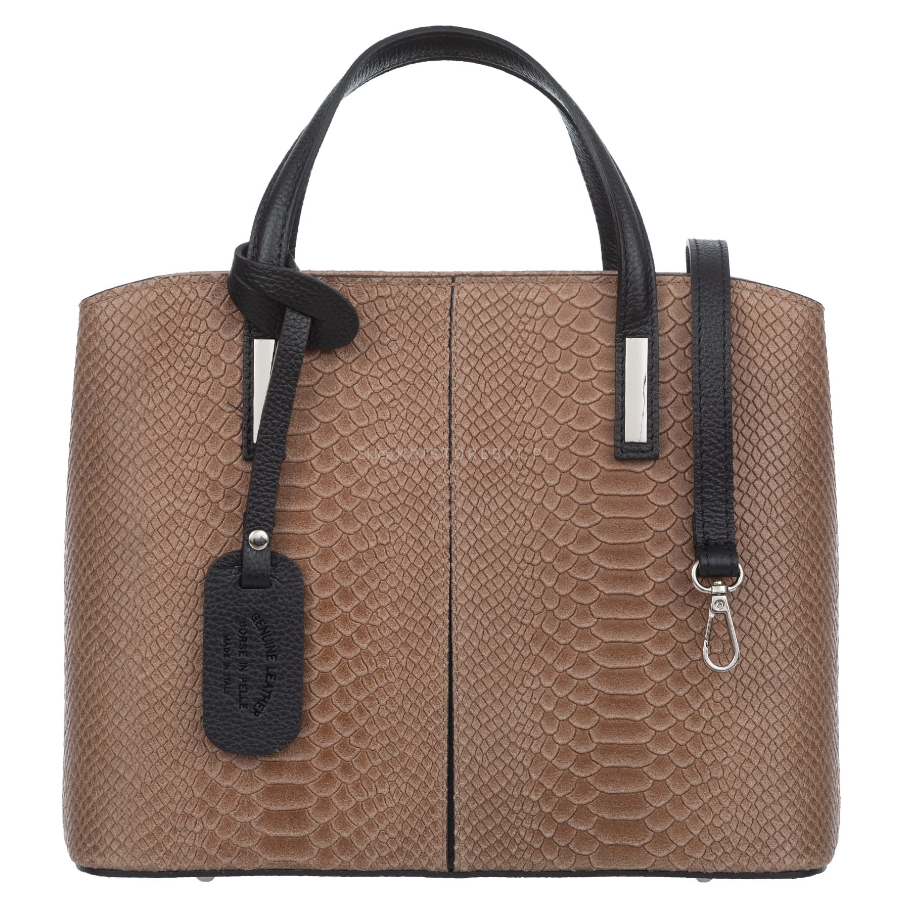 Klasyczna sztywna torebka damska znanej i cenionej na rynku europejskim marki VERA PELLE ITALY w kolorze TAUPE. Uszyta została bardzo starannie z najwyższej jakości skóry naturalnej z ozdobnymi tłoczeniami. Torebka posiada długie rączki, dzięki czemu możesz ją wygodnie nosić w ręku. Posiada dodatkowo w zestawie długi i regulowany pasek, dzięki czemu można ją nosić również wygodnie na ramieniu a dzięki regulacji dopasować do własnych preferencji. Torebka posiada srebrne okucia i zamykana jest na solidny suwak. Dwukomorowe wnętrze wykończone jest podszewką. W środku przedzielona jest przegrodą zamykaną na suwak. Dodatkowo w środku na ściance bocznej znajduje się kieszonka na suwak a z drugiej strony dwie praktyczne otwarte kieszonki na telefon lub dokumenty. Spód torebki jest dodatkowo usztywniony i posiada nóżki ochronne, chroniące ją przed zarysowaniami. Z przodu torebka posiada zdejmowany ozdobny breloczek z logo marki. Torebka jest bardzo pojemna i praktyczna. Będzie świetnym dodatkiem do każdej codziennej i wyjściowej stylizacji.