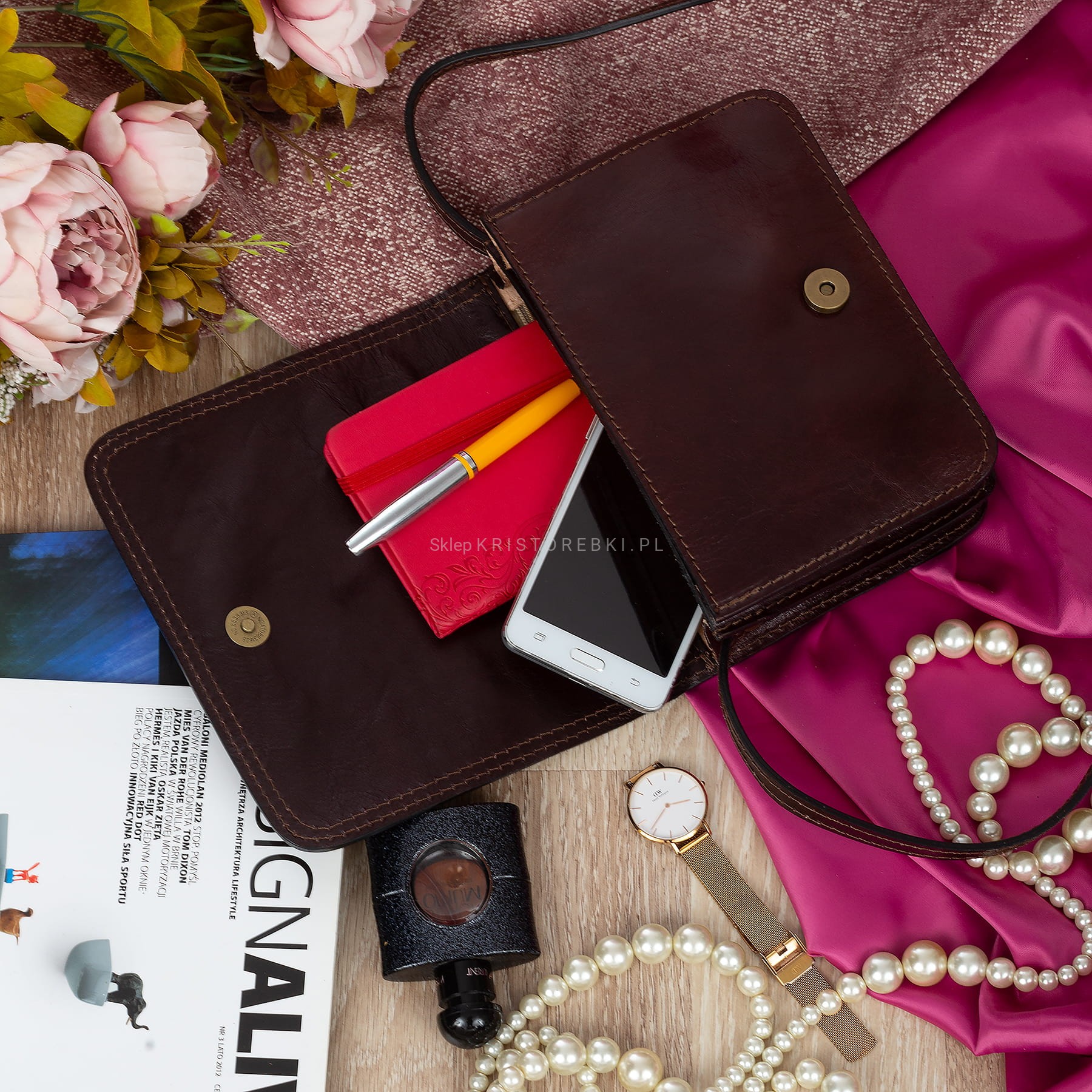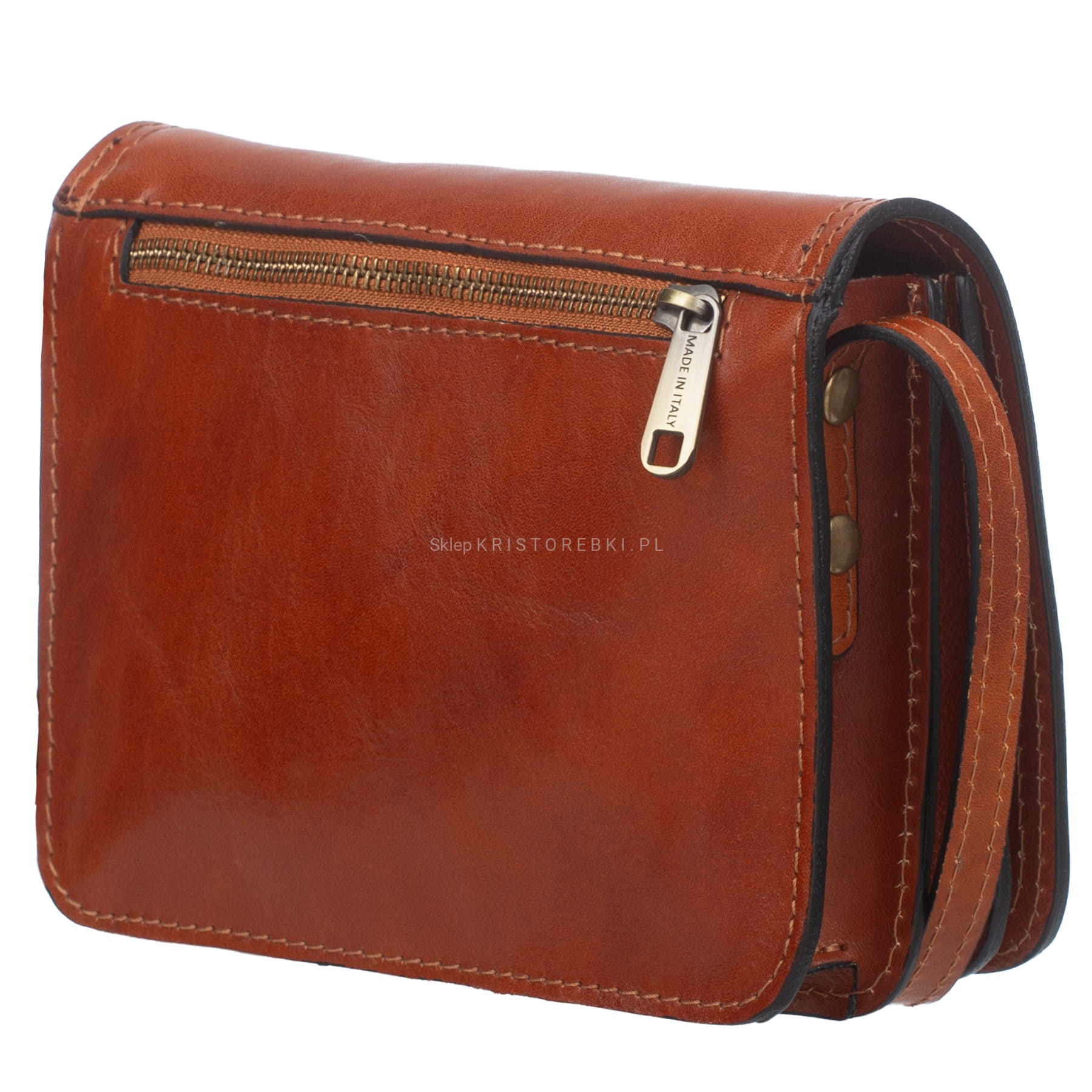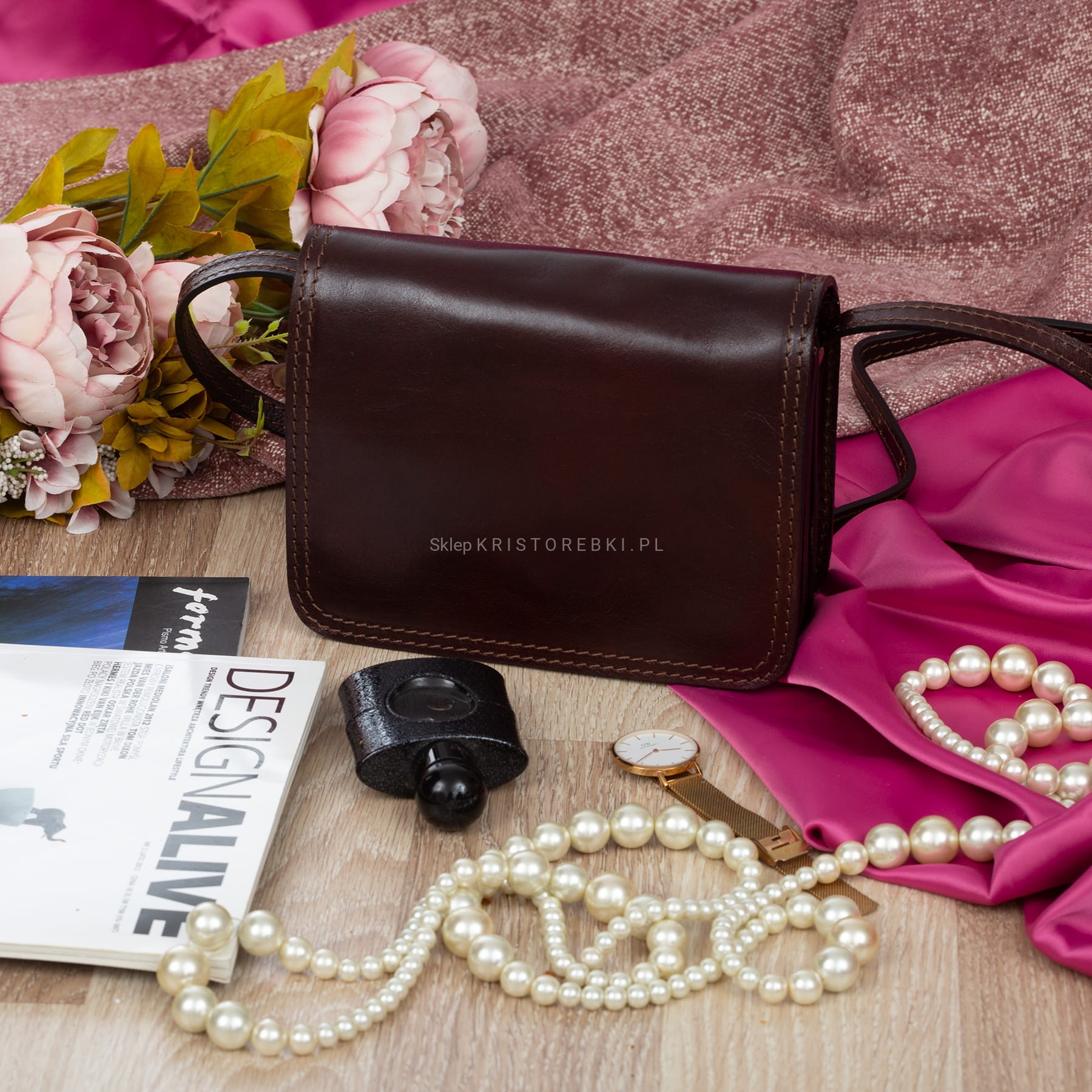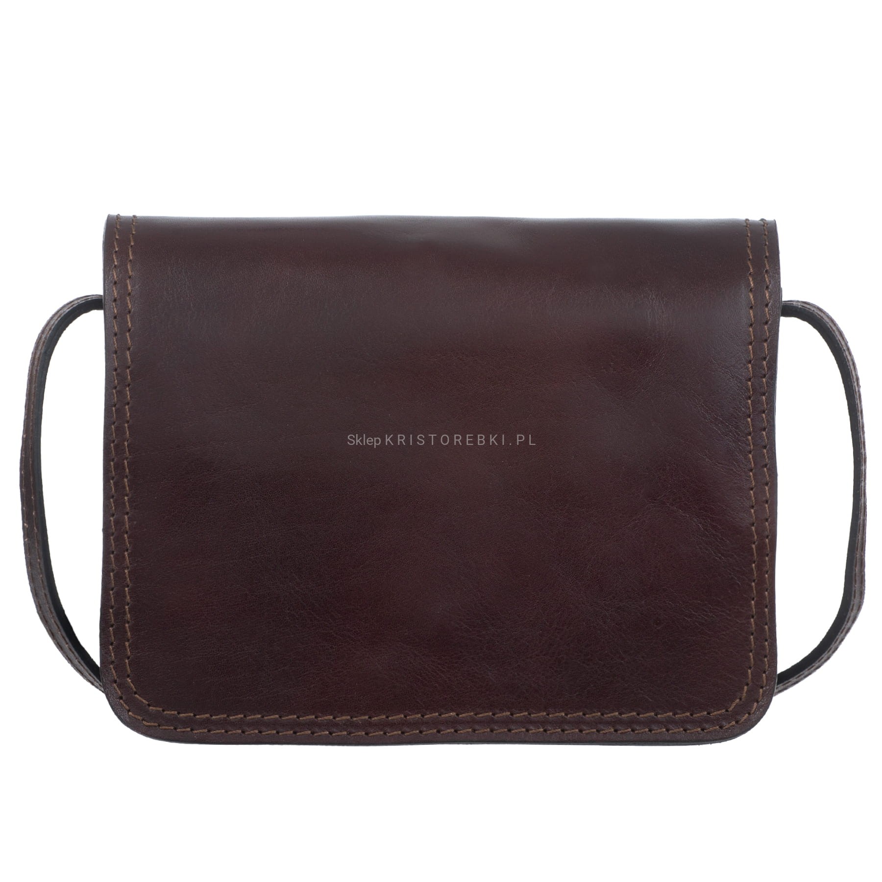 VERA PELLE torebka damska skórzana listonoszka vintage mała z klapą i paskiem na ramię V562 ciemna brązowa