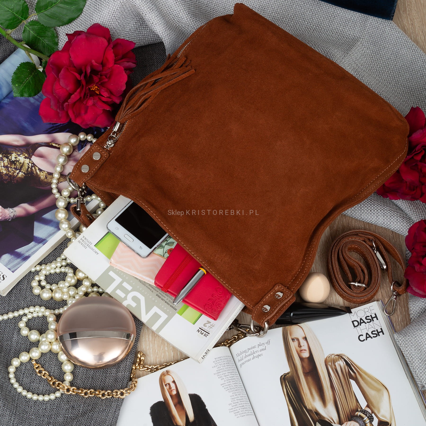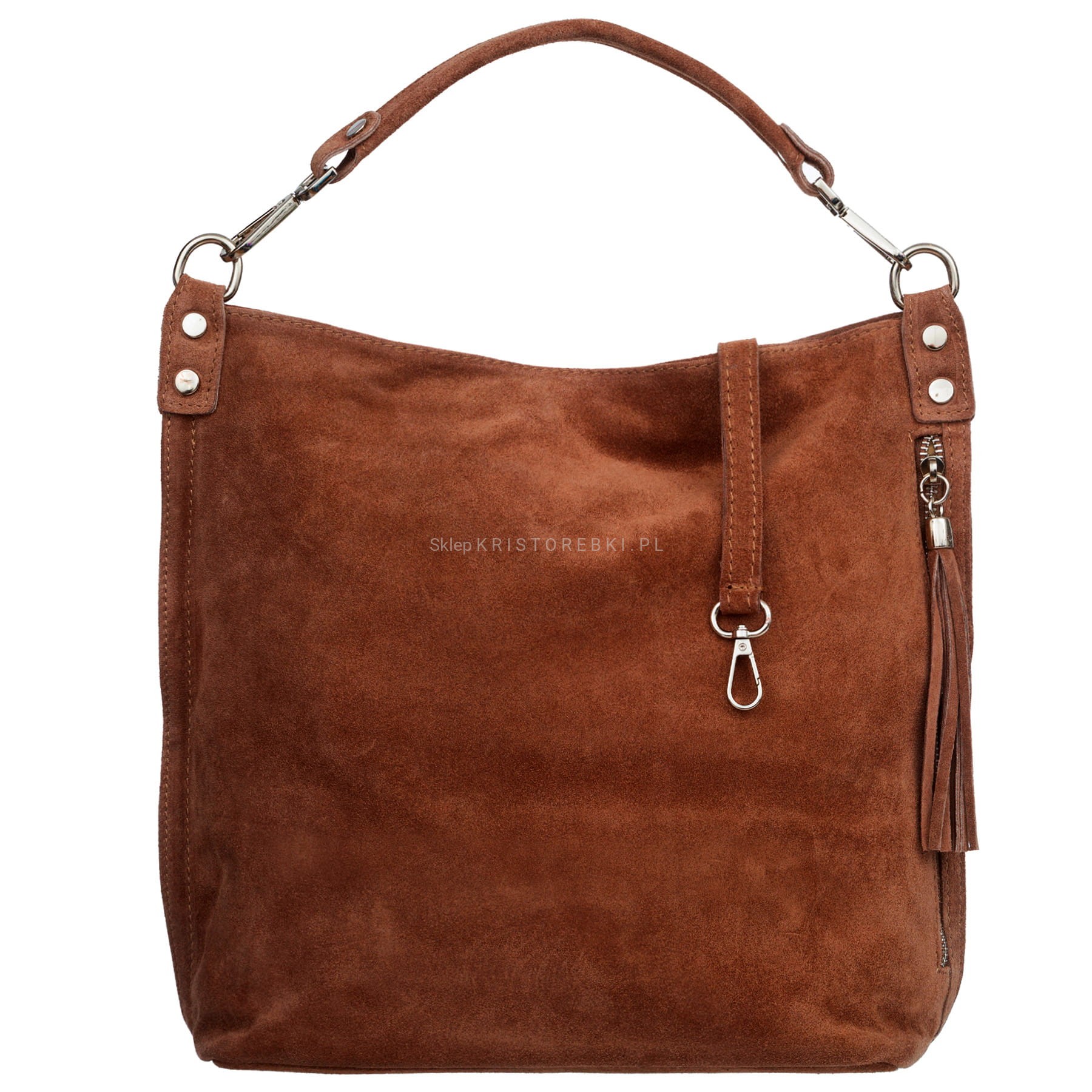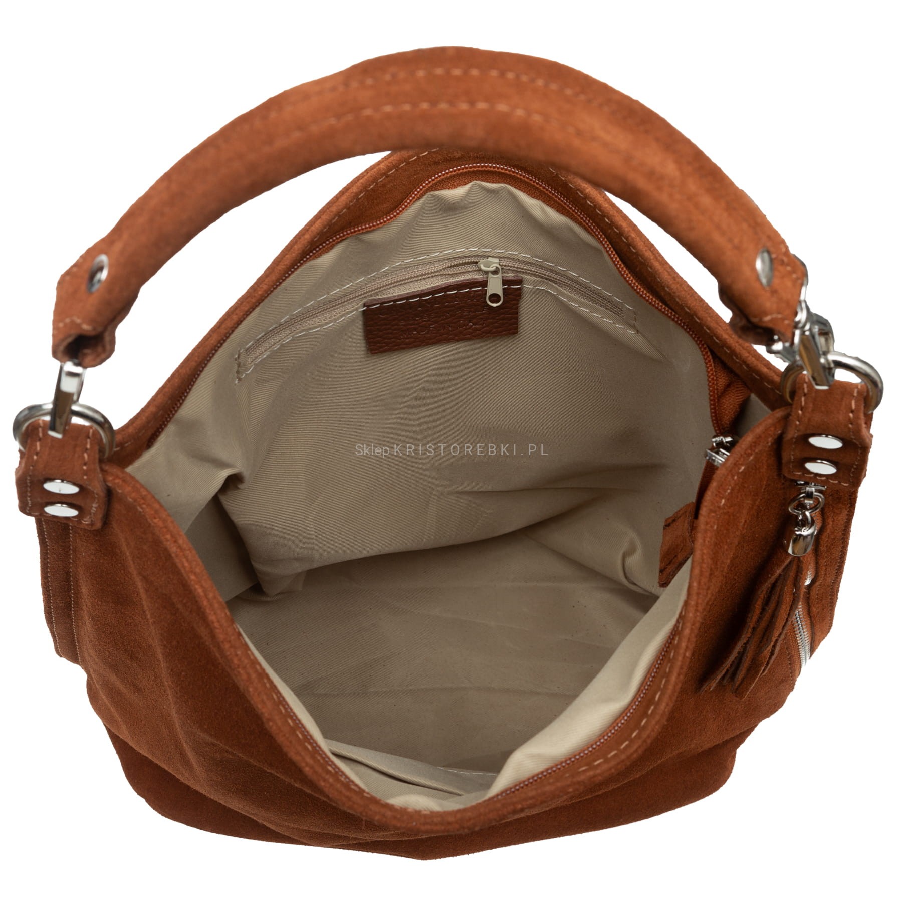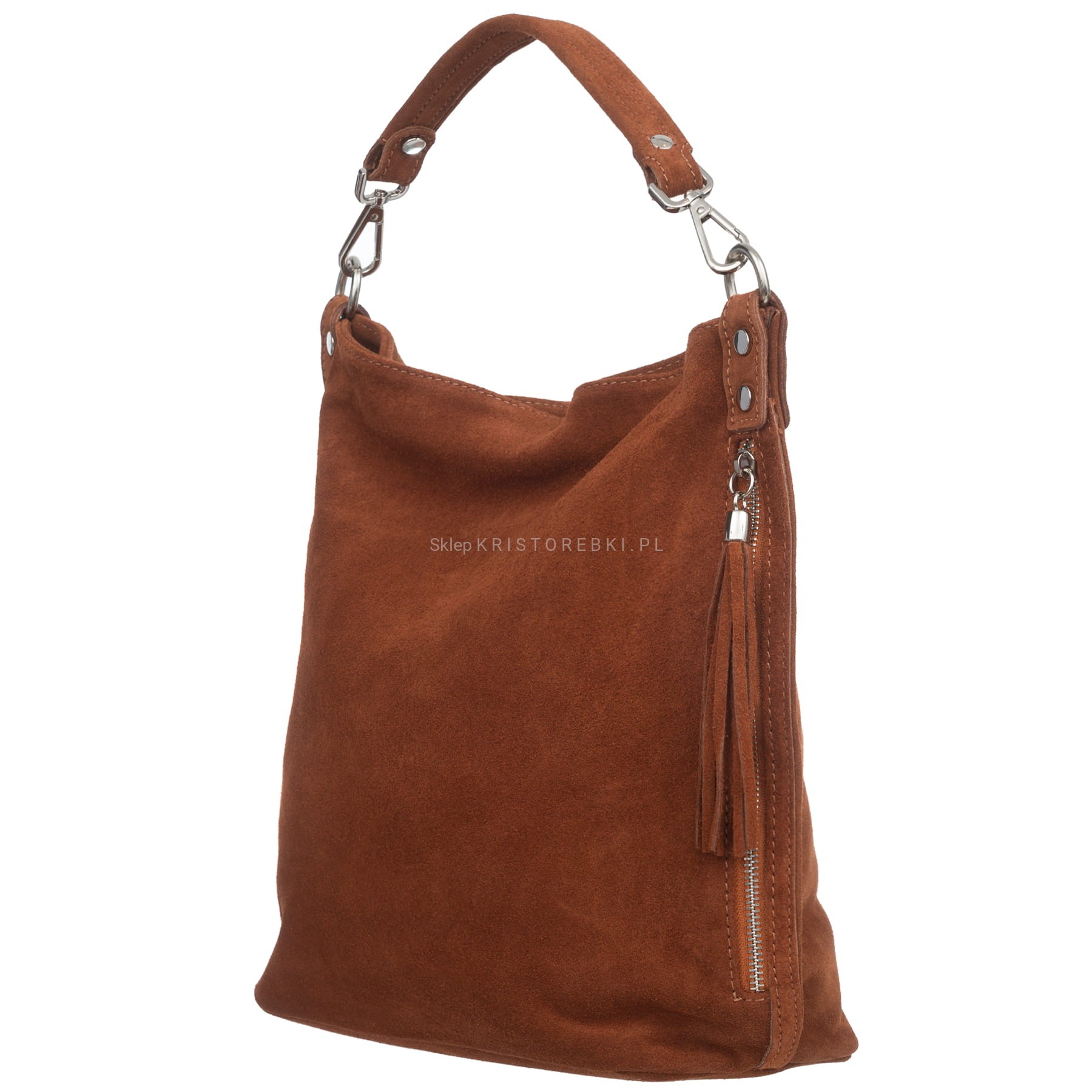 Włoska skórzana torebka damska typu worek znanej i cenionej na rynku europejskim marki VERA PELLE ITALY w kolorze KONIAKOWEGO BRĄZU. Wykonana została bardzo starannie z najwyższej jakości, przyjemnie pachnącej i miłej w dotyku włoskiej zamszowej skóry naturalnej. Torebka posiada wygodną i odpinaną rączkę do noszenia w ręku a dodatkowy długi, odpinany i regulowany pasek pozwala ją nosić również wygodnie na ramieniu oraz w łatwy sposób dopasować do własnych preferencji. Jest duża i pojemna, dzięki czemu bez trudu pomieści sztywny format A4. Z boku torebki znajduje się duża i funkcjonalna pionowa kieszeń zamykana na suwak z ozdobnym frędzelkiem. Torebka posiada okucia w kolorze srebrnym i zapinana jest na solidny suwak a jednokomorowy środek wykończony jest podszewką. W środku na ściance bocznej znajduje się kieszonka zamykana na suwak oraz dwie otwarte kieszonki na telefon lub dokumenty. Z tyłu torebki znajdziesz kolejną praktyczną zamykaną na suwak kieszonkę. Torebka jest bardzo praktyczna i wygodna w codziennym użytkowaniu. Jej klasyczny wygląd sprawia, że będzie pasowała do większości codziennych i wyjściowych stylizacji.