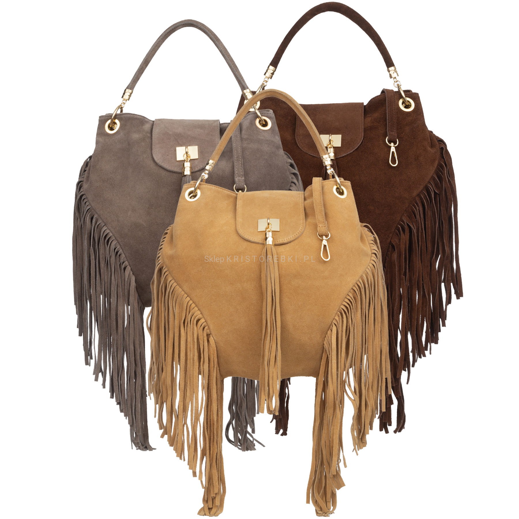 VERA PELLE torebka damska zamszowa worek z frędzlami i paskiem na ramię V571 kolory
