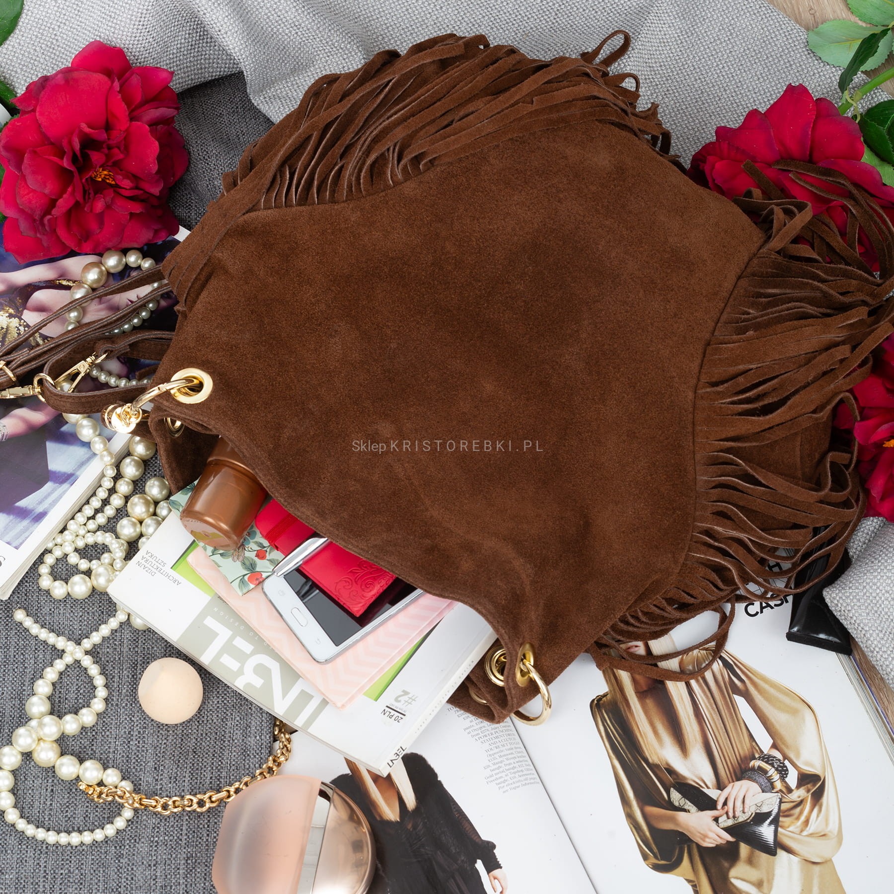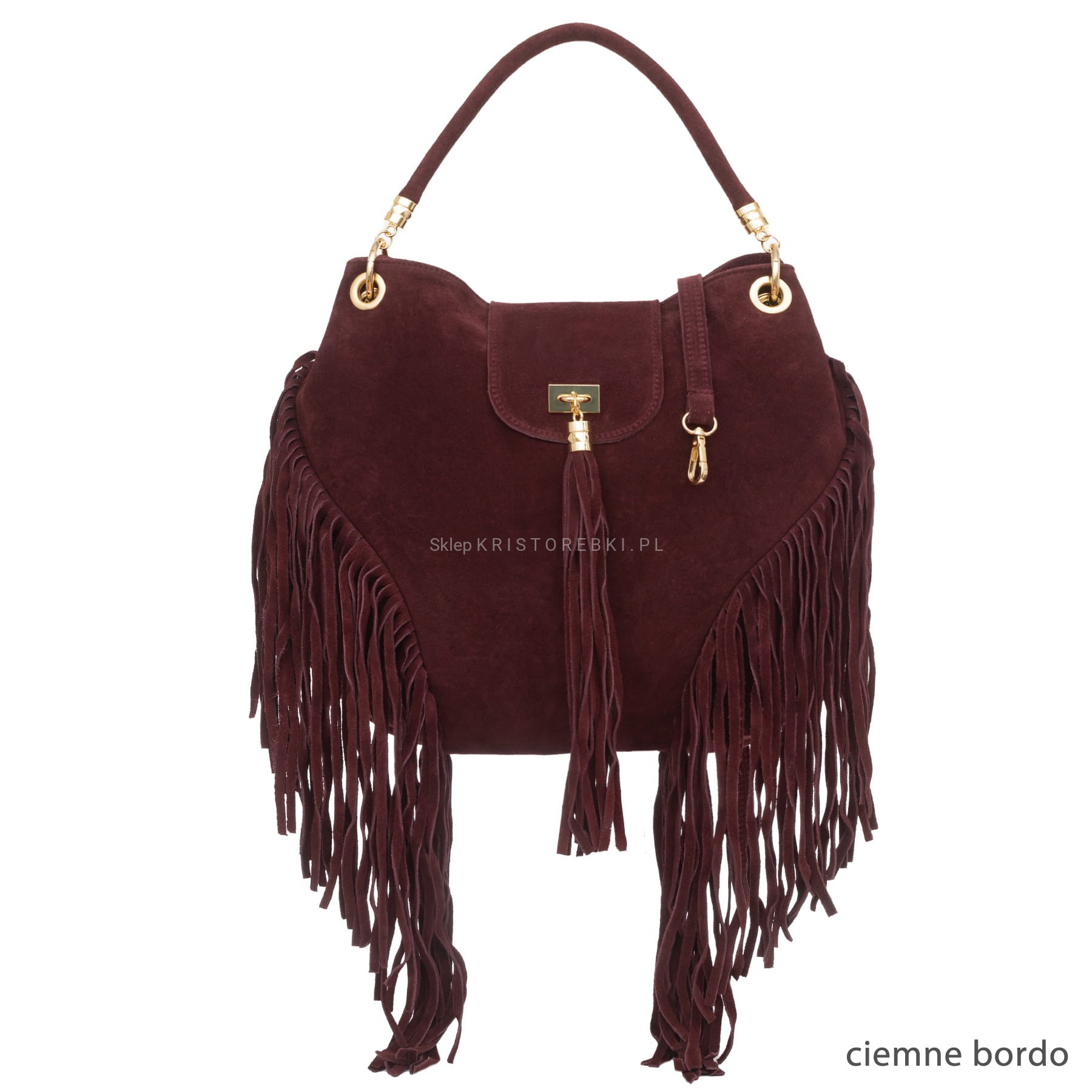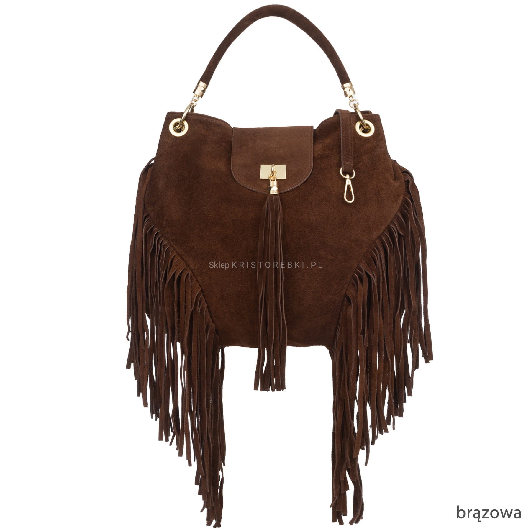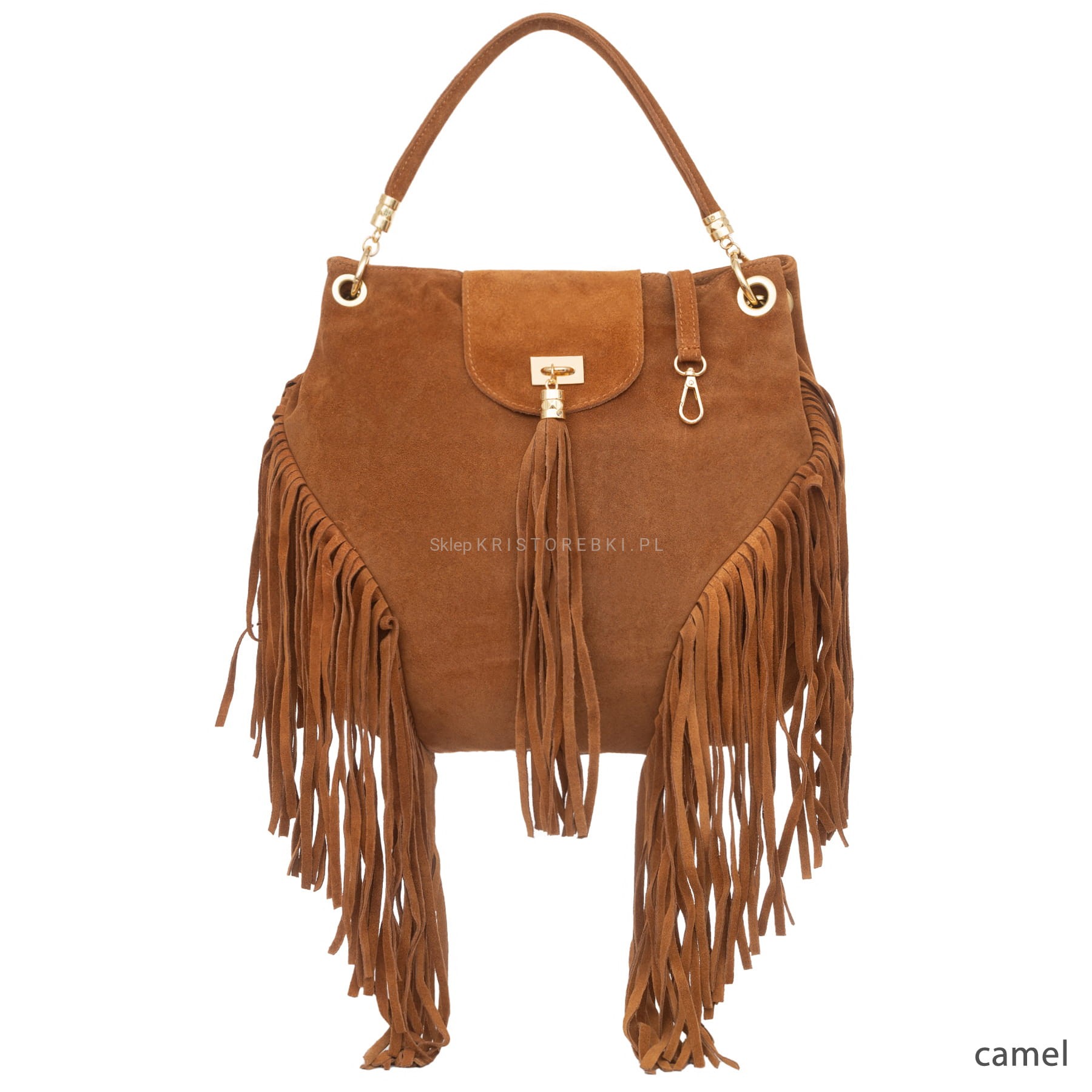 Torebka damska typu worek znanej i cenionej na rynku europejskim marki VERA PELLE ITALY dostępna w modnych KOLORACH. Wyprodukowana została z najwyższej jakości, przyjemnej w dotyku i pachnącej skóry naturalnej zamszowej z dbałością o najdrobniejsze szczegóły. Torebka jest duża i bez trudu pomieści sztywny format A4. Posiada po bokach ozdobne frędzle nadające jej styl boho oraz na środku ozdobną małą klapę z frędzelkiem. Torebka posiada okucia w kolorze złotym oraz długą rączkę, dzięki czemu można ją wygodnie nosić w ręku i na ramieniu. Dodatkowo do torebki dołączony został długi i regulowany pasek, dzięki czemu można ją nosić wygodnie na ramieniu i bez trudu dopasować do własnych preferencji. Torebka zamykana jest na magnesik a jednokomorowy środek wykończony jest podszewką. Na jednej z bocznych ścianek środka znajduje się praktyczna kieszonka zamykana na suwak a z drugiej strony znajdują się dwie otwarte kieszonki np. na telefon lub dokumenty. Torebka jest bardzo praktyczna, funkcjonalna i wygodna w codziennym użytkowaniu. Będzie pasowała do większości codziennych i wyjściowych stylizacji.