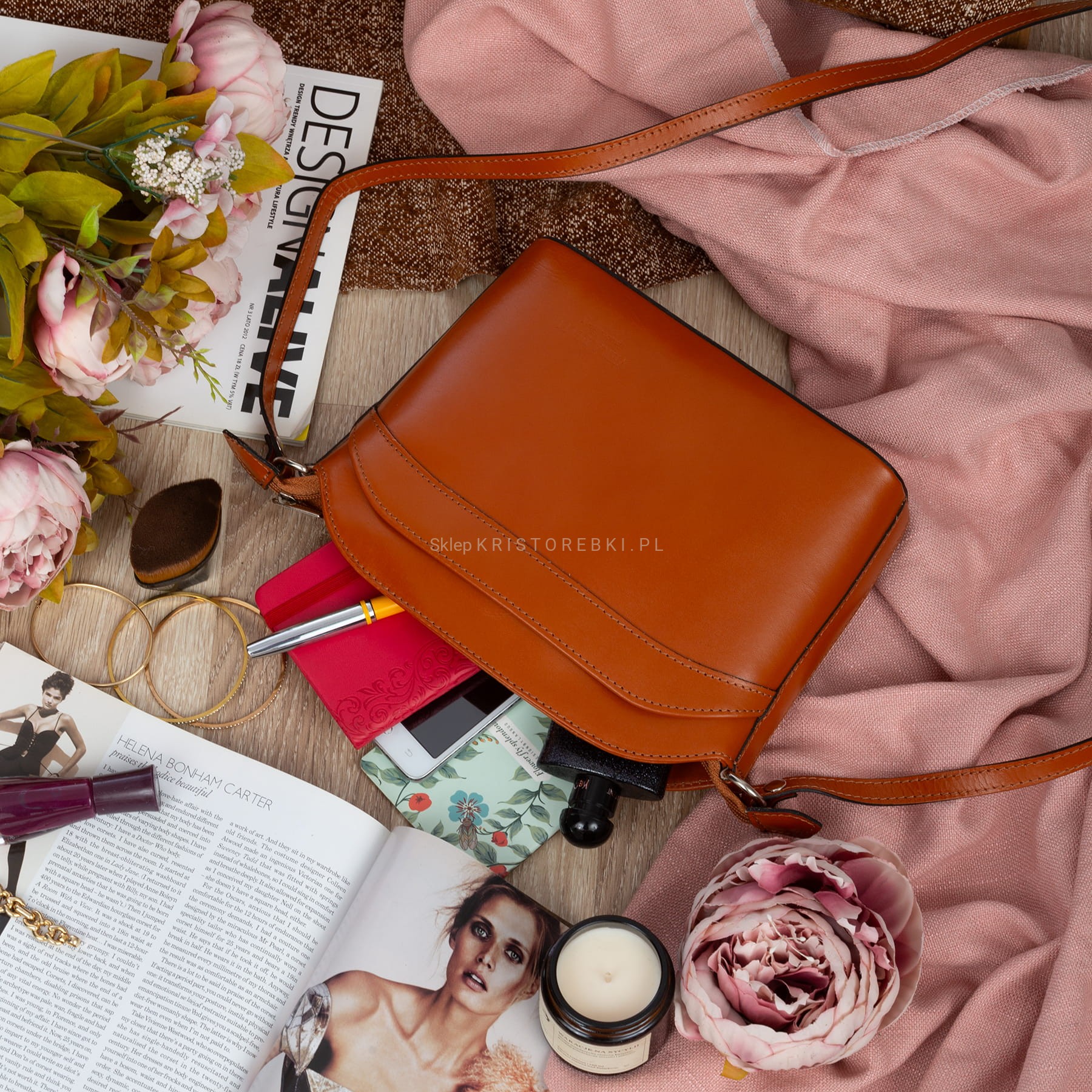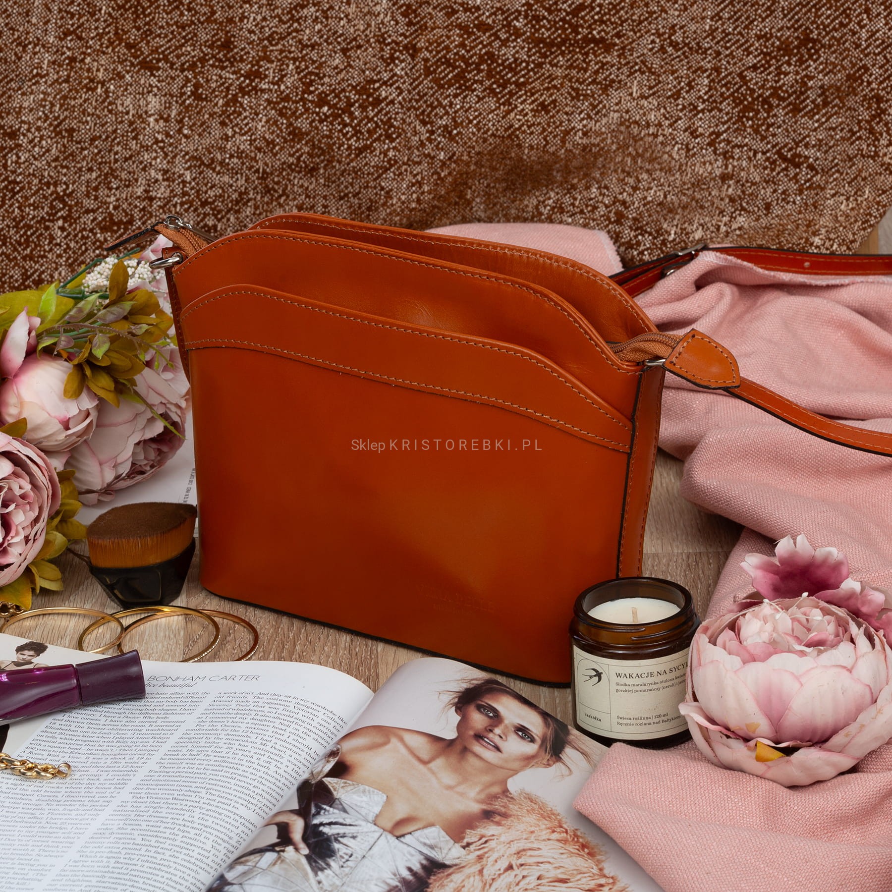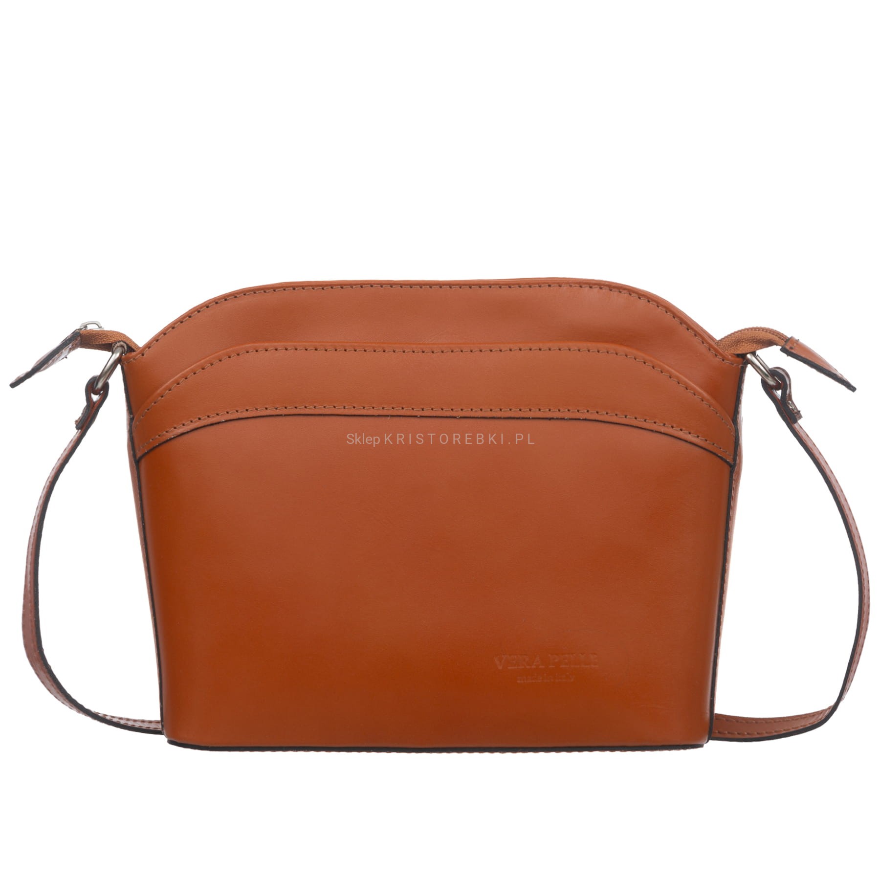 VERA PELLE torebka damska skórzana listonoszka z paskiem na ramię V575 camel