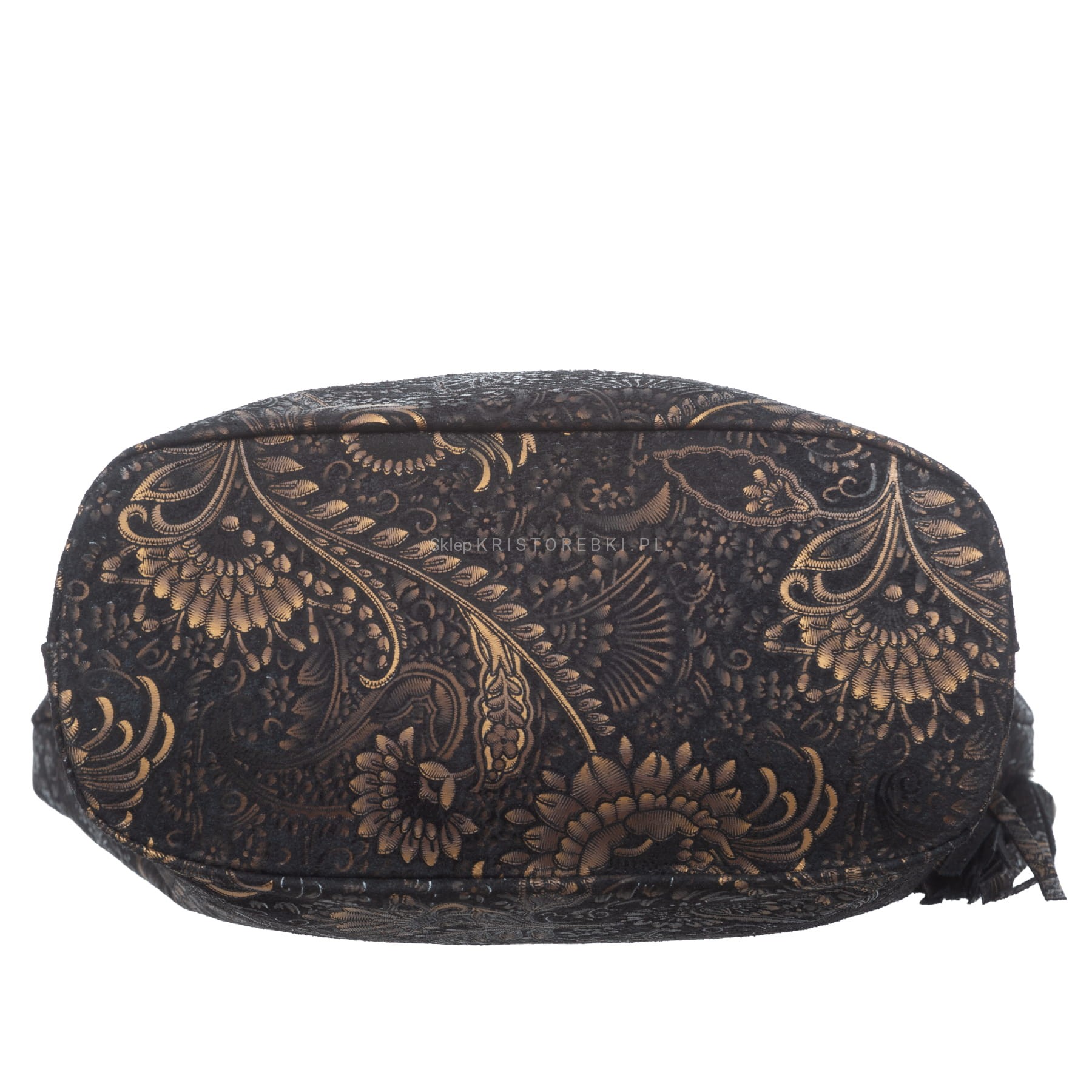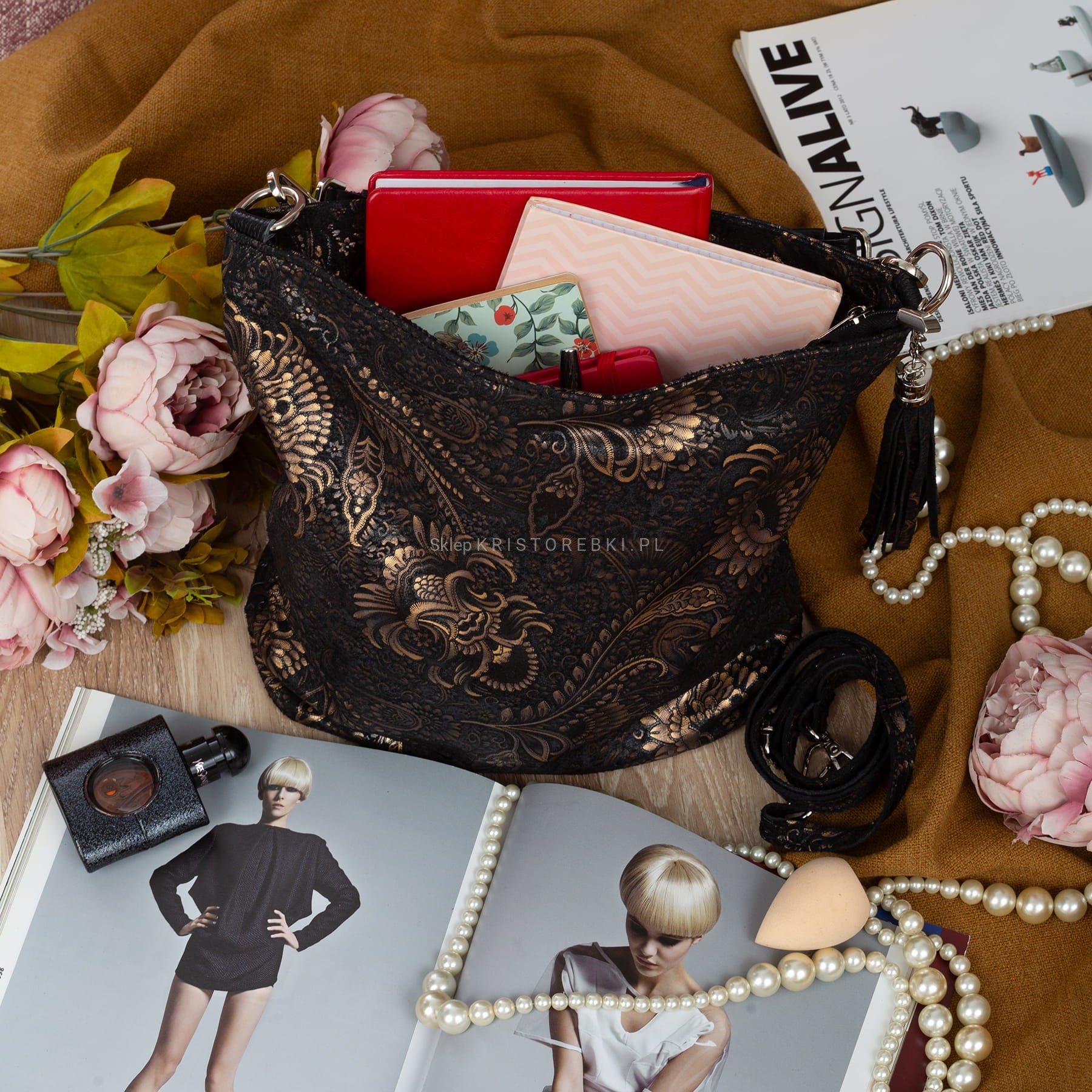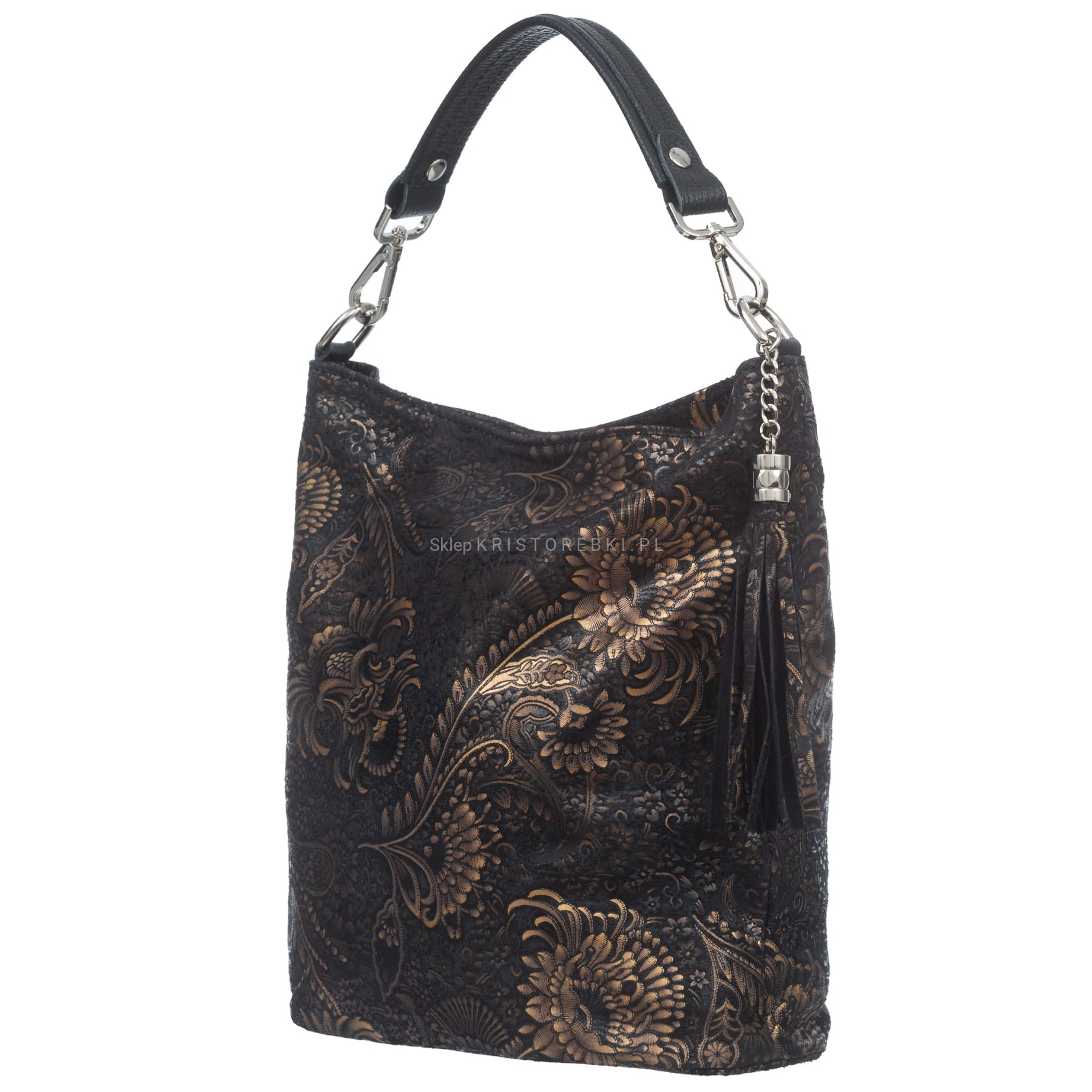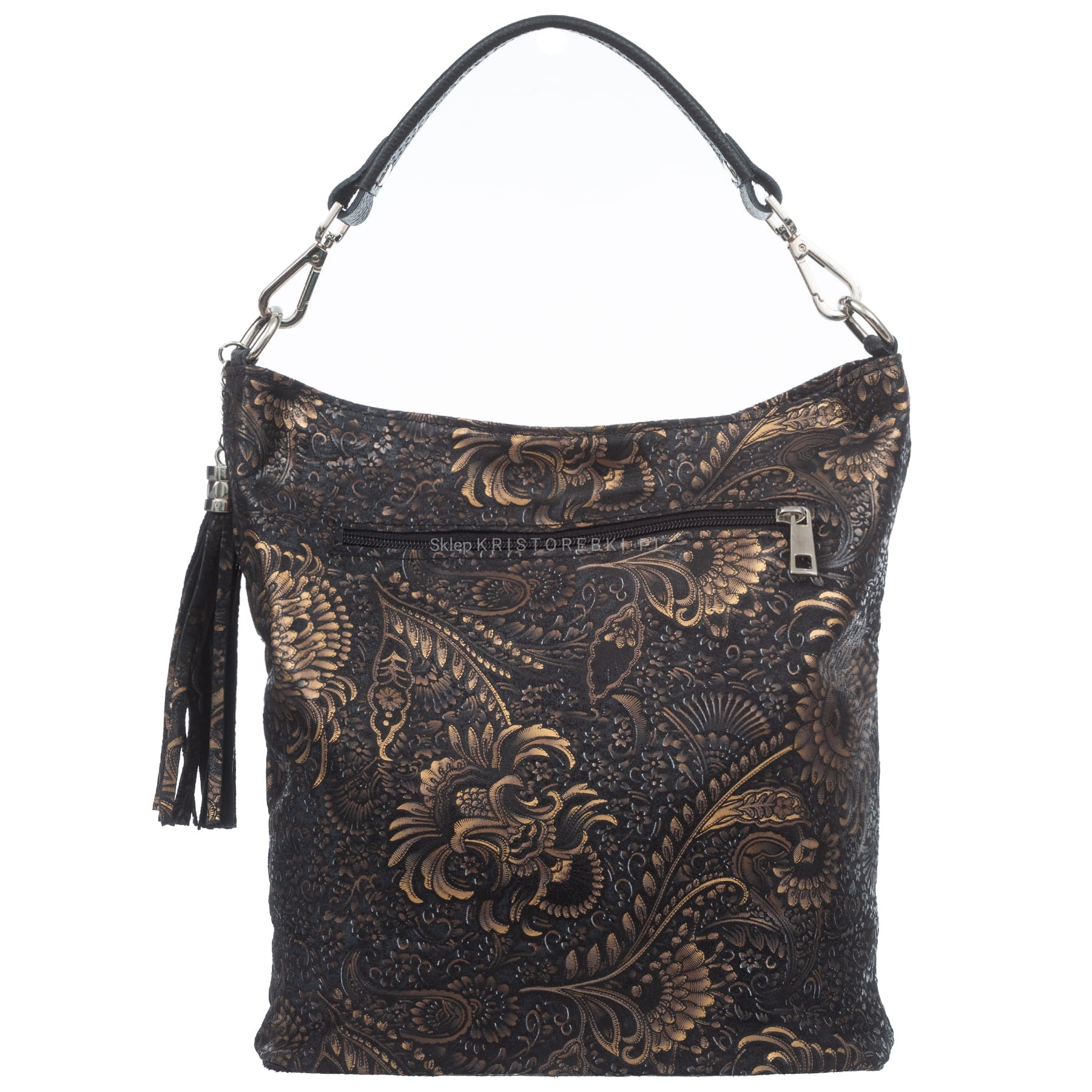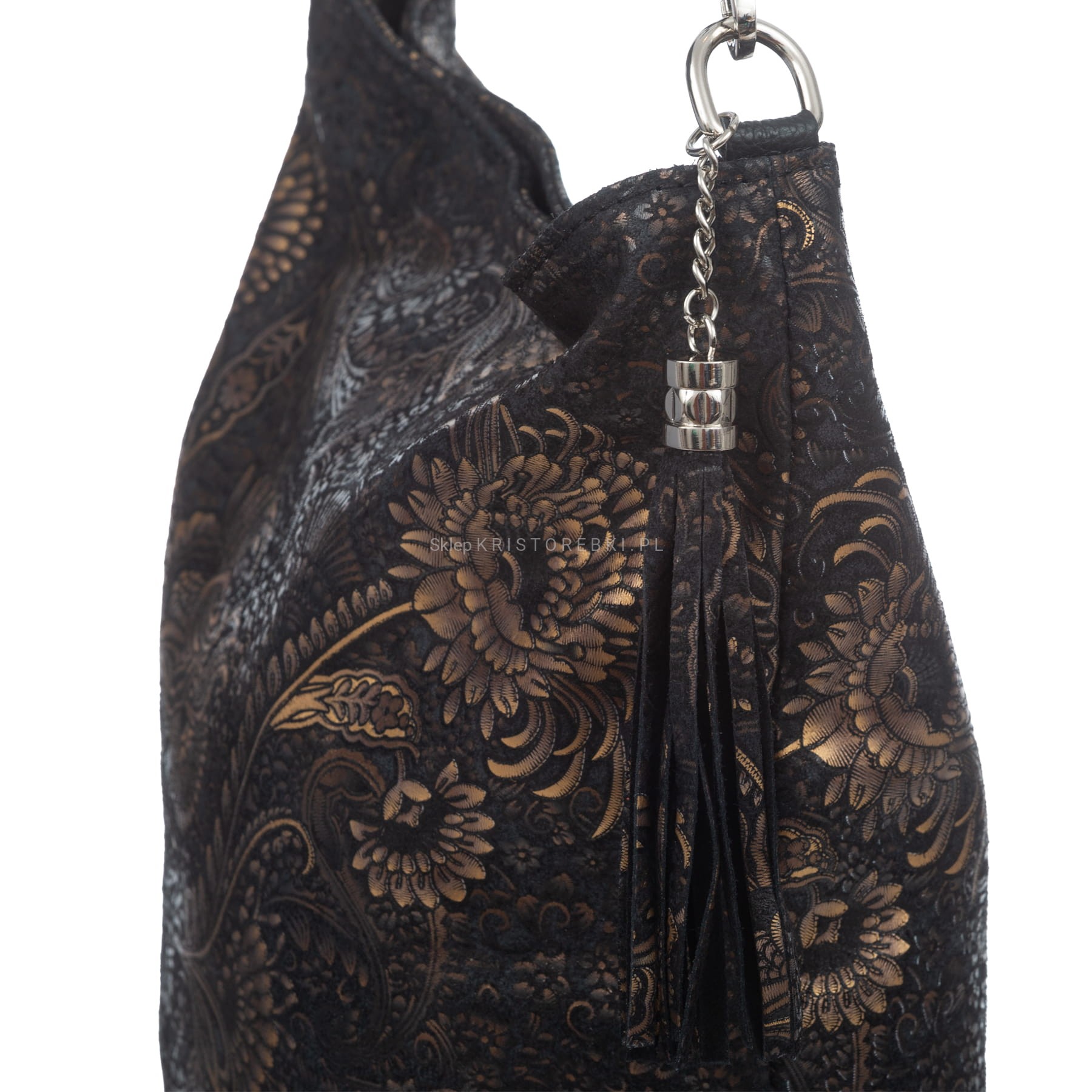 Torebka damska typu worek znanej i cenionej na rynku europejskim marki VERA PELLE ITALY w kolorze CZARNYM z ozdobnym ZŁOTYM wzorem. Wyprodukowana została z najwyższej jakości włoskiej skóry naturalnej z dbałością o najdrobniejsze szczegóły. Posiada odpinaną rączkę do noszenia w ręku oraz odpinany i regulowany pasek, dzięki czemu można ją wygodnie nosić również na ramieniu i bez trudu dopasować do własnych preferencji. Torebka posiada okucia w kolorze srebrnym i dodatkowo ozdobny frędzelek. Torebka zamykana jest suwak a jednokomorowy środek wykończony jest podszewką. W środku na ściance bocznej znajduje się praktyczna kieszonka zamykana na suwak. Dno torebki zostało dodatkowo usztywnione, dzięki czemu podczas użytkowania będzie trzymała swój kształt. Torebka jest bardzo praktyczna, funkcjonalna i wygodna w codziennym użytkowaniu. Będzie pasowała do większości codziennych i wyjściowych stylizacji.