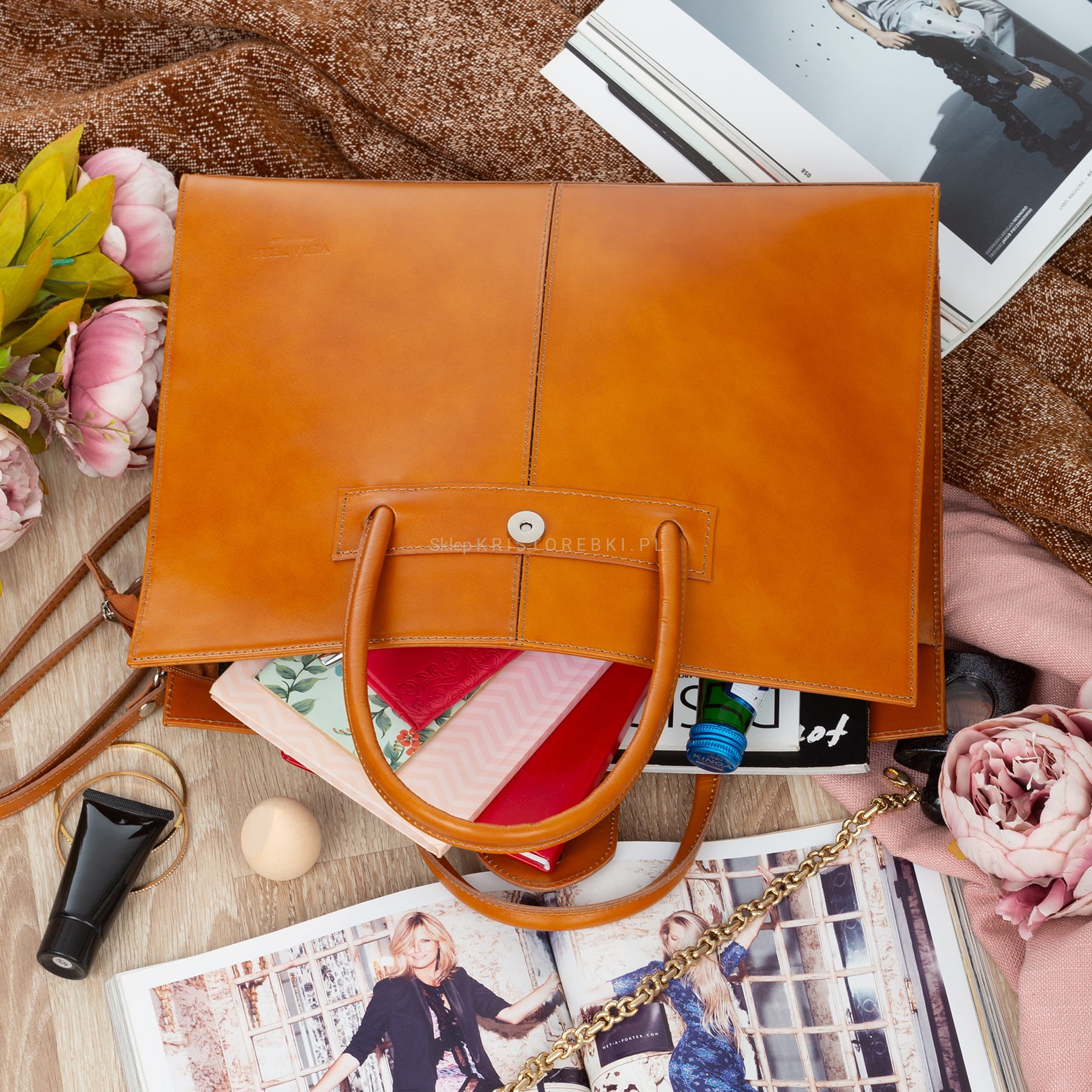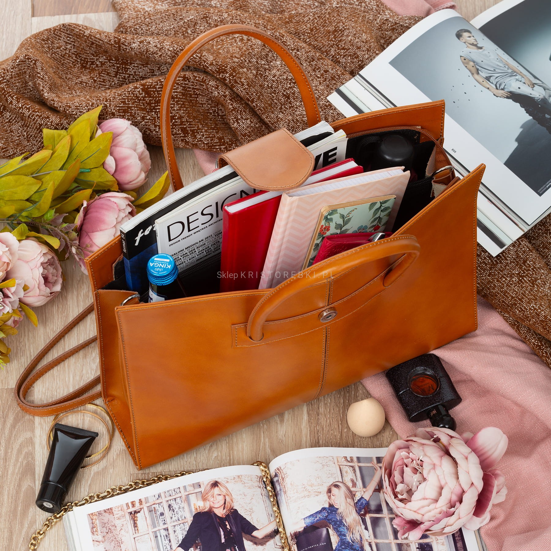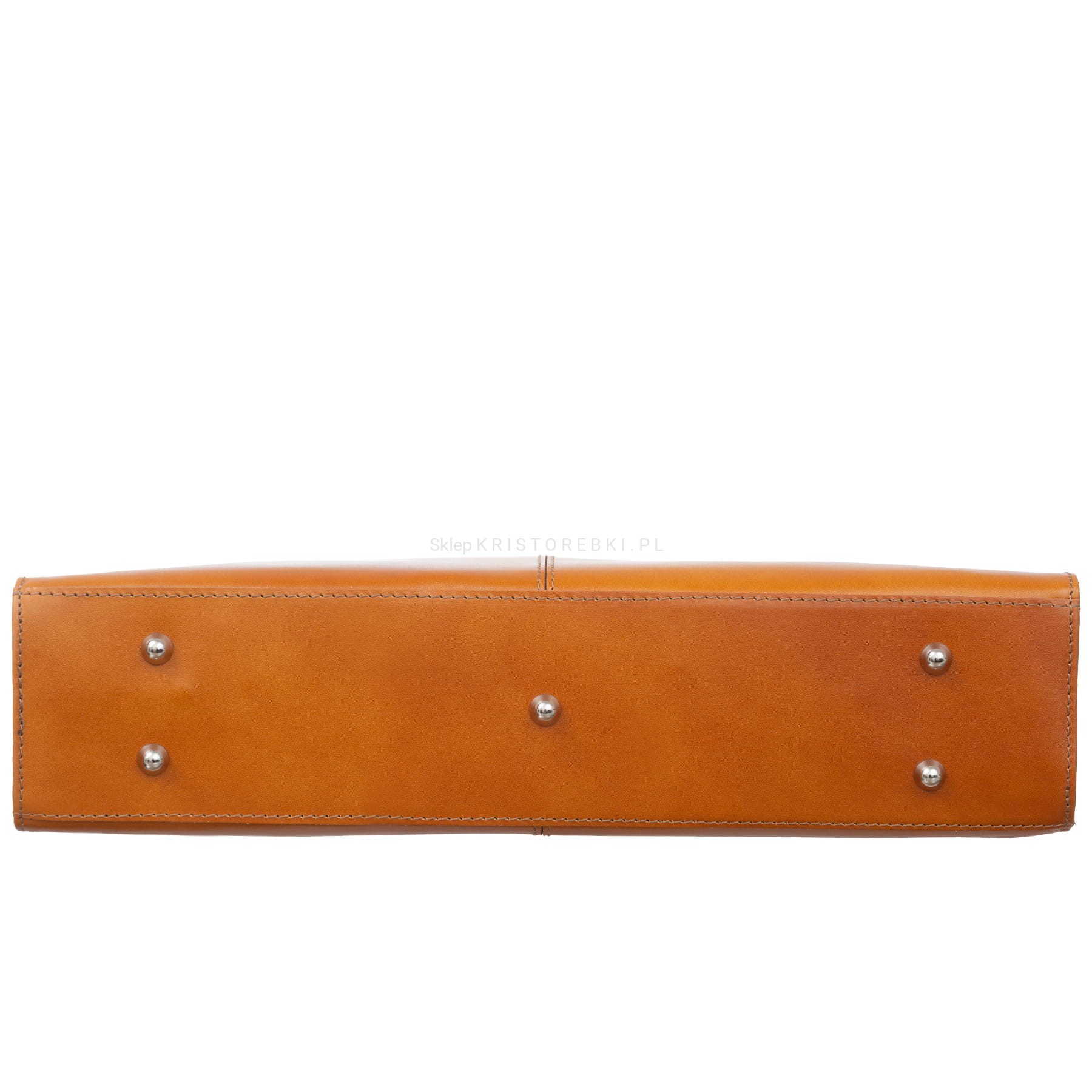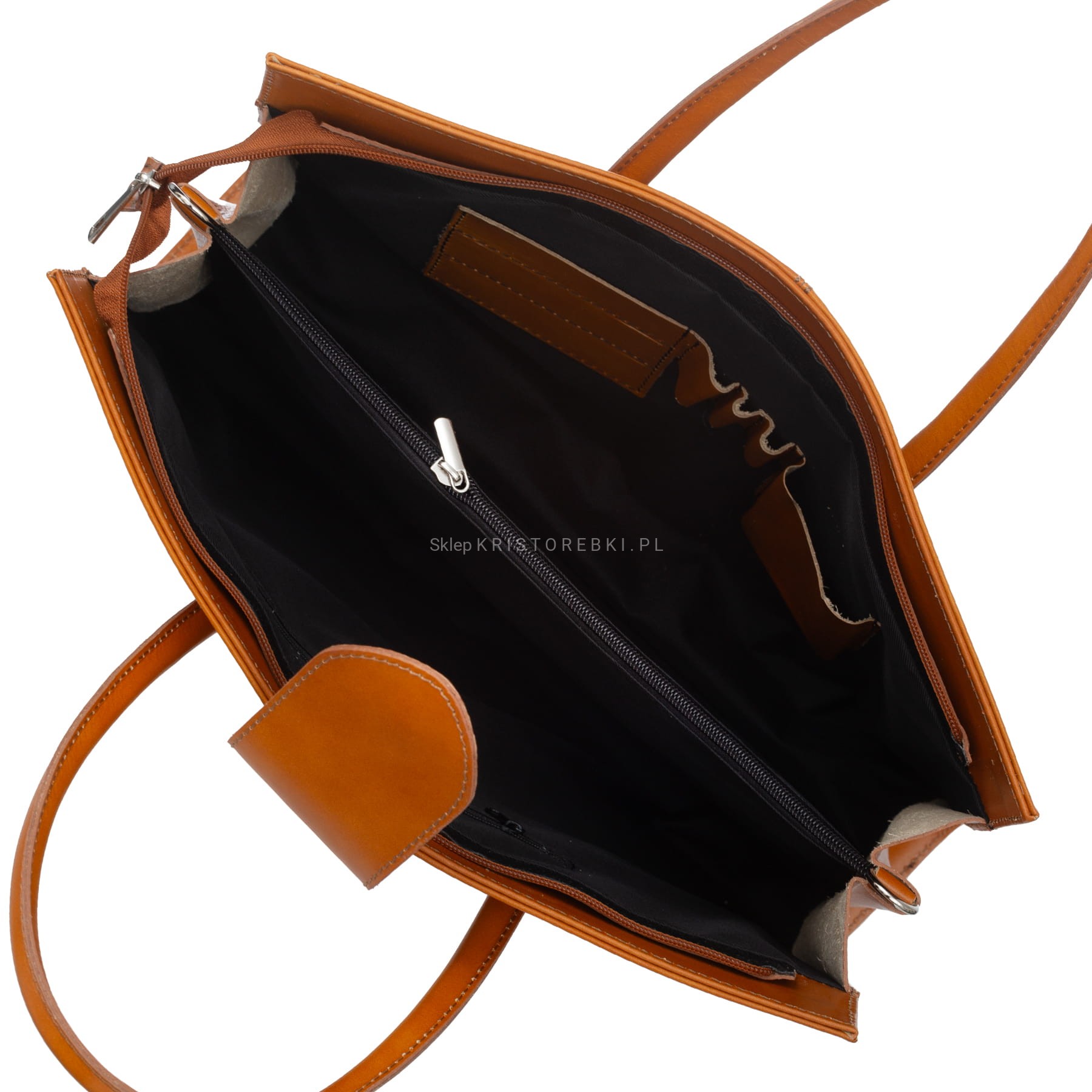 Sztywna klasyczna torebka damska znanej i cenionej na rynku europejskim marki VERA PELLE ITALY w kolorze CAMEL. Uszyta została bardzo starannie z najwyższej jakości, włoskiej i pachnącej gładkiej skóry naturalnej. Torebka jest bardzo elegancka, pojemna i praktyczna. Bez trudu pomieści sztywny format A4 lub laptopa o szerokości do 33 cm. Torebka posiada srebrne okucia i długie uszy do noszenia w ręku. Dodatkowo posada w zestawie długi i odpinany pasek o długości 97 cm, dzięki czemu można ją wygodnie nosić również na ramieniu. Dwukomorowy środek wykończony jest podszewką oraz zamykany na małą klapkę na magnesik oraz na solidny suwak. W środku znajduje się duża i biegnąca przez środek praktyczna przegroda zamykana na suwak. Na ściance bocznej znajduje się dodatkowa kieszonka zamykana na suwak a z drugiej strony mała otwarta kieszonka na telefon, praktyczny uchwyt na 3 długopisy oraz kieszonka na wizytówki lub dokumenty. Torebka jest sztywna i posiada dodatkowo usztywnione dno i nawet bez wypełnienia będzie świetnie trzymała swój kształt. Spód torebki dodatkowo chronią przed zarysowaniami nóżki ochronne. Torebka ta będzie świetnym dodatkiem do każdej eleganckiej i wyjściowej stylizacji.
