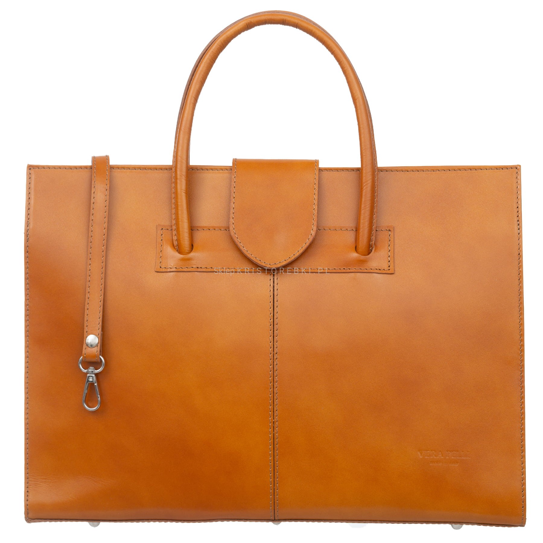 VERA PELLE torebka damska skórzana klasyczna elegancka sztywna teczka z paskiem na ramię V586 camel