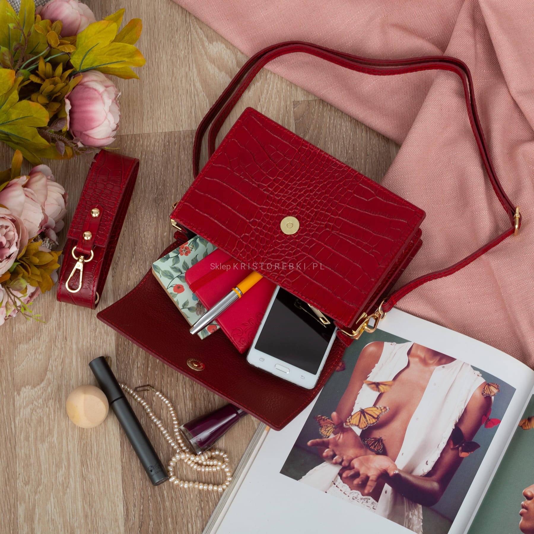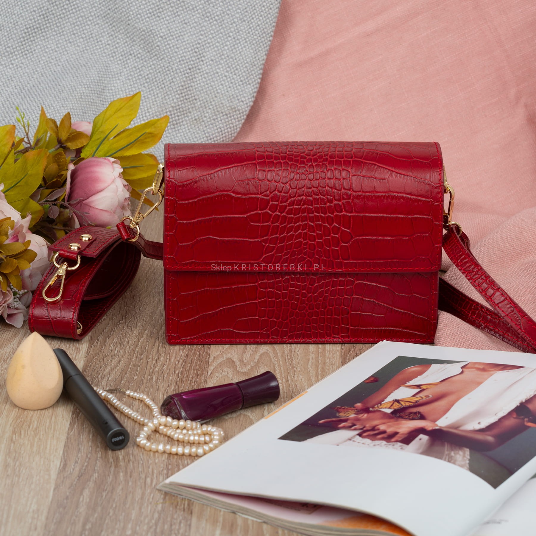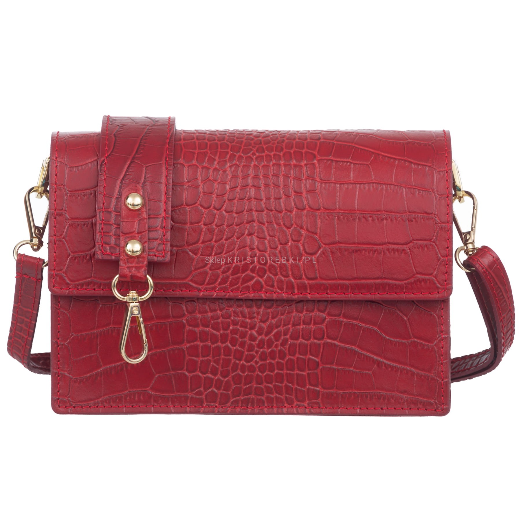VERA PELLE torebka damska skórzana listonoszka kroko z klapą i szerokim paskiem V587 bordowa