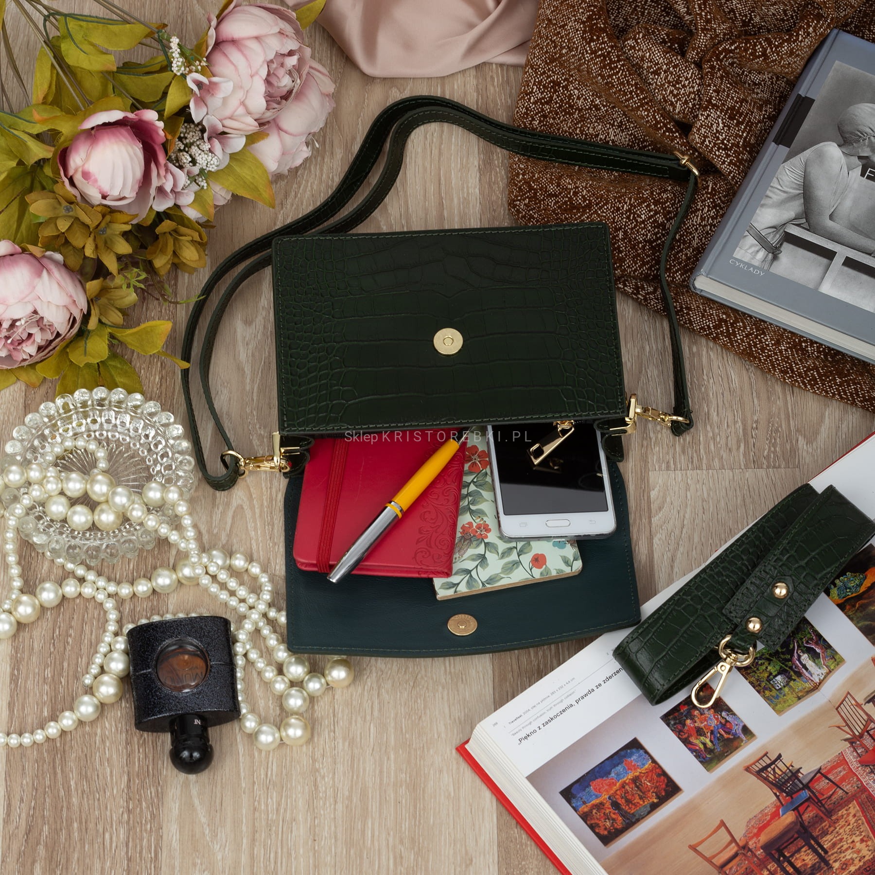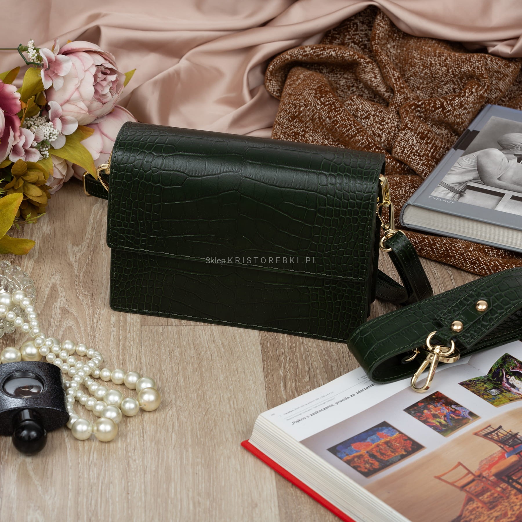 VERA PELLE torebka damska skórzana listonoszka kroko z klapą i szerokim paskiem V587 ciemna zielona
