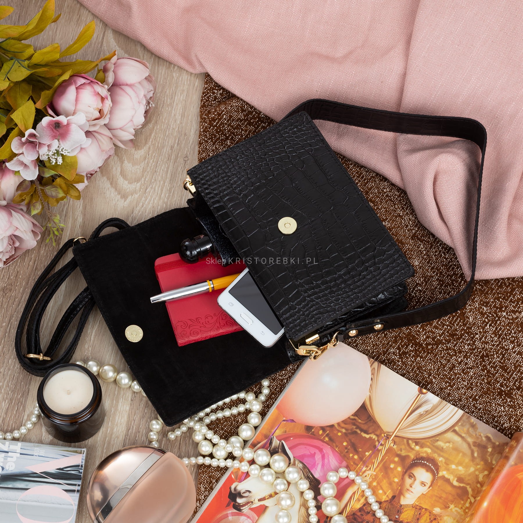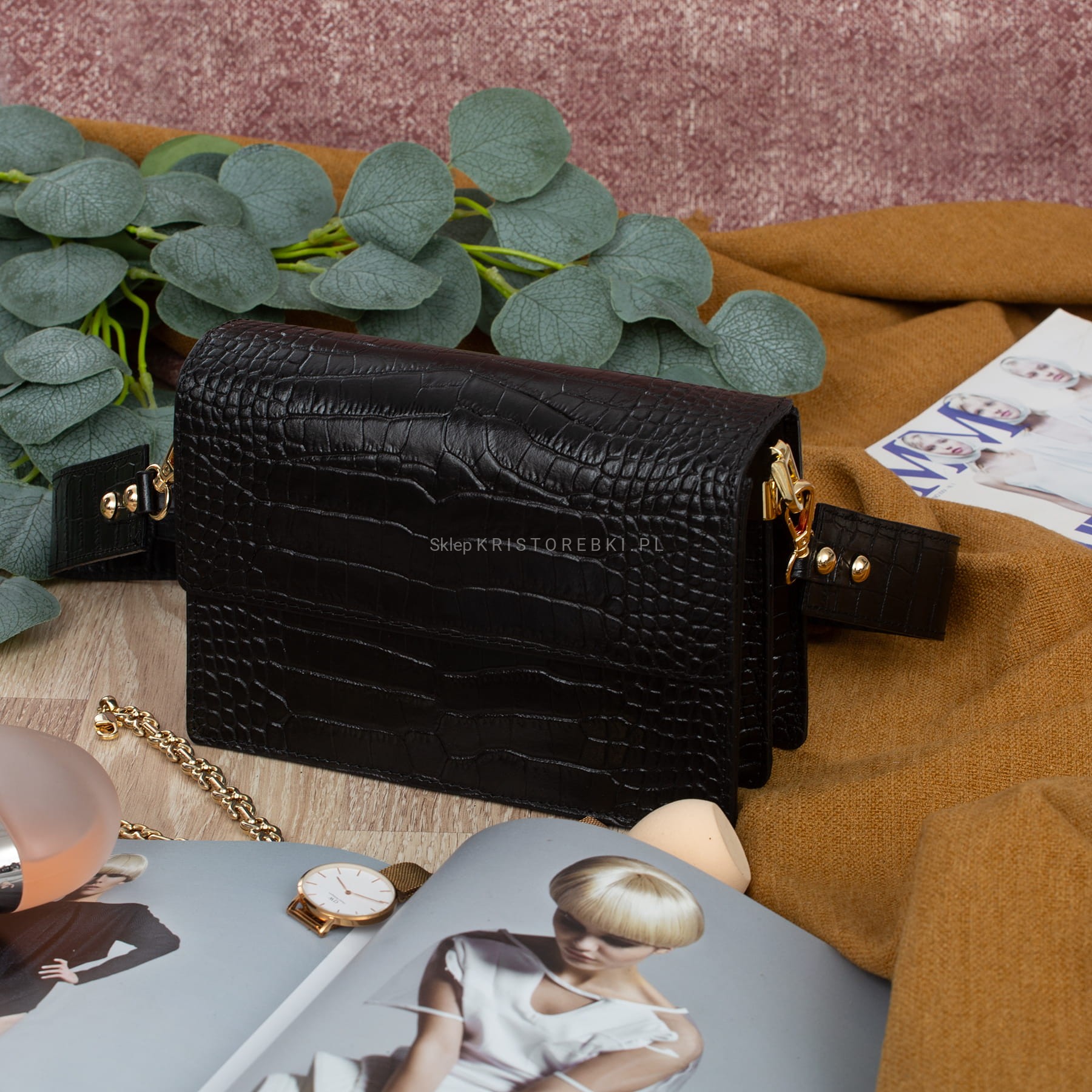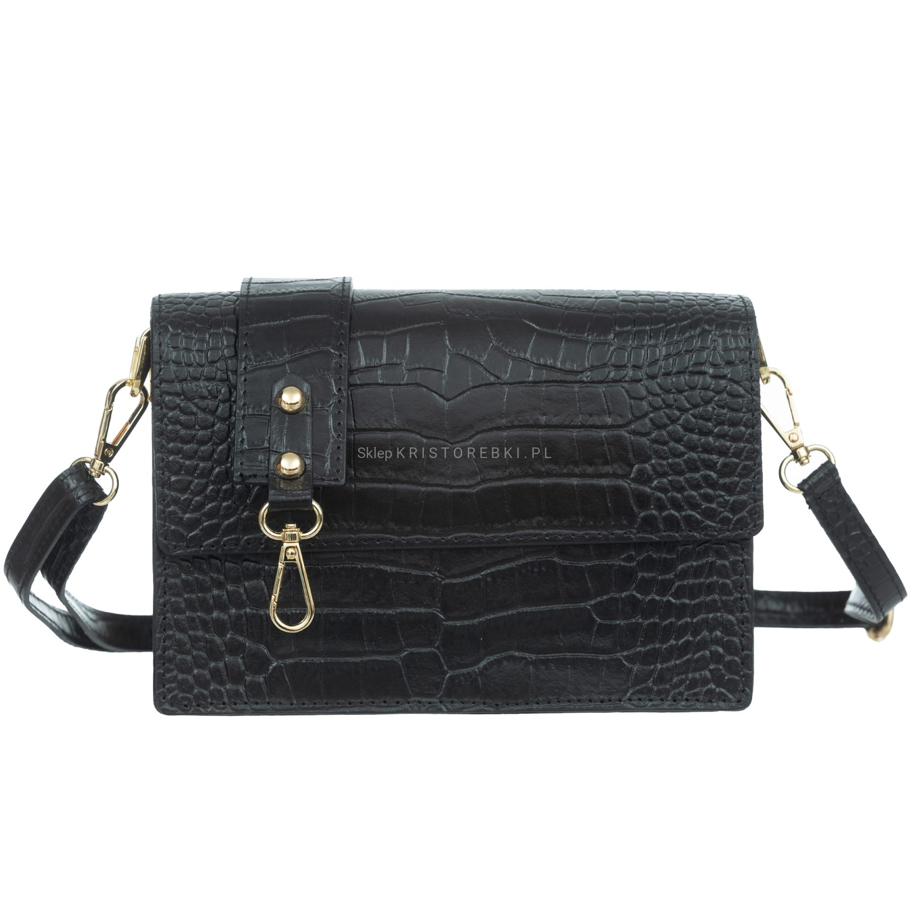 VERA PELLE torebka damska skórzana listonoszka kroko z klapą i szerokim paskiem V587 czarna