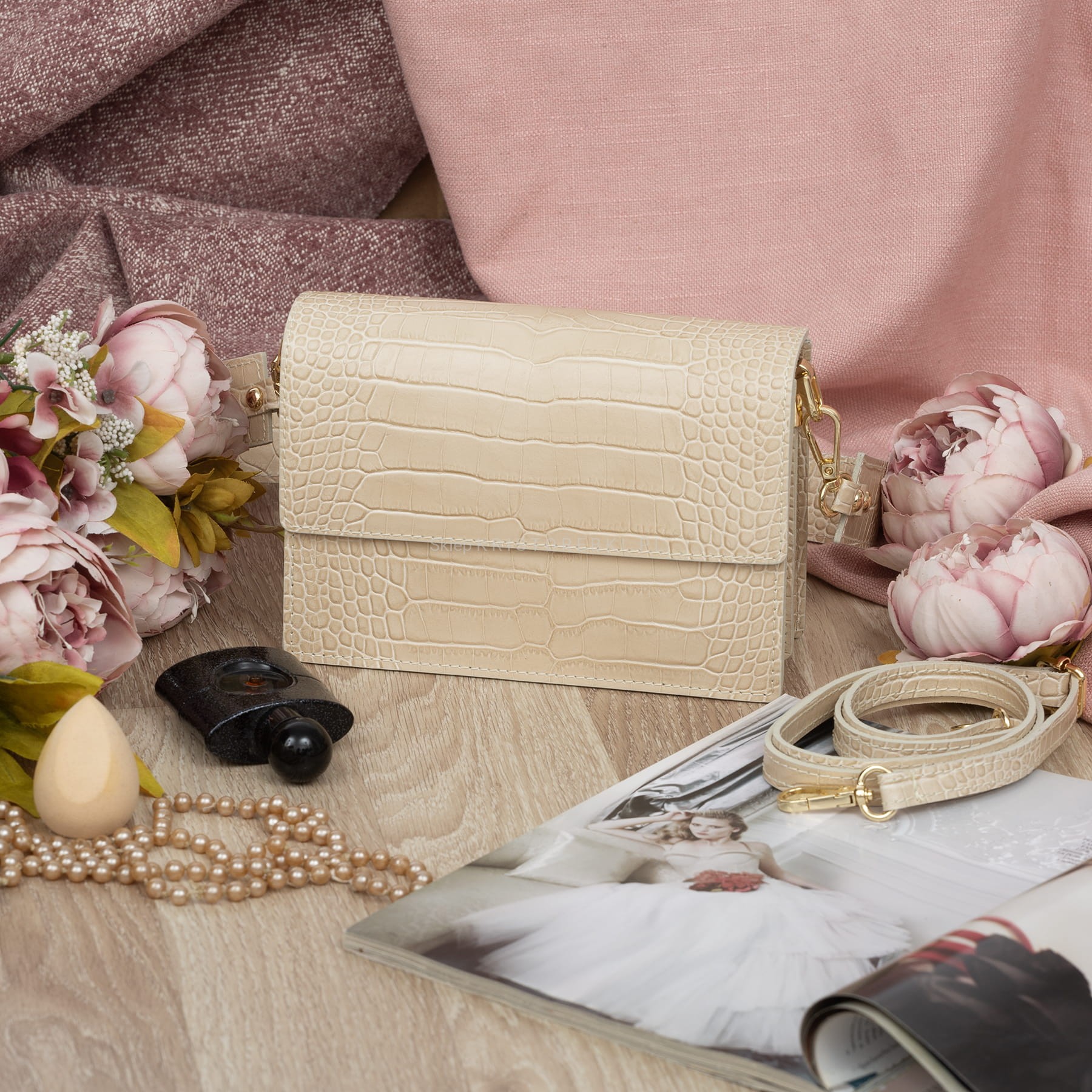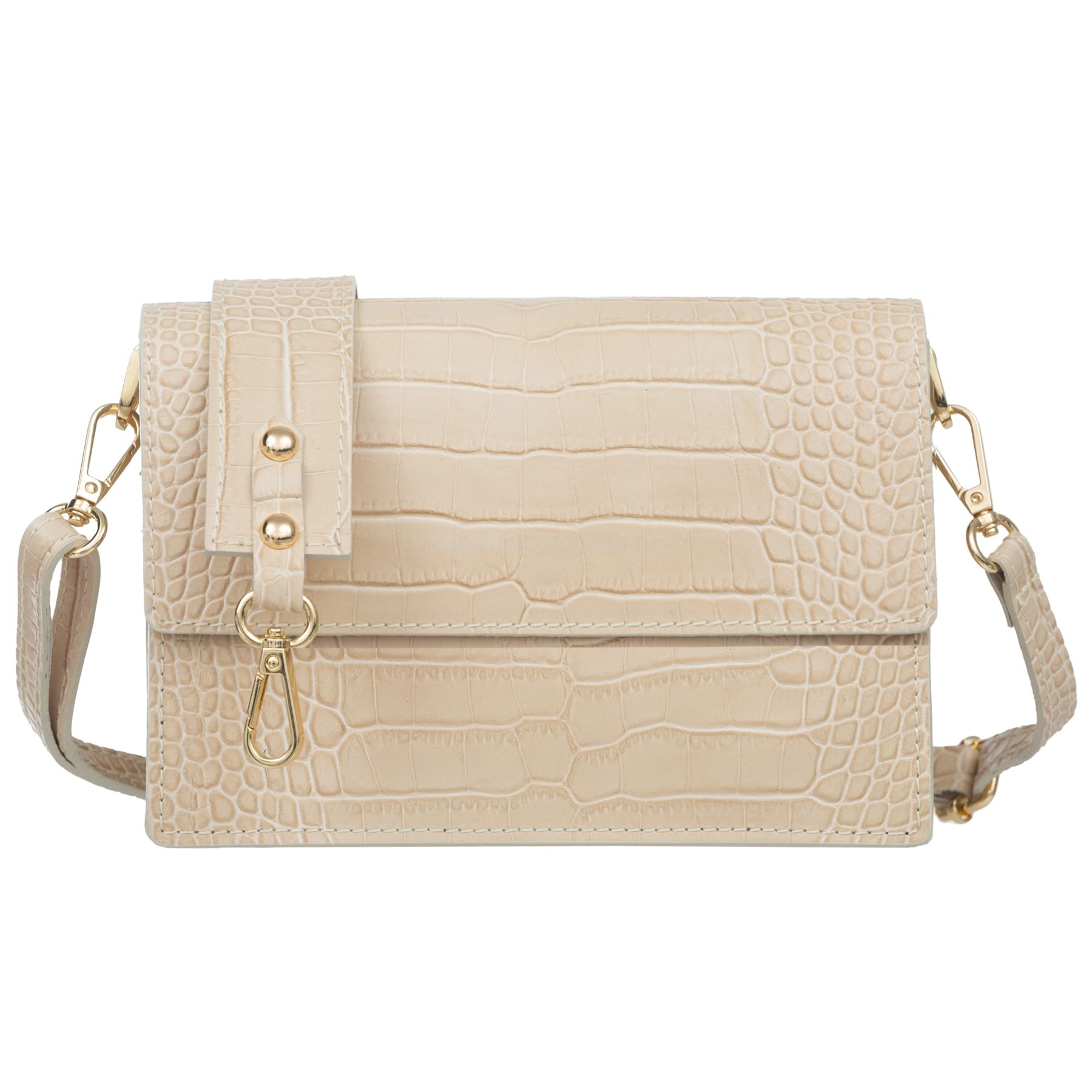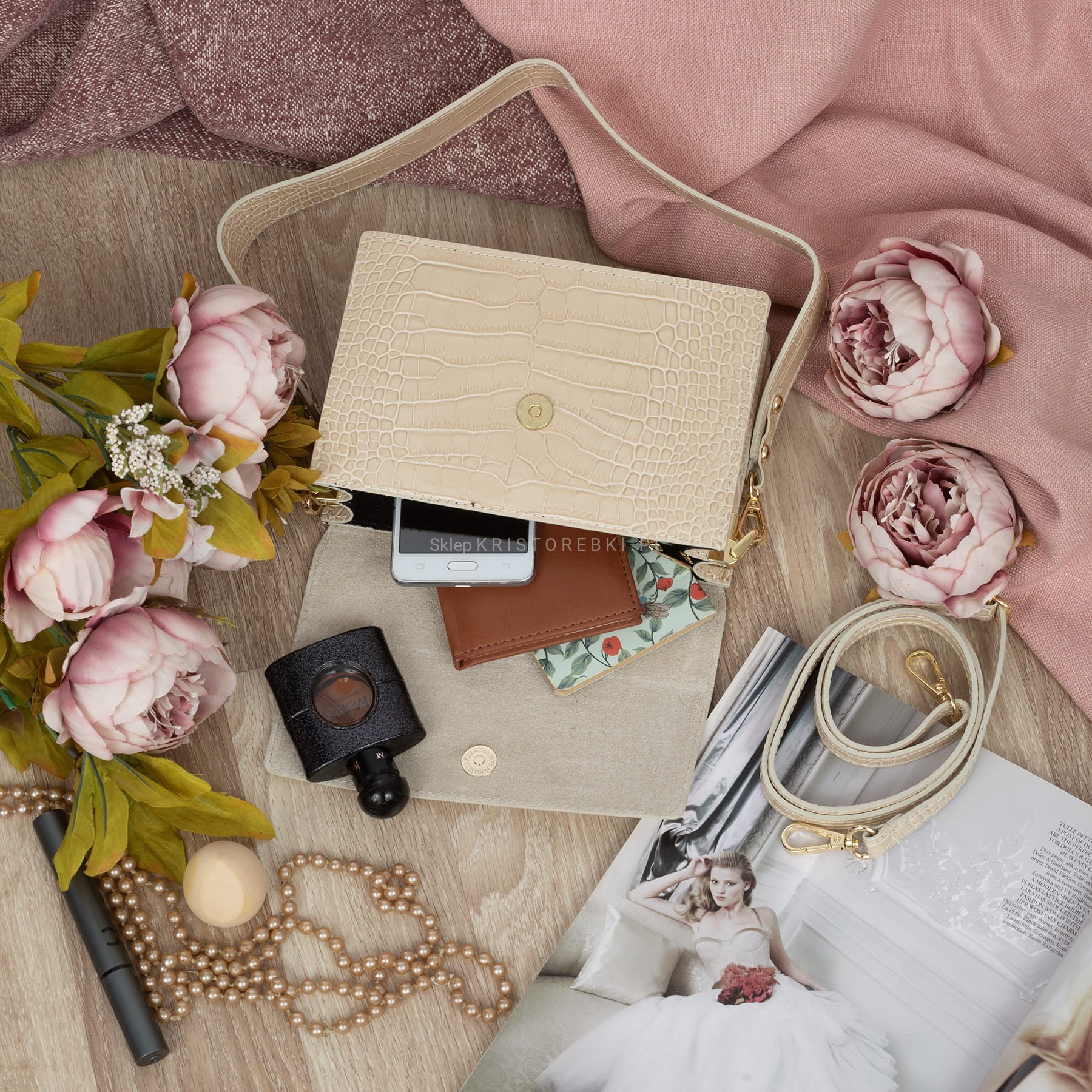 VERA PELLE torebka damska skórzana listonoszka kroko z klapą i szerokim paskiem V587 kremowa