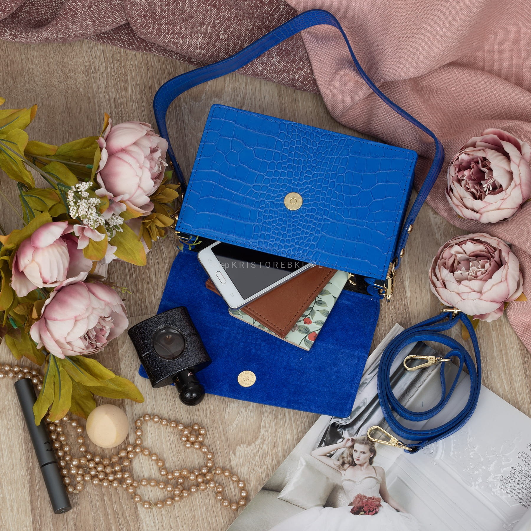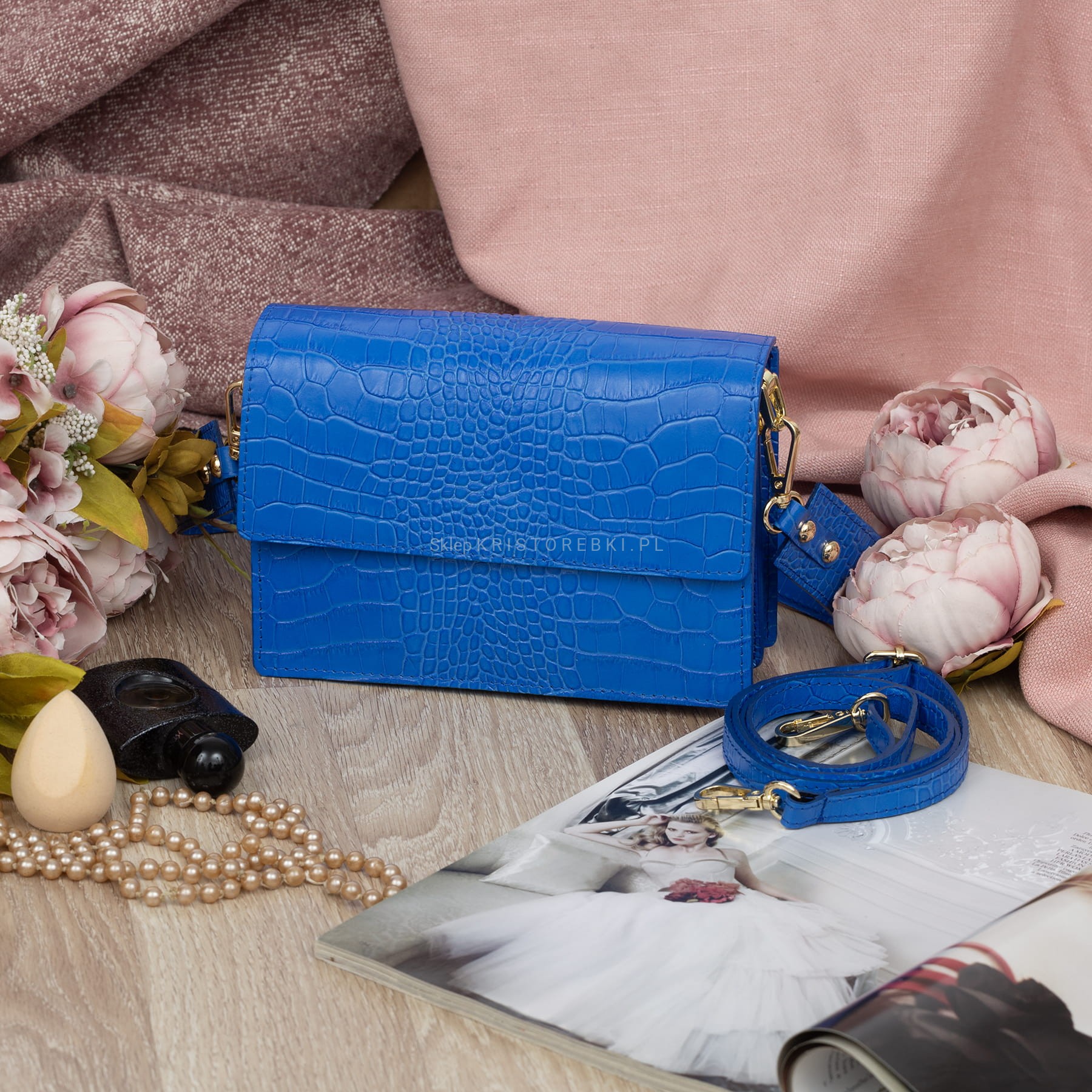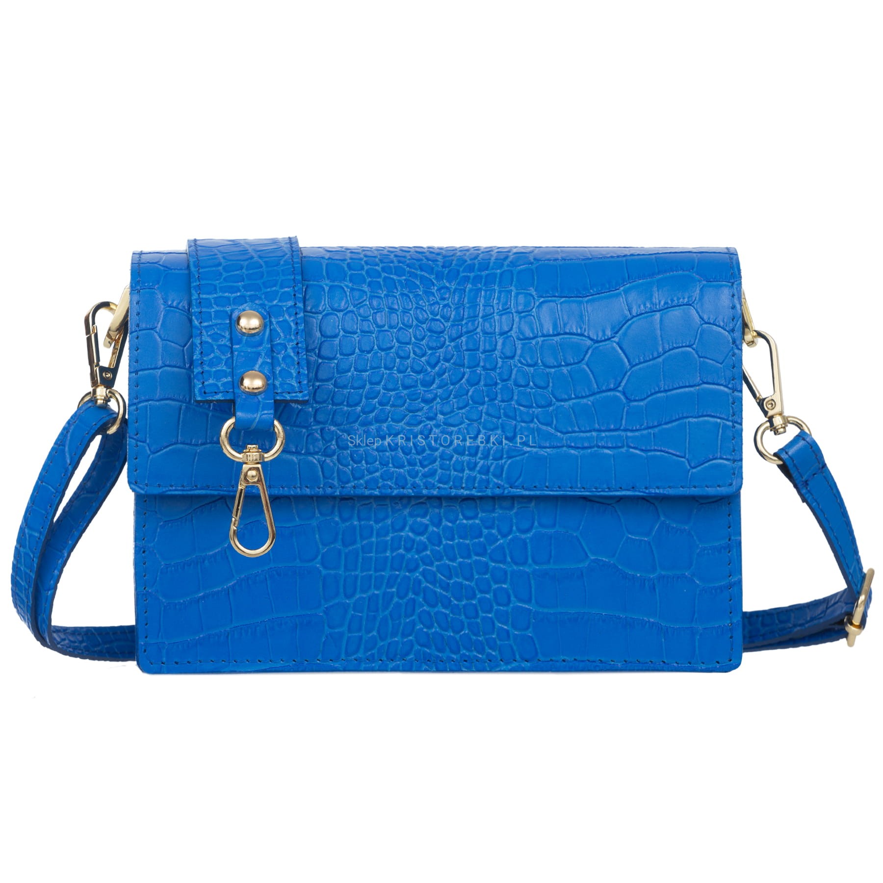 VERA PELLE torebka damska skórzana listonoszka kroko z klapą i szerokim paskiem V587 niebieska