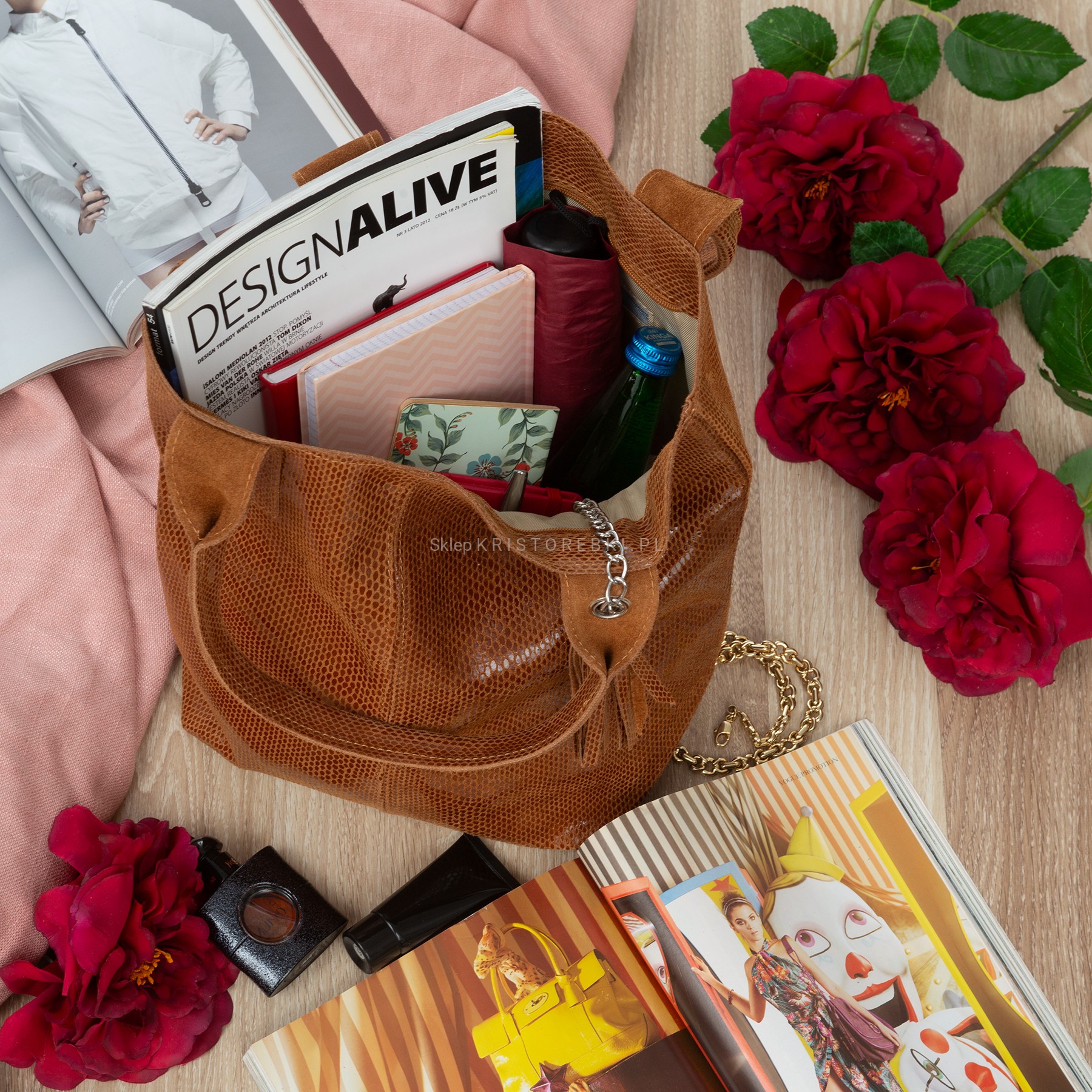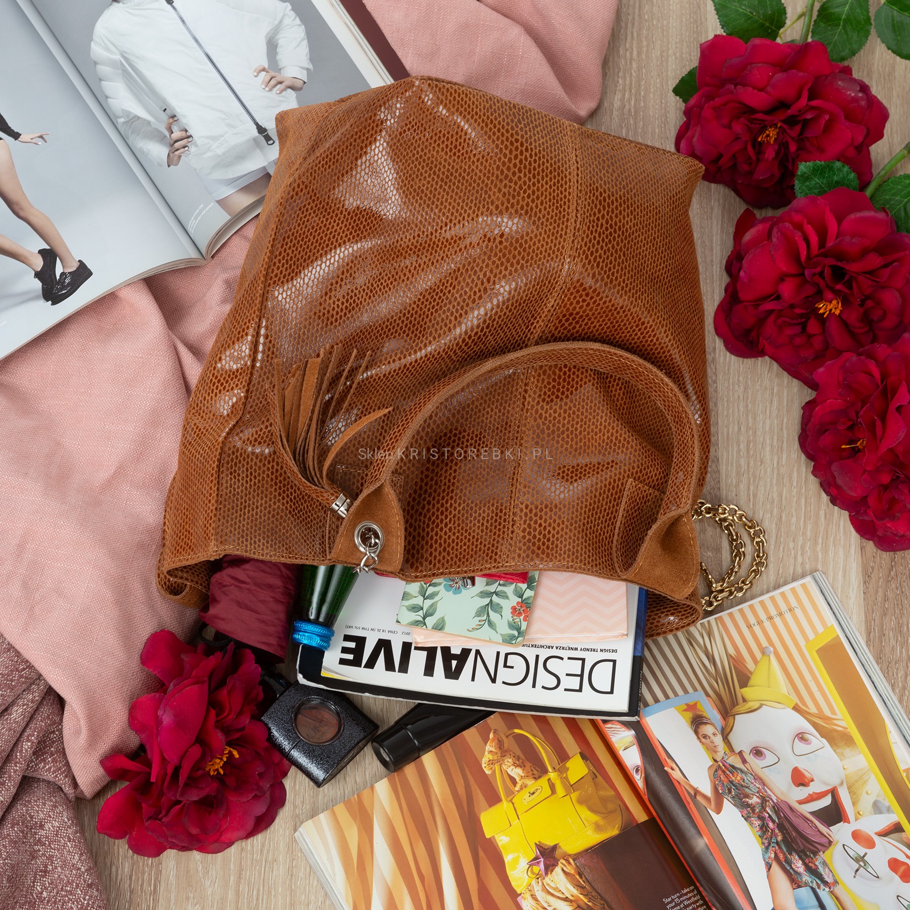 Torebka damska typu shopper znanej i cenionej na rynku europejskim marki VERA PELLE ITALY w kolorze CAMEL. Uszyta została bardzo starannie z najwyższej jakości lakierowanej i pachnącej skóry naturalnej. Torebka posiada bardzo modny i ponadczasowy wężowy wzór oraz długie uszy, dzięki czemu możesz ją wygodnie nosić w ręku jak również na ramieniu. Posiada srebrne okucia i zamykana jest na solidny suwak. Jednokomorowy środek wykończony jest podszewką a na ściance bocznej znajduje się praktyczna kieszonka zamykana na suwak na telefon, klucze lub dokumenty. Dodatkowo do torebki dołączona została przyczepiona na łańcuszku saszetka zamykana na suwak i ozdobny breloczek z frędzelkiem. Torebka jest bardzo pojemna i praktyczna. Będzie świetnym dodatkiem do każdej codziennej stylizacji.