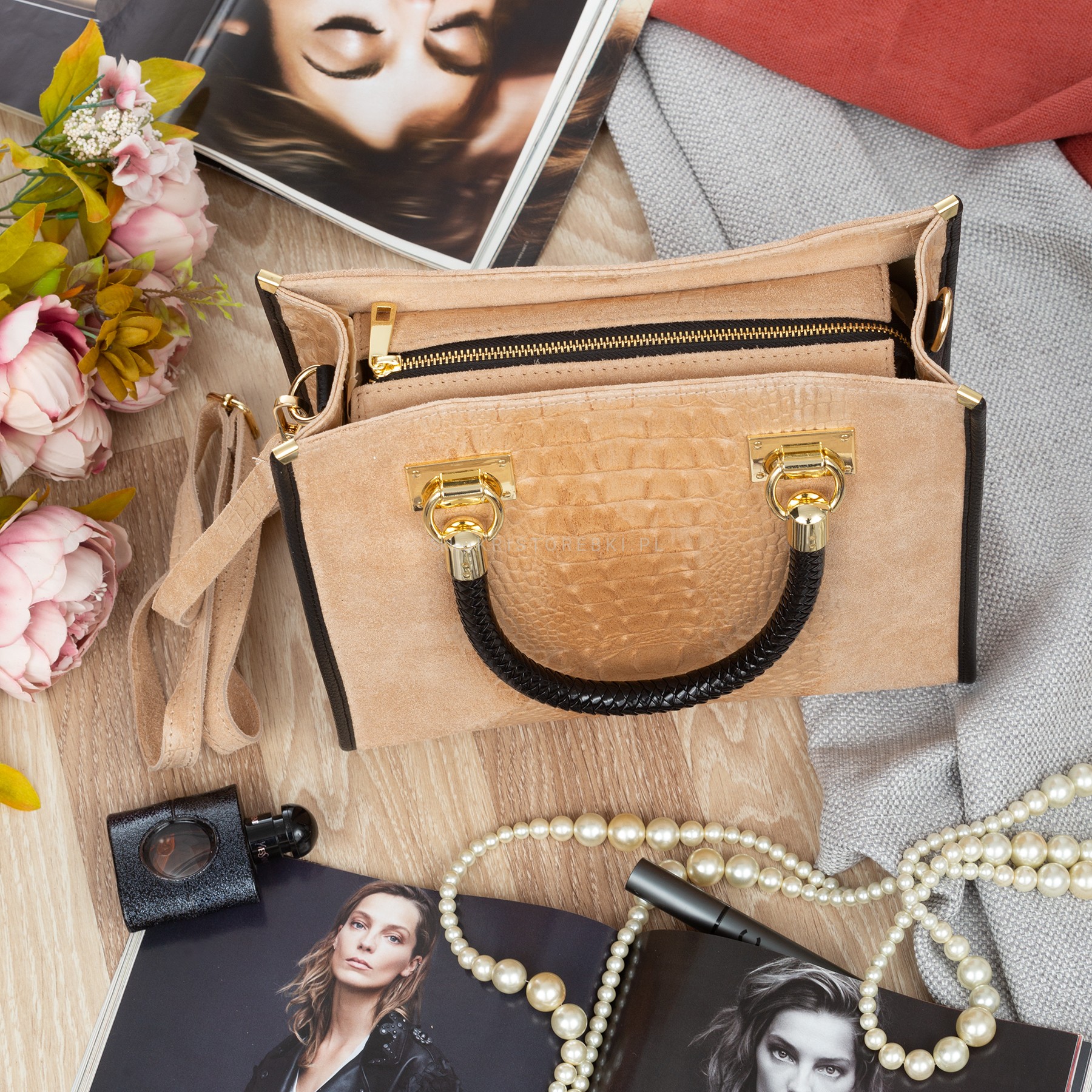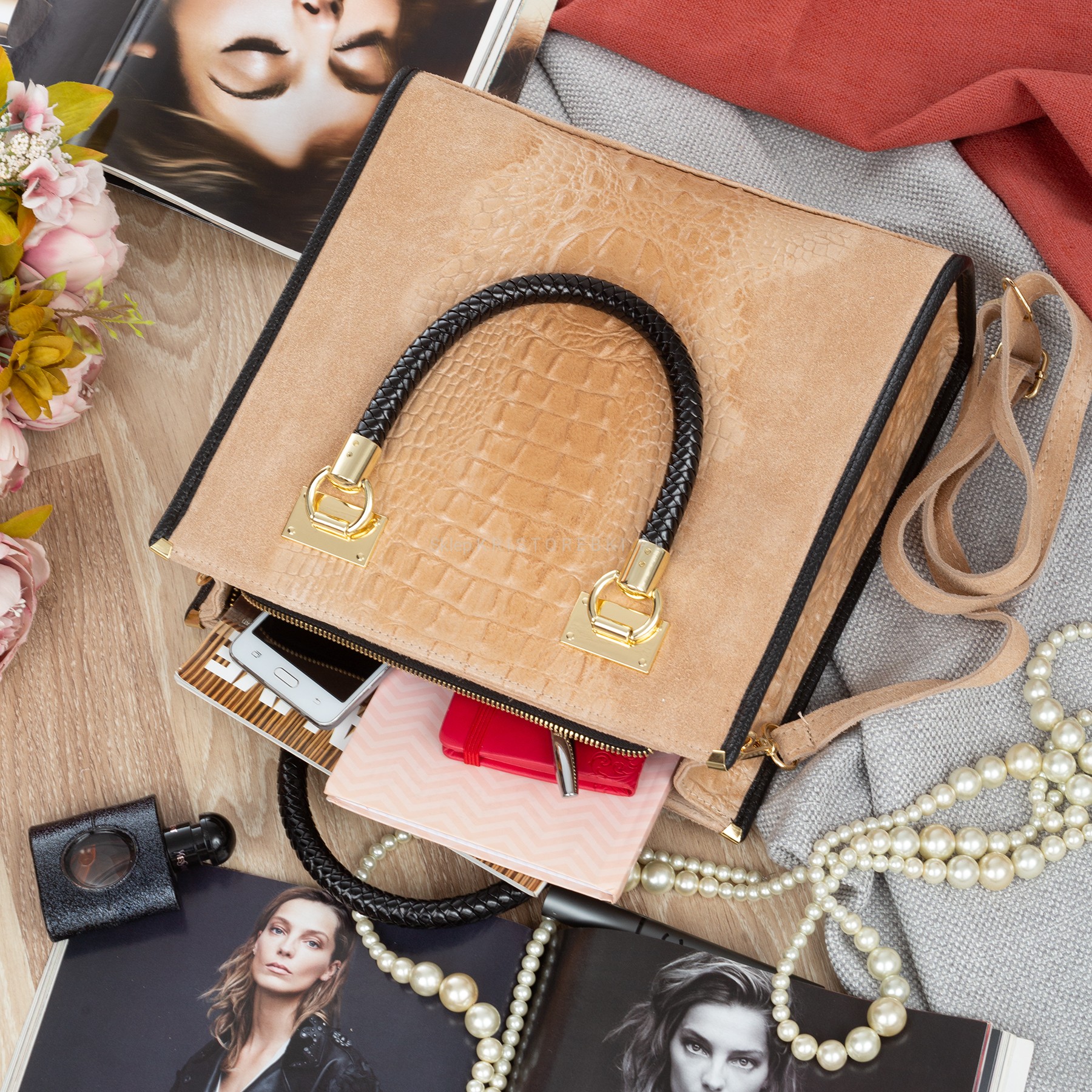 VERA PELLE torebka damska zamszowa klasyczna kroko z paskiem na ramię V602 beżowa