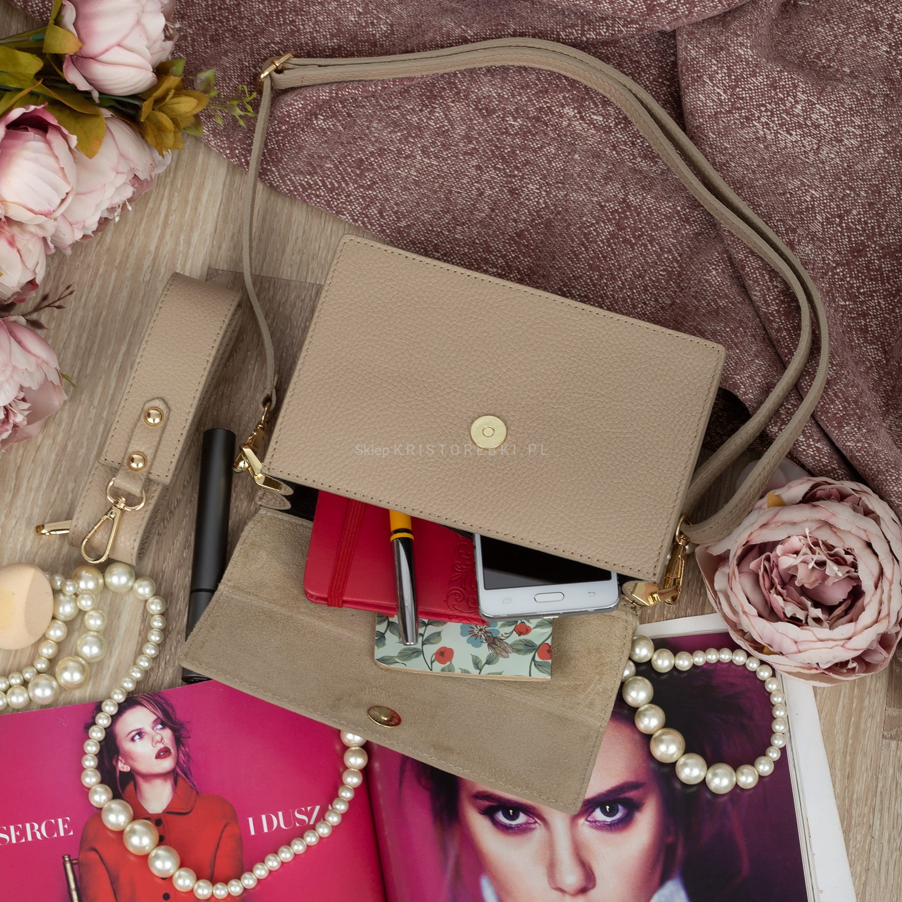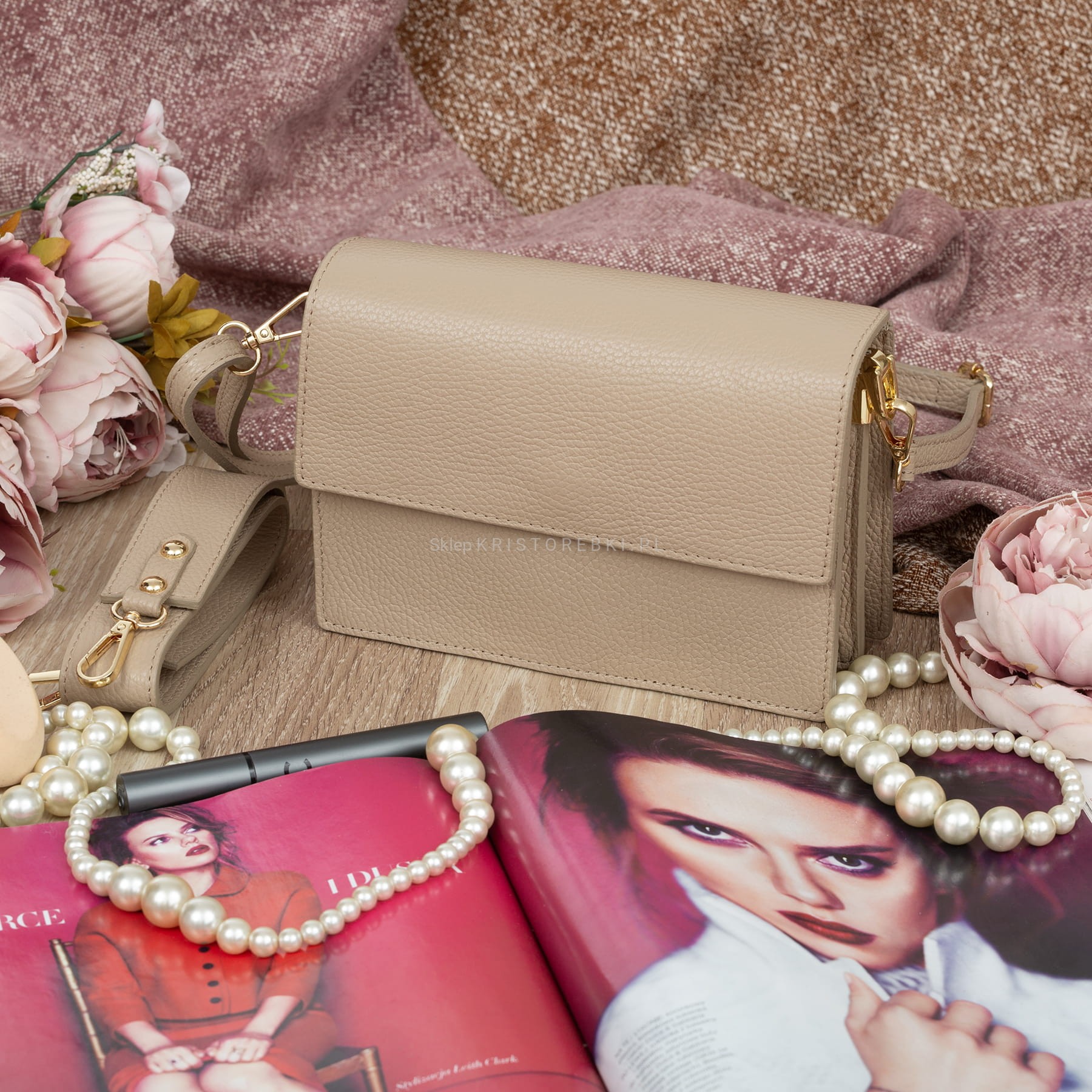 VERA PELLE torebka damska skórzana listonoszka z klapą i szerokim paskiem V606 beżowa