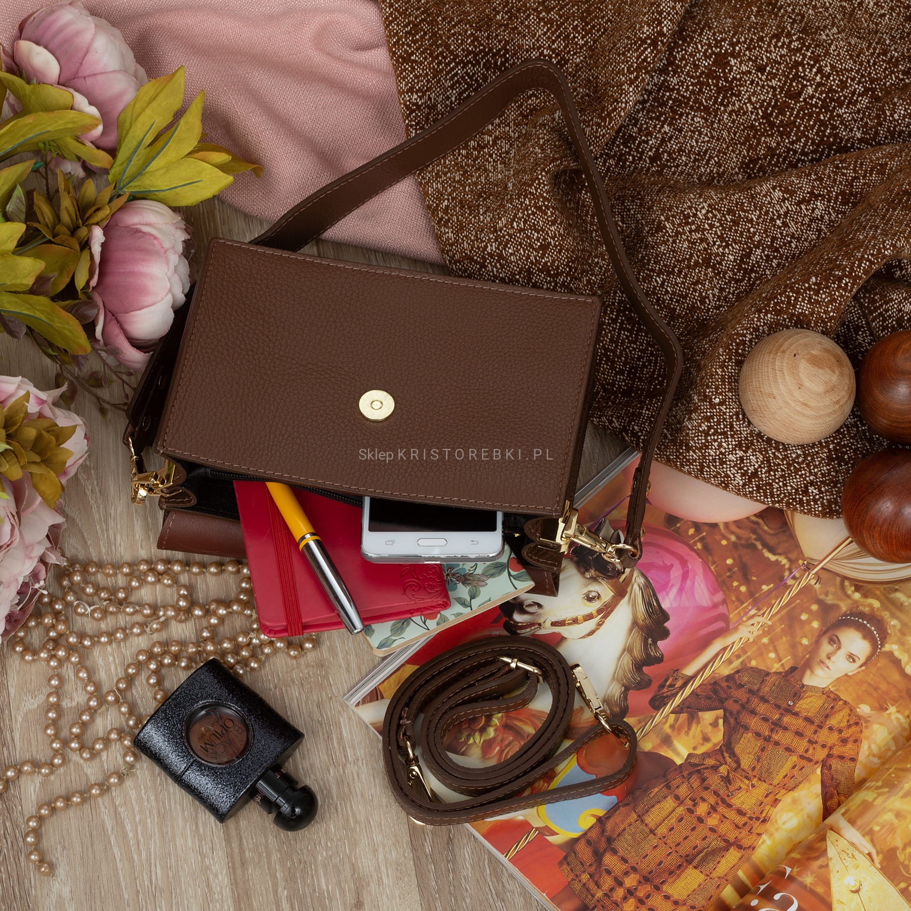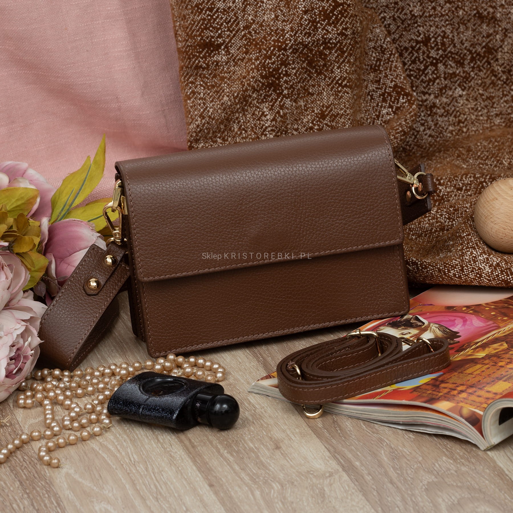 VERA PELLE torebka damska skórzana listonoszka z klapą i szerokim paskiem V606 brązowa