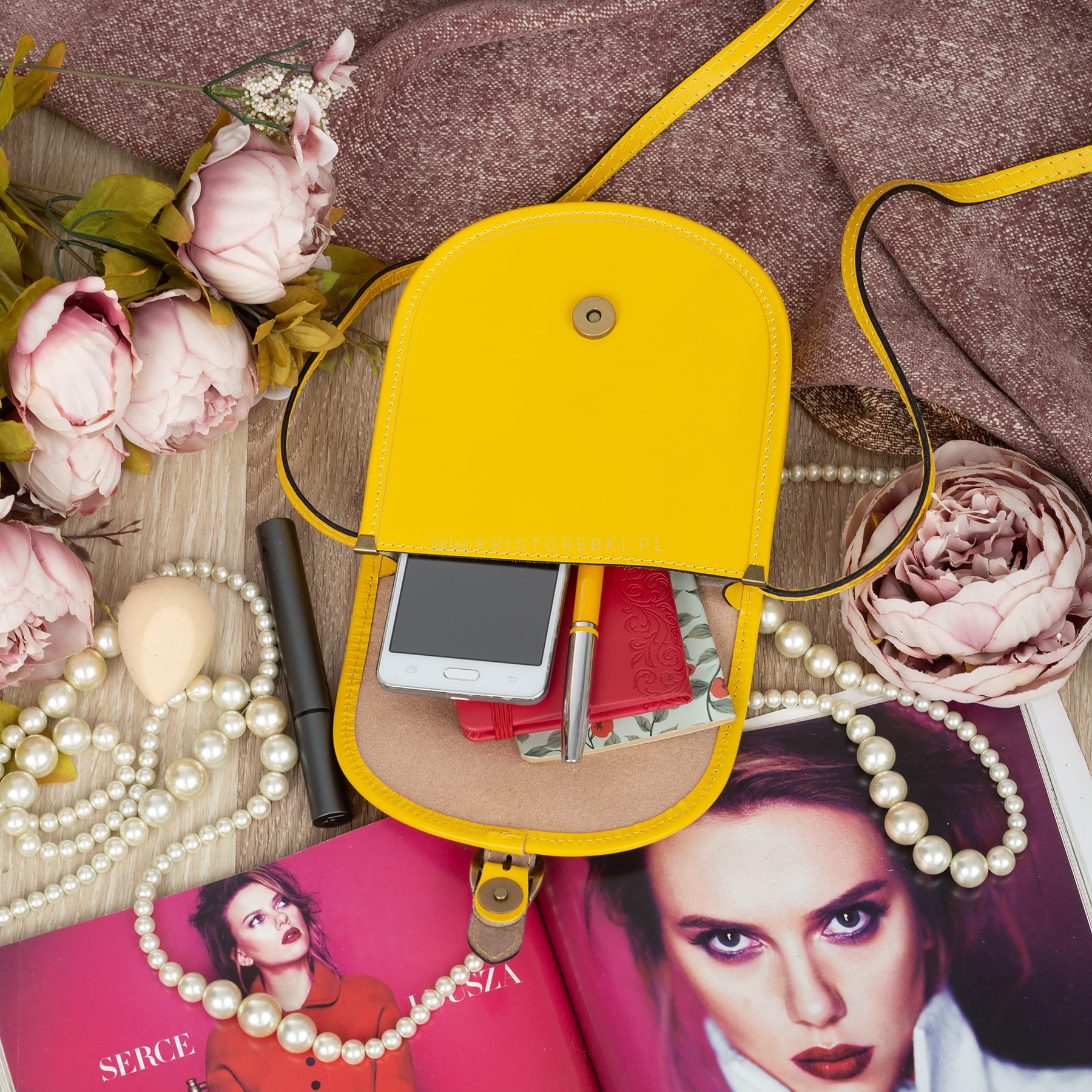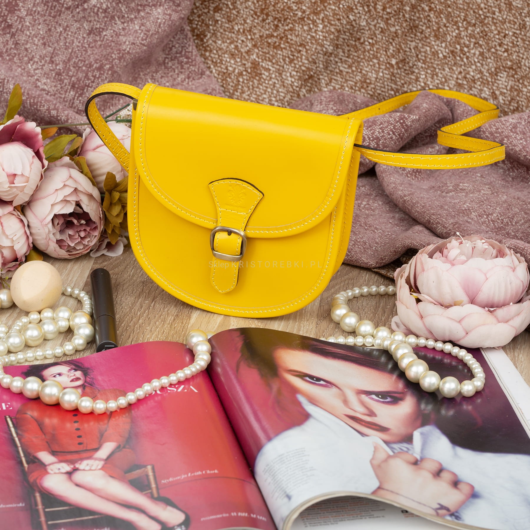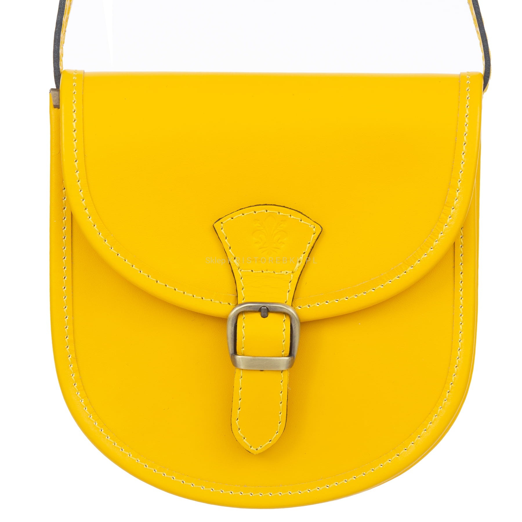 Torebka damska, listonoszka znanej i cenionej marki VERA PELLE ITALY w kolorze ŻÓŁTYM. Torebka wykonana jest z najwyższej jakości skóry naturalnej licowej produkcji włoskiej. Zaletą torebki jest jej nietuzinkowy wygląd oraz ciekawa zaokrąglona przednia klapa. Posiada mosiężne okucia oraz zamykana jest na praktyczny magnesik. Torebka jest usztywniona, dzięki czemu nawet bez wypełnienia pięknie trzyma swój kształt. Jest mała (nie mieści formatu A4) i zgrabna, dzięki czemu będzie praktyczna w użytkowaniu i sprawdzi się na wszystkie eleganckie jak i mniej formalne wyjścia. Mimo niedużego rozmiaru bez trudu pomieści wszystkie najpotrzebniejsze rzeczy damskie. W środku posiada dodatkową kieszonkę zamykaną na suwak na drobiazgi. Posiada długi i regulowany pasek, dzięki czemu bez trudu dopasujesz ja do swoich preferencji.