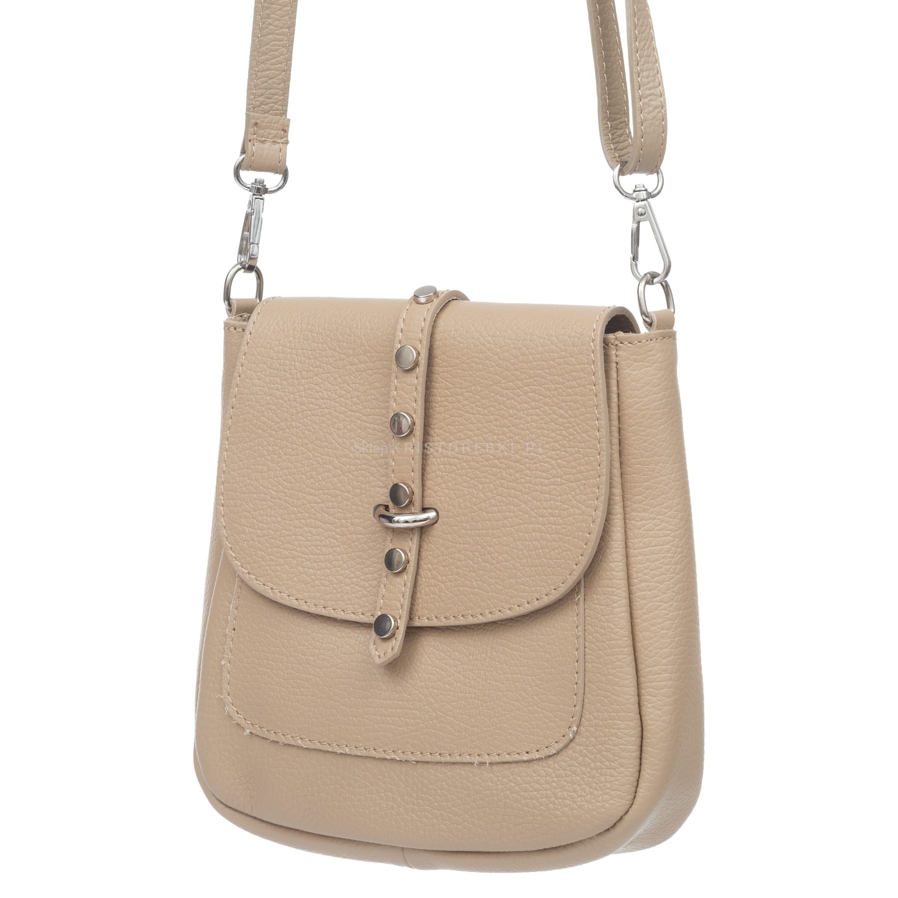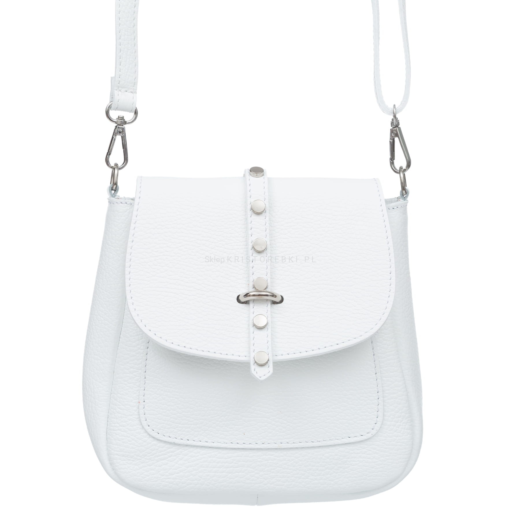 Torebka damska listonoszka znanej i cenionej na rynku europejskim marki VERA PELLE ITALY w kolorze BIAŁYM. Uszyta została bardzo starannie z najwyższej jakości włoskiej skóry naturalnej z widoczną fakturą. Posiada w zestawie odpinany i regulowany pasek o maksymalnej długości 120 cm do wygodnego noszenia na ramieniu. Torebka posiada srebrne okucia i zamykana jest na praktyczną klapę z przewlekanym paseczkiem z ozdobnymi ćwiekami. Jednokomorowy środek zamykany jest dodatkowo na wygodny suwak i wykończony estetyczną podszewką. Dodatkowo w środku znajdziesz praktyczną kieszonkę zamykaną na suwak na telefon lub drobiazgi. Z tyłu torebki znajduje się kolejna praktyczna kieszeń zamykana na suwak. Torebka jest wygodna, praktyczna i dosyć sztywna dzięki czemu nawet bez wypełnienia ładnie prezentuje swój kształt. Będzie świetnym dodatkiem do codziennych i wyjściowych stylizacji.