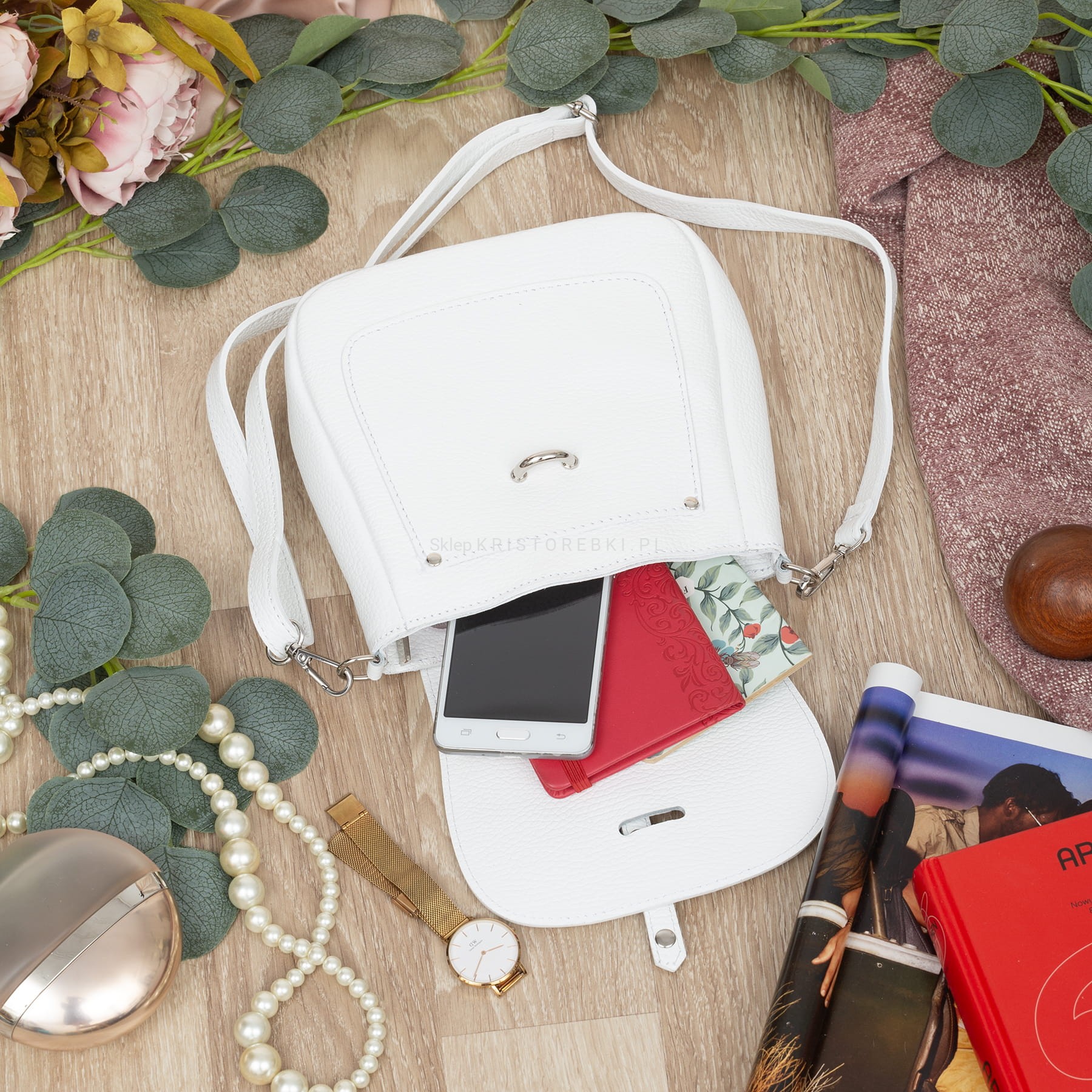 VERA PELLE torebka damska skórzana listonoszka z klapą i paskiem na ramię V645 biała