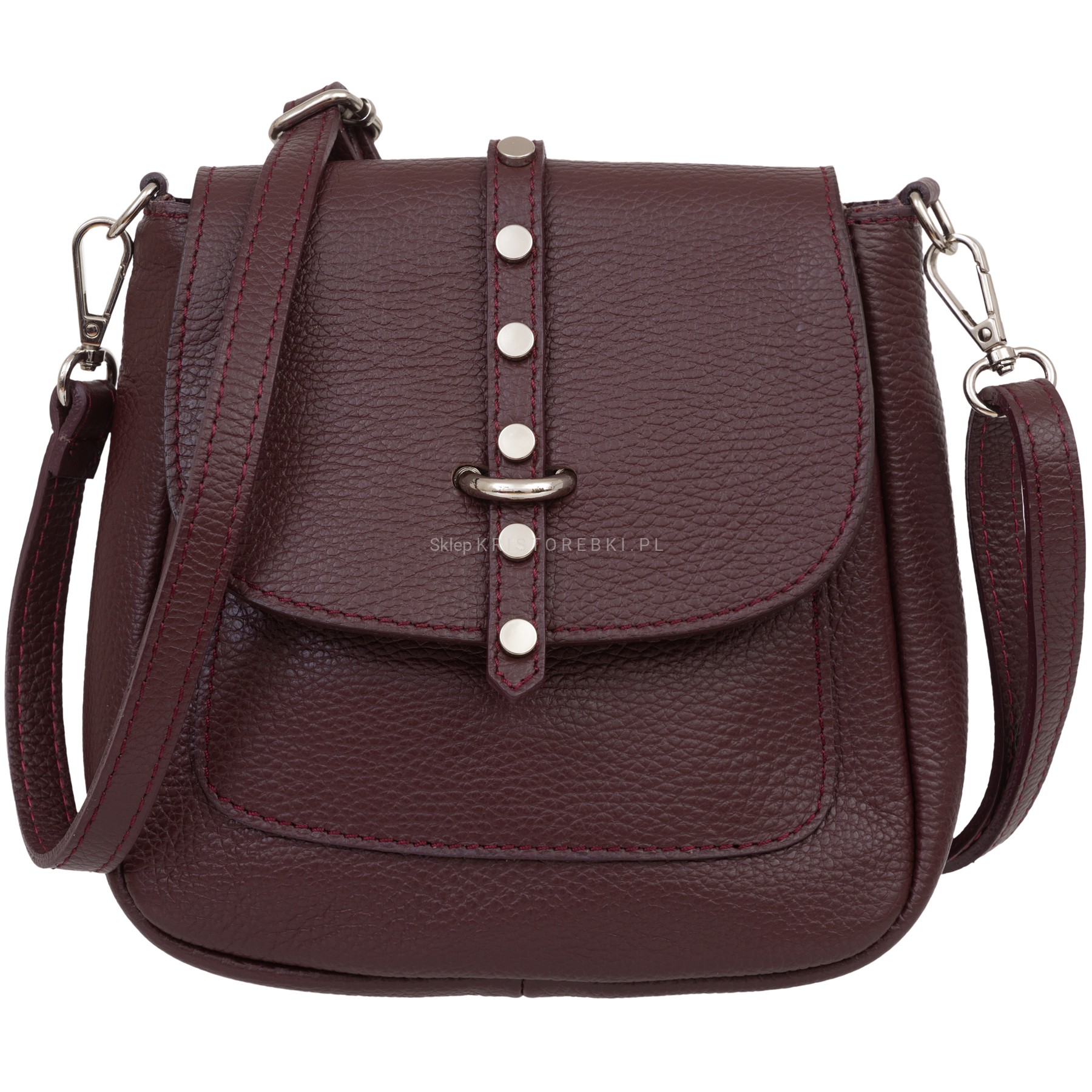 Torebka damska listonoszka znanej i cenionej na rynku europejskim marki VERA PELLE ITALY w kolorze CIEMNEGO BORDO. Uszyta została bardzo starannie z najwyższej jakości włoskiej skóry naturalnej z widoczną fakturą. Posiada w zestawie odpinany i regulowany pasek o maksymalnej długości 120 cm do wygodnego noszenia na ramieniu. Torebka posiada srebrne okucia i zamykana jest na praktyczną klapę z przewlekanym paseczkiem z ozdobnymi ćwiekami. Jednokomorowy środek zamykany jest dodatkowo na wygodny suwak i wykończony estetyczną podszewką. Dodatkowo w środku znajdziesz praktyczną kieszonkę zamykaną na suwak na telefon lub drobiazgi. Z tyłu torebki znajduje się kolejna praktyczna kieszeń zamykana na suwak. Torebka jest wygodna, praktyczna i dosyć sztywna dzięki czemu nawet bez wypełnienia ładnie prezentuje swój kształt. Będzie świetnym dodatkiem do codziennych i wyjściowych stylizacji.