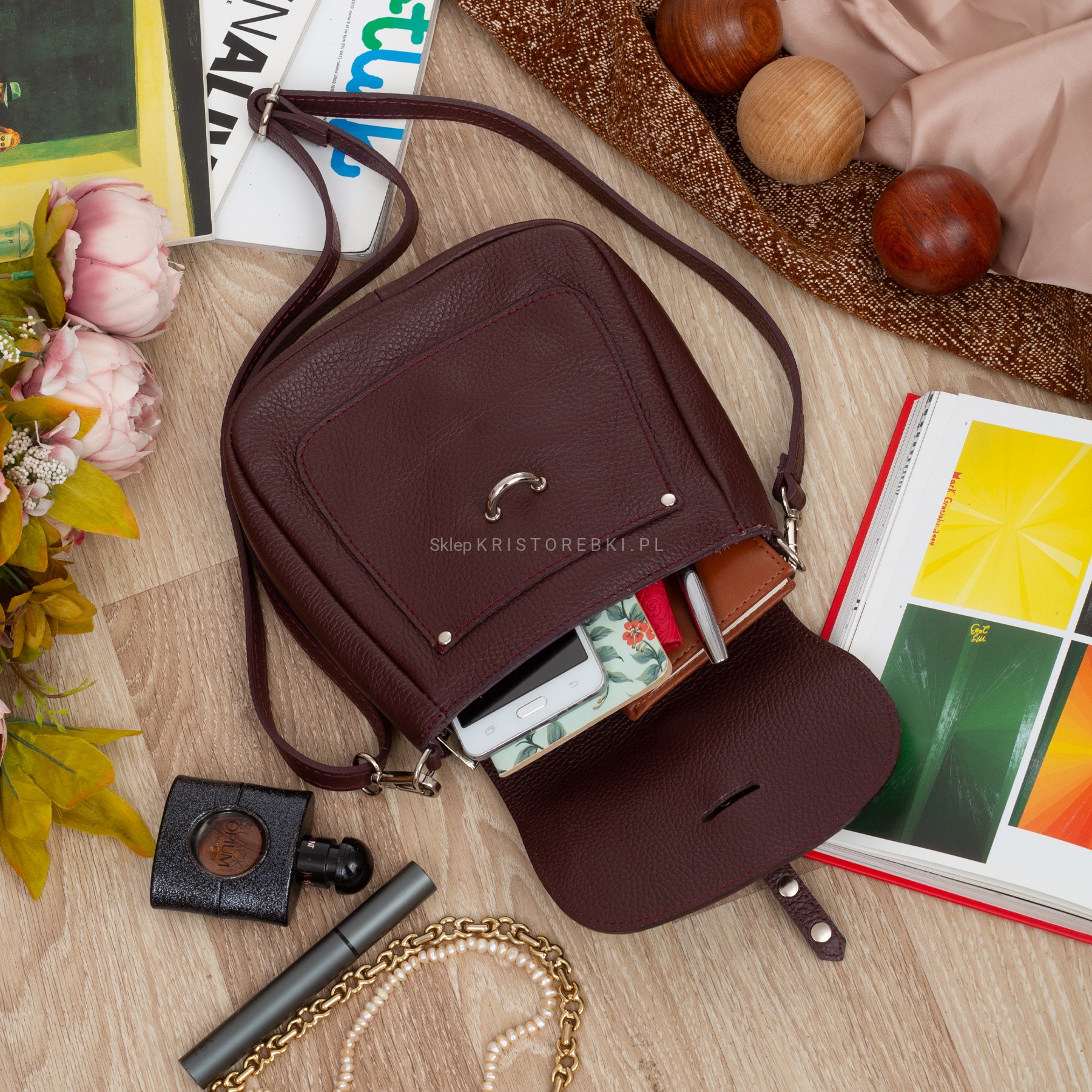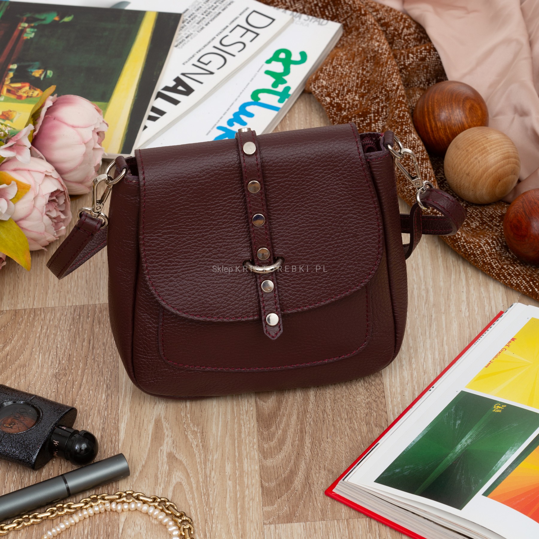 VERA PELLE torebka damska skórzana listonoszka z klapą i paskiem na ramię V645 ciemna bordowa