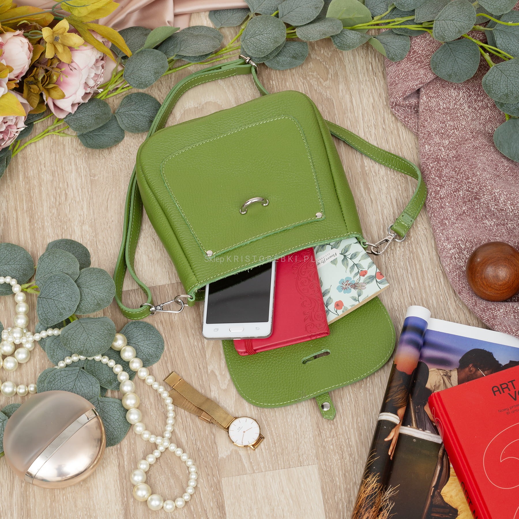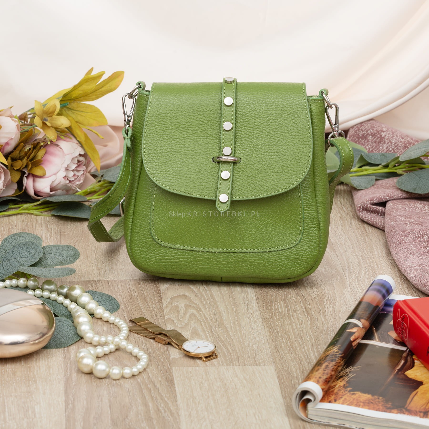 VERA PELLE torebka damska skórzana listonoszka z klapą i paskiem na ramię V645 ciemna limonkowa