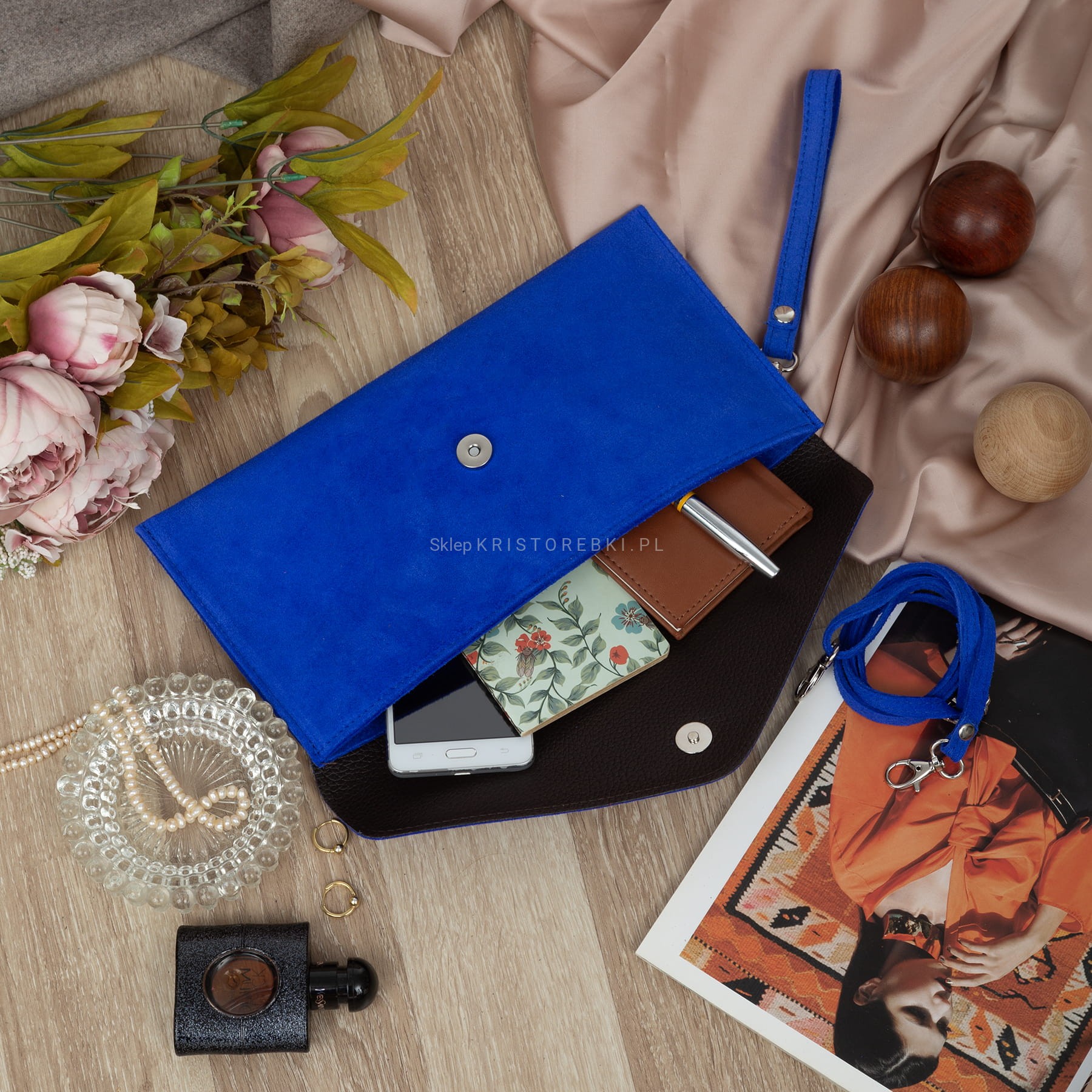 Torebka damska kopertówka znanej i cenionej marki VERA PELLE ITALY w kolorze CHABROWYM. Wykonana została z należytą starannością z wysokiej jakości oraz miękkiej w dotyku i przyjemnie pachnącej włoskiej skóry naturalnej zamszowej. Posiada w zestawie krótki oraz długi, regulowany i odpinany pasek, dzięki czemu możesz nosić ją w ręku, jak również wygodnie na ramieniu. Przednia klapa zamykana jest na magnes a środek wykończony jest estetyczną podszewką i zamykany na suwak. Jak na swój wymiar jest pojemna, bez trudu zmieścisz w niej telefon, portfel i nieduże kosmetyki. Jest elegancka i klasyczna, sprawdzi się zarówno w stylizacji wieczorowej, jak i codziennej.