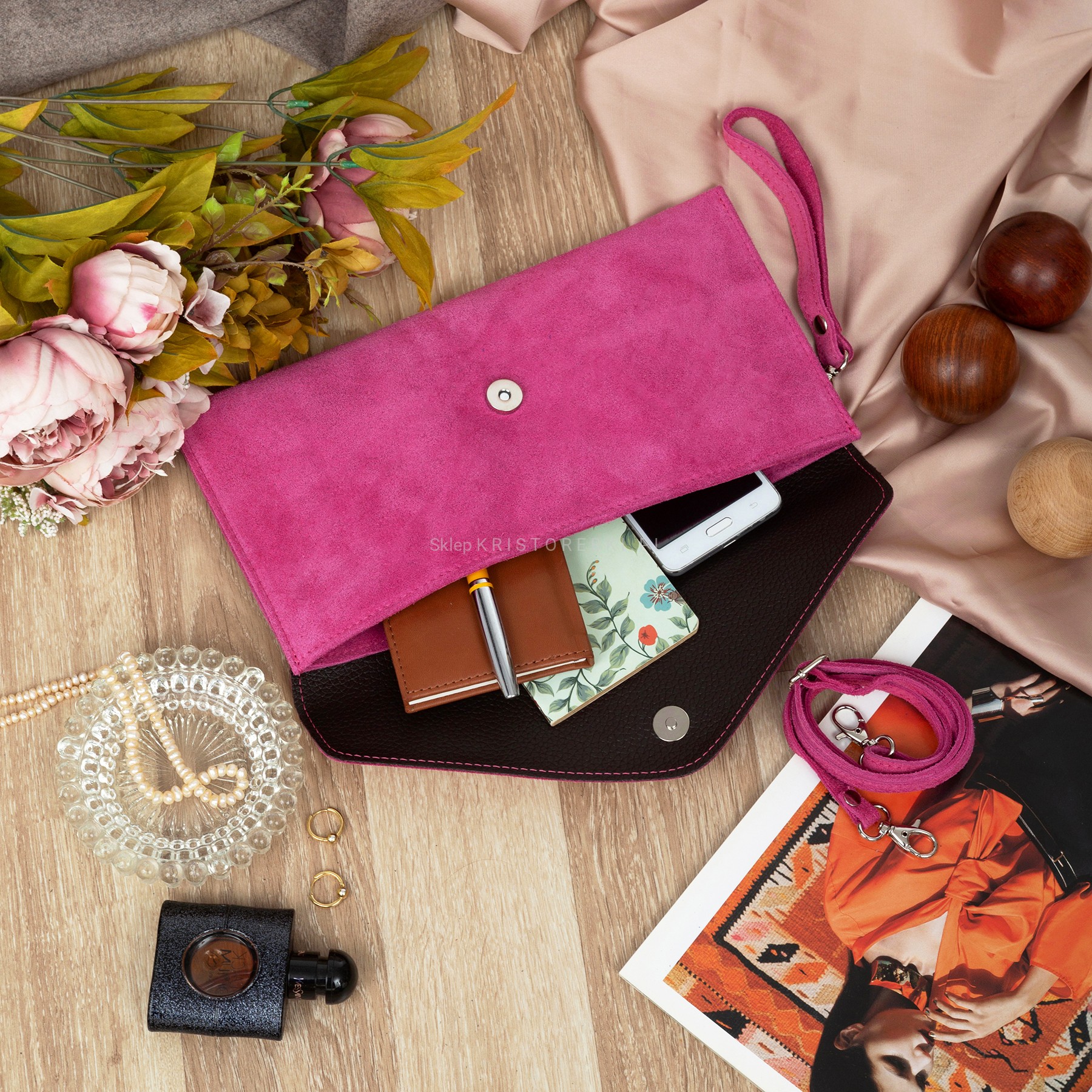 Torebka damska kopertówka znanej i cenionej marki VERA PELLE ITALY w kolorze FUKSJI. Wykonana została z należytą starannością z wysokiej jakości oraz miękkiej w dotyku i przyjemnie pachnącej włoskiej skóry naturalnej zamszowej. Posiada w zestawie krótki oraz długi, regulowany i odpinany pasek, dzięki czemu możesz nosić ją w ręku, jak również wygodnie na ramieniu. Przednia klapa zamykana jest na magnes a środek wykończony jest estetyczną podszewką i zamykany na suwak. Jak na swój wymiar jest pojemna, bez trudu zmieścisz w niej telefon, portfel i nieduże kosmetyki. Jest elegancka i klasyczna, sprawdzi się zarówno w stylizacji wieczorowej, jak i codziennej.