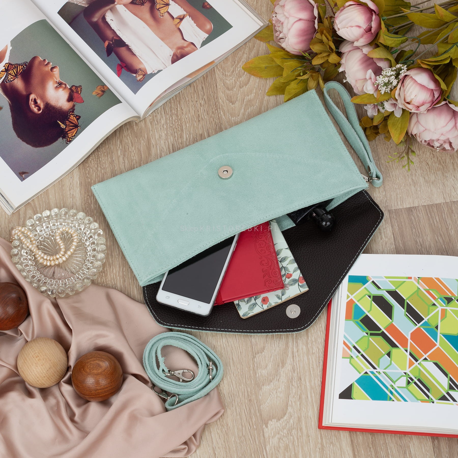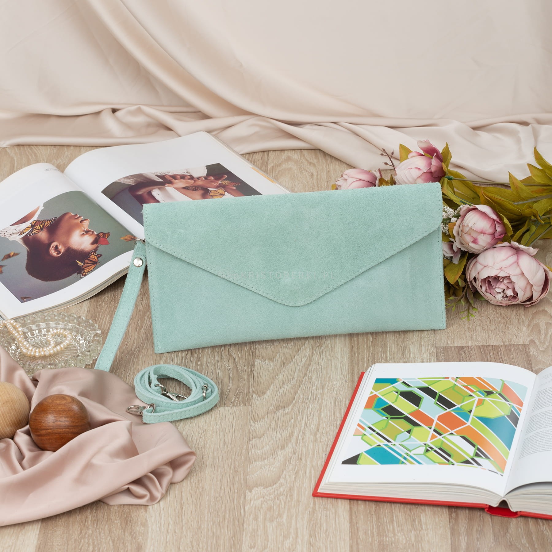 Torebka damska kopertówka znanej i cenionej marki VERA PELLE ITALY w kolorze JASNEJ ZIELENI. Wykonana została z należytą starannością z wysokiej jakości oraz miękkiej w dotyku i przyjemnie pachnącej włoskiej skóry naturalnej zamszowej. Posiada w zestawie krótki oraz długi, regulowany i odpinany pasek, dzięki czemu możesz nosić ją w ręku, jak również wygodnie na ramieniu. Przednia klapa zamykana jest na magnes a środek wykończony jest estetyczną podszewką i zamykany na suwak. Jak na swój wymiar jest pojemna, bez trudu zmieścisz w niej telefon, portfel i nieduże kosmetyki. Jest elegancka i klasyczna, sprawdzi się zarówno w stylizacji wieczorowej, jak i codziennej.