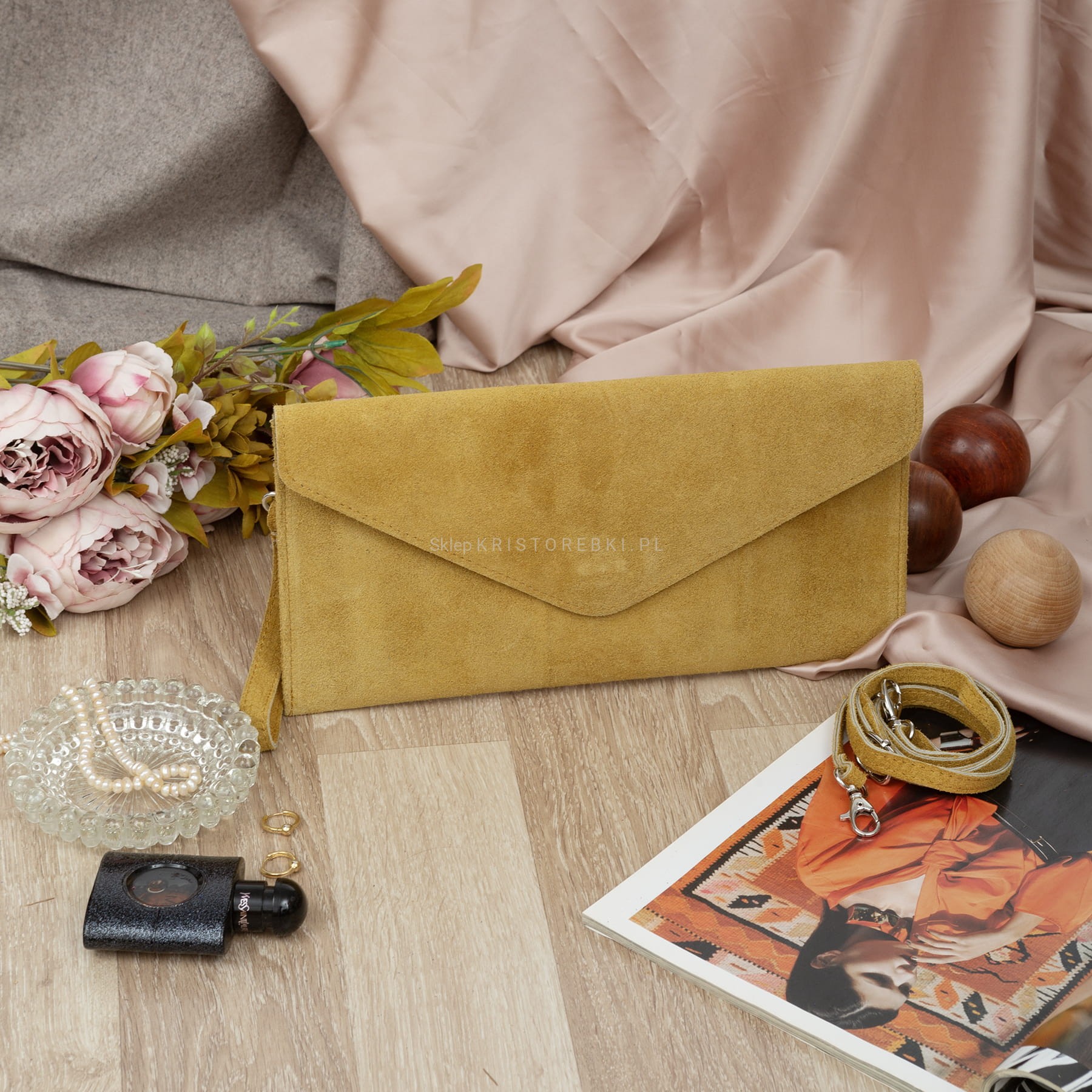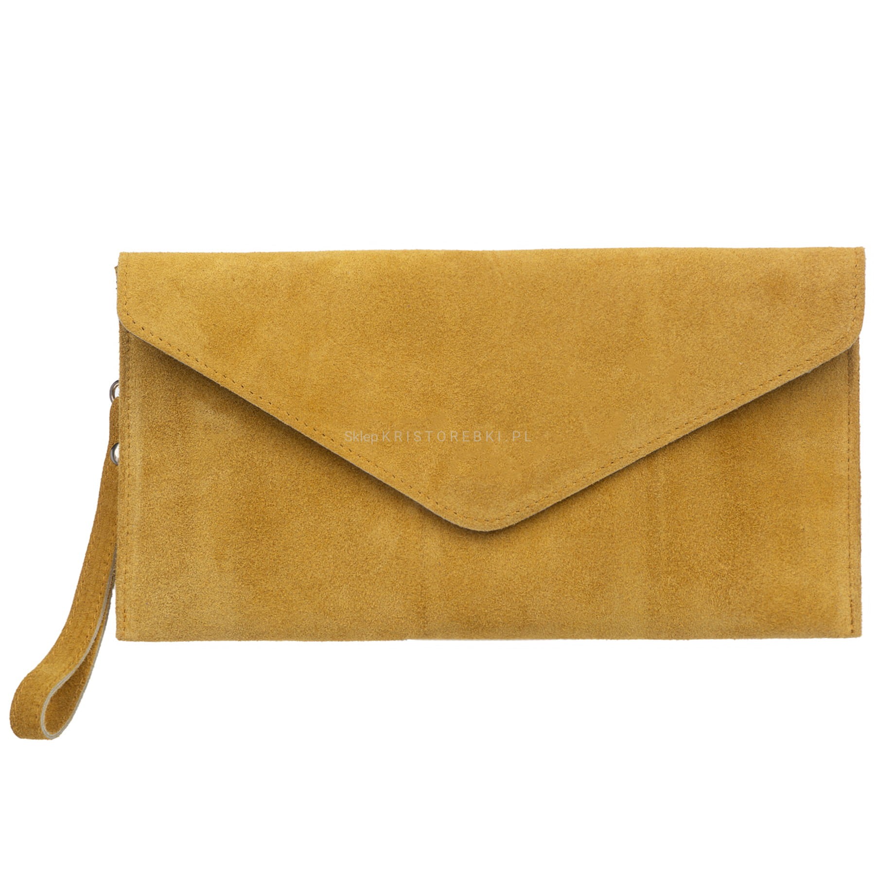 VERA PELLE torebka damska zamszowa kopertówka listonoszka z paskiem na ramię V646 musztardowa