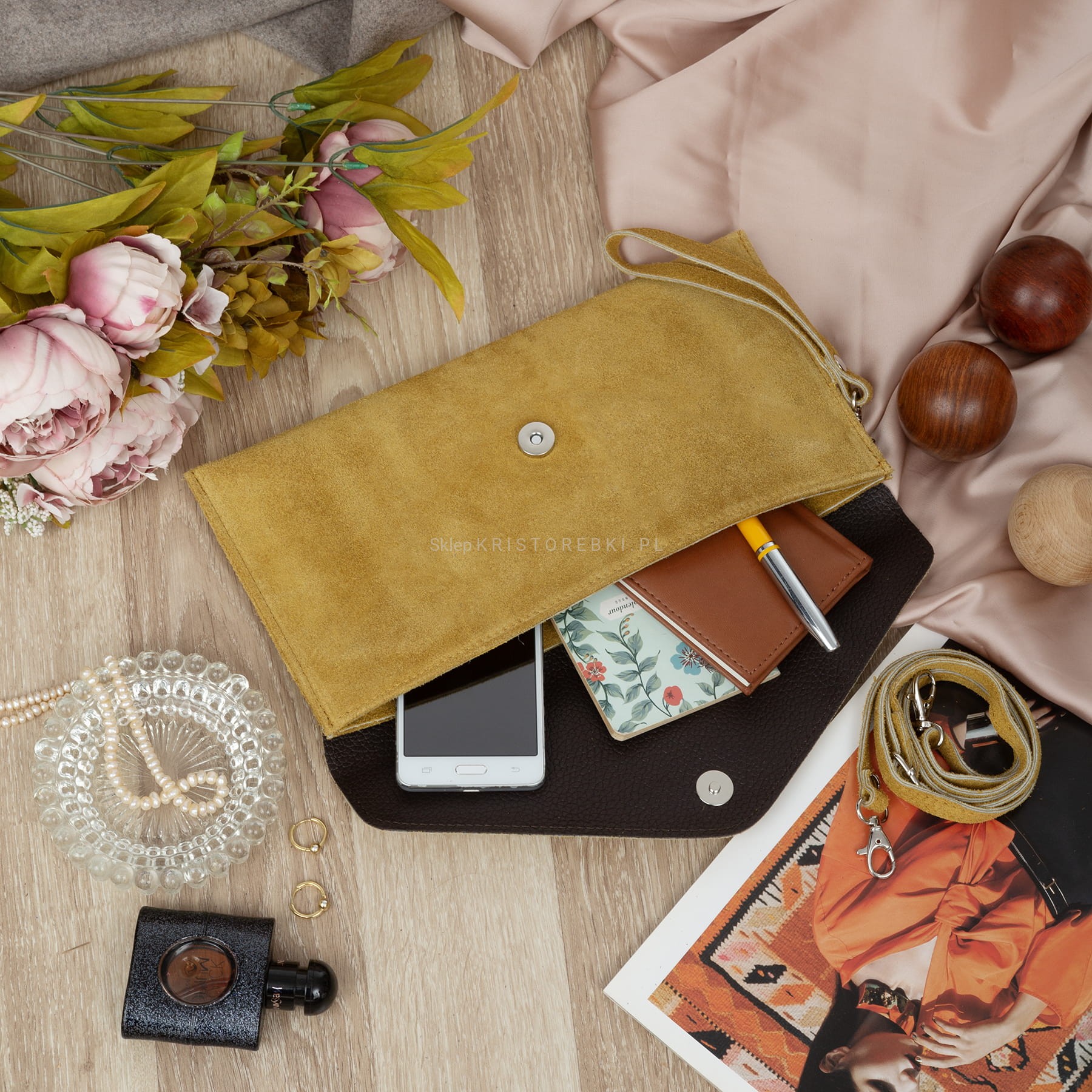 Torebka damska kopertówka znanej i cenionej marki VERA PELLE ITALY w kolorze MUSZTARDOWYM. Wykonana została z należytą starannością z wysokiej jakości oraz miękkiej w dotyku i przyjemnie pachnącej włoskiej skóry naturalnej zamszowej. Posiada w zestawie krótki oraz długi, regulowany i odpinany pasek, dzięki czemu możesz nosić ją w ręku, jak również wygodnie na ramieniu. Przednia klapa zamykana jest na magnes a środek wykończony jest estetyczną podszewką i zamykany na suwak. Jak na swój wymiar jest pojemna, bez trudu zmieścisz w niej telefon, portfel i nieduże kosmetyki. Jest elegancka i klasyczna, sprawdzi się zarówno w stylizacji wieczorowej, jak i codziennej.